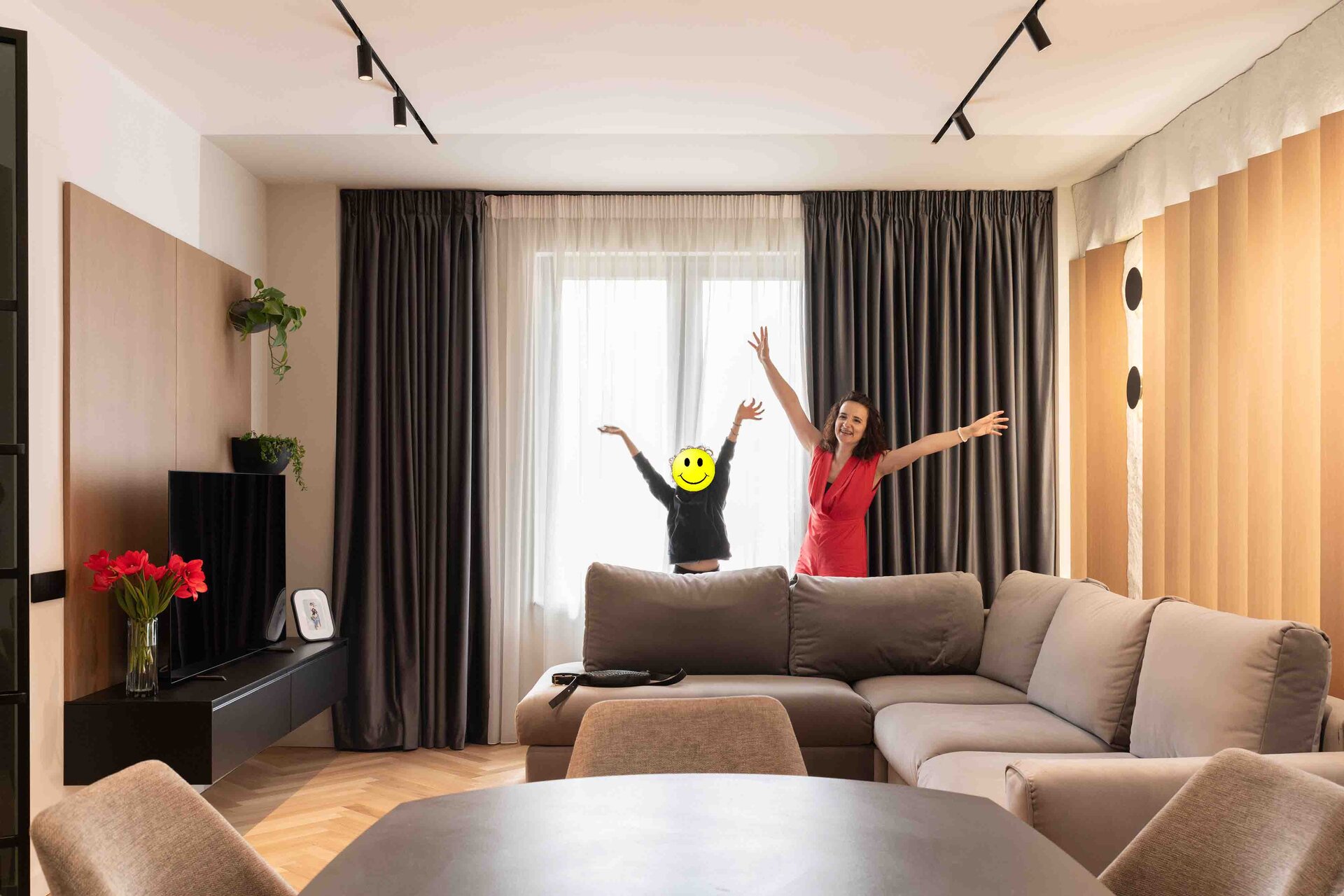 The modular sofa, in a neutral shade, creates a natural dialogue with the anthracite grey drapes, shaping an elegant yet warm and comfortable atmosphere.