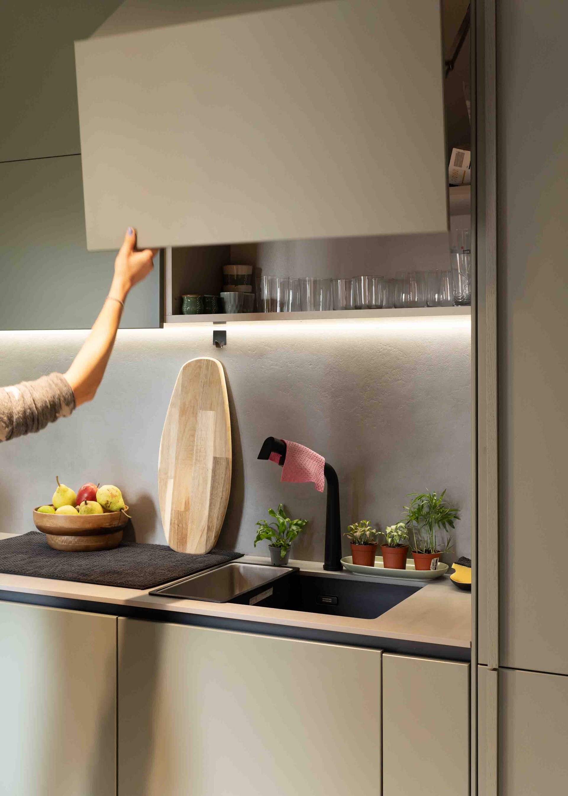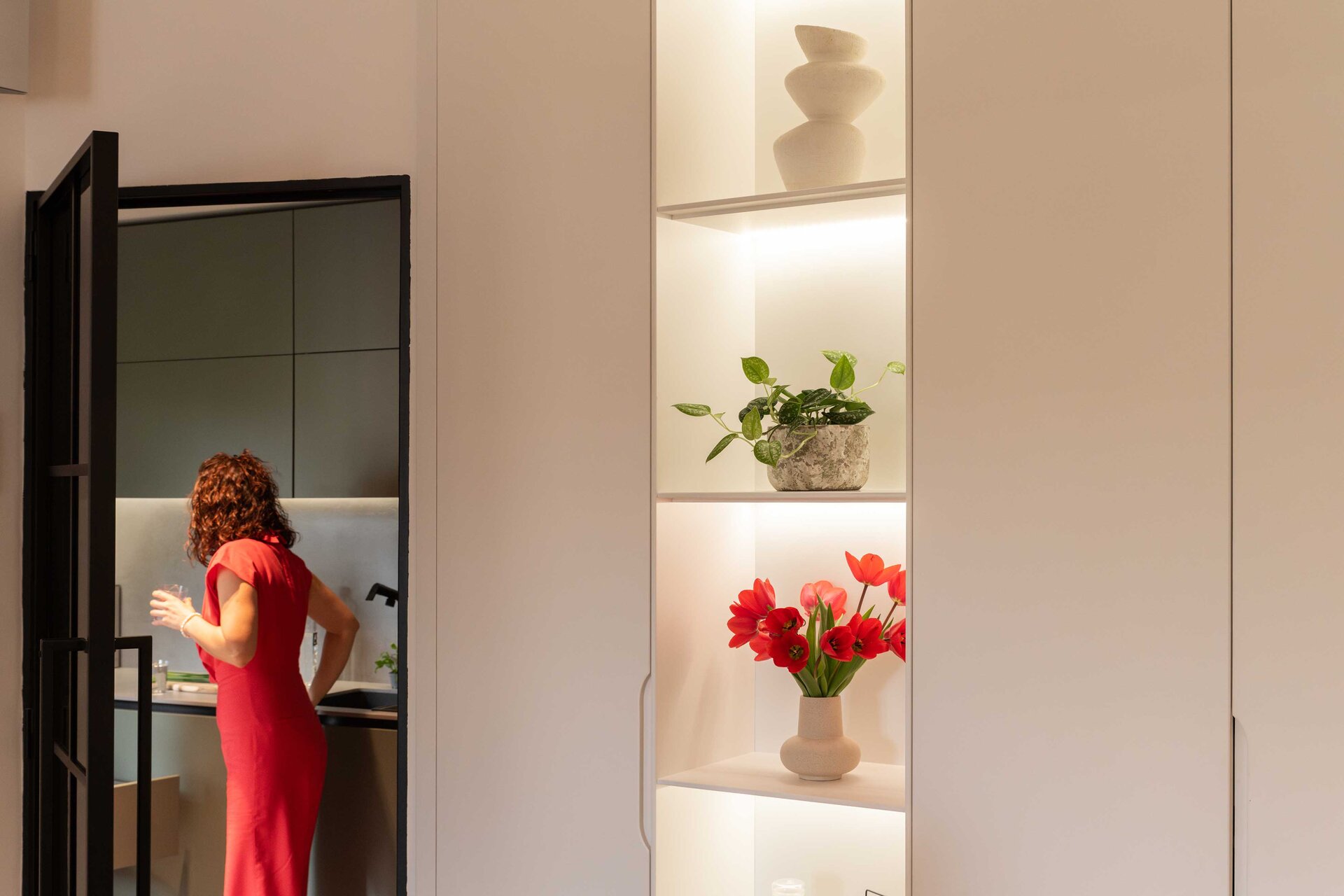 The compact kitchen exemplifies empathetic minimalism, where functionality is complemented by sincere attention to detail. Matte finishes in a palette of tactile hues create a calm, balanced atmosphere. Subtle ambient lighting, integrated under the upper cabinets, adds visual depth while highlighting the wall’s texture and the clarity of the design lines.