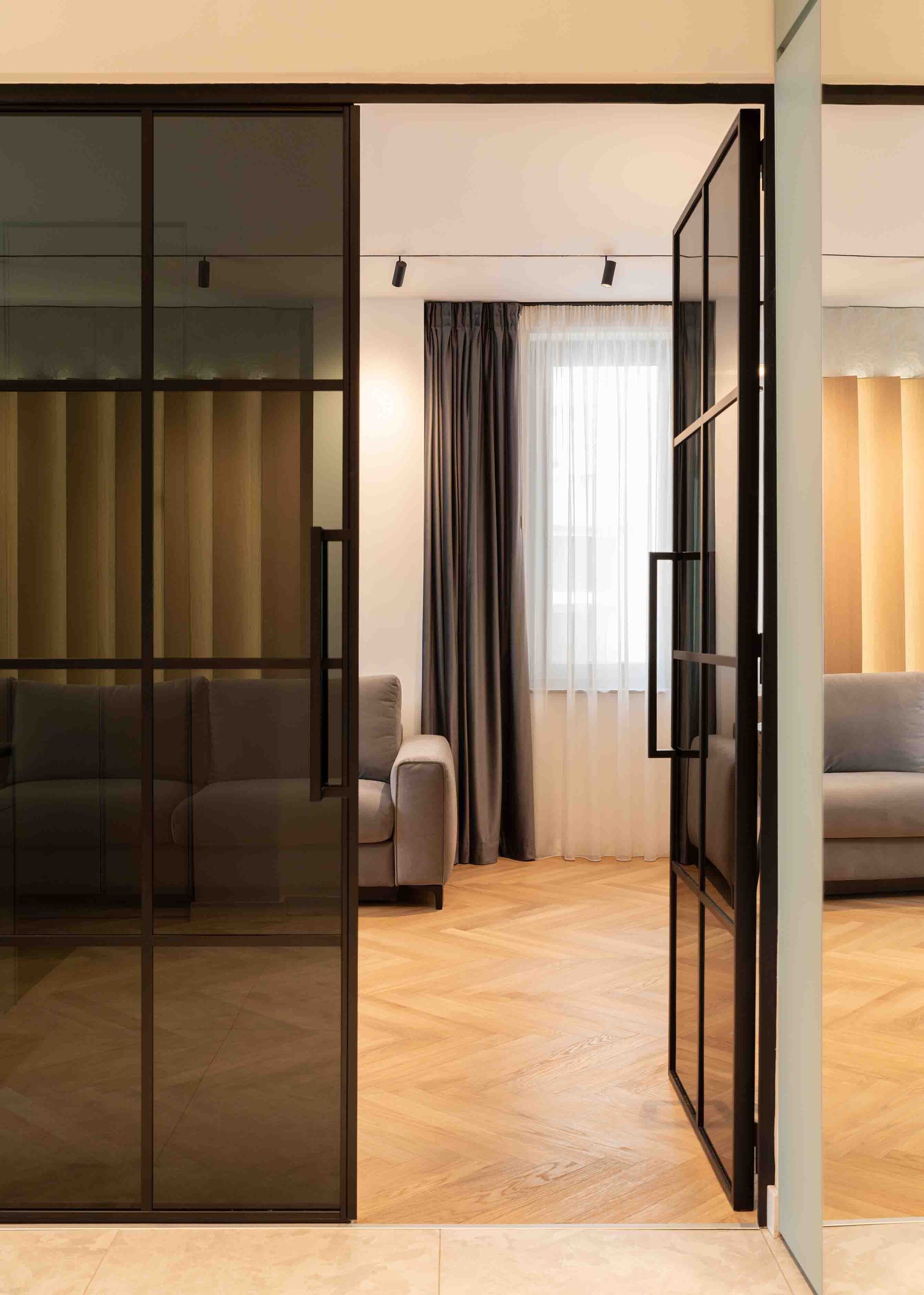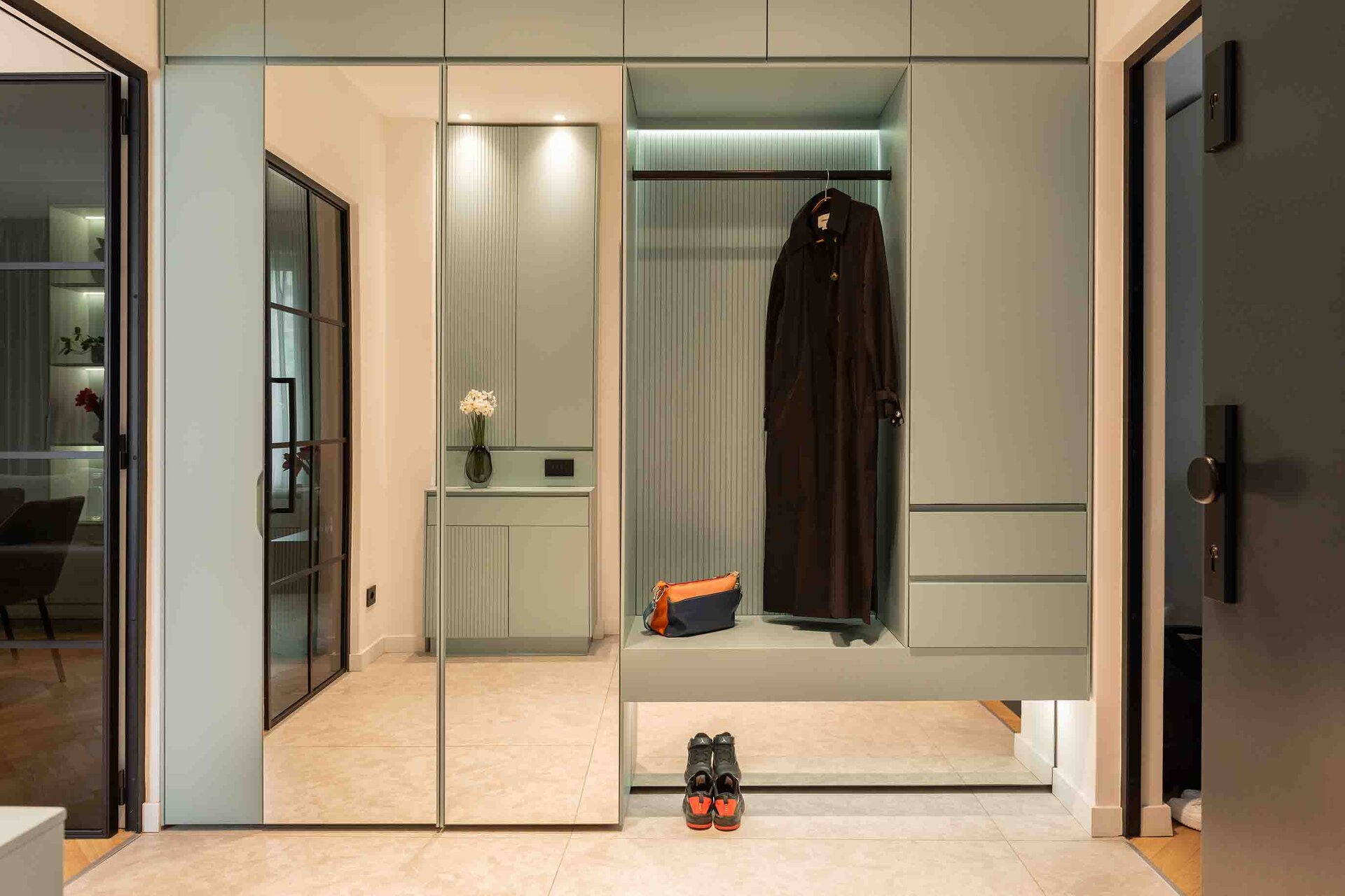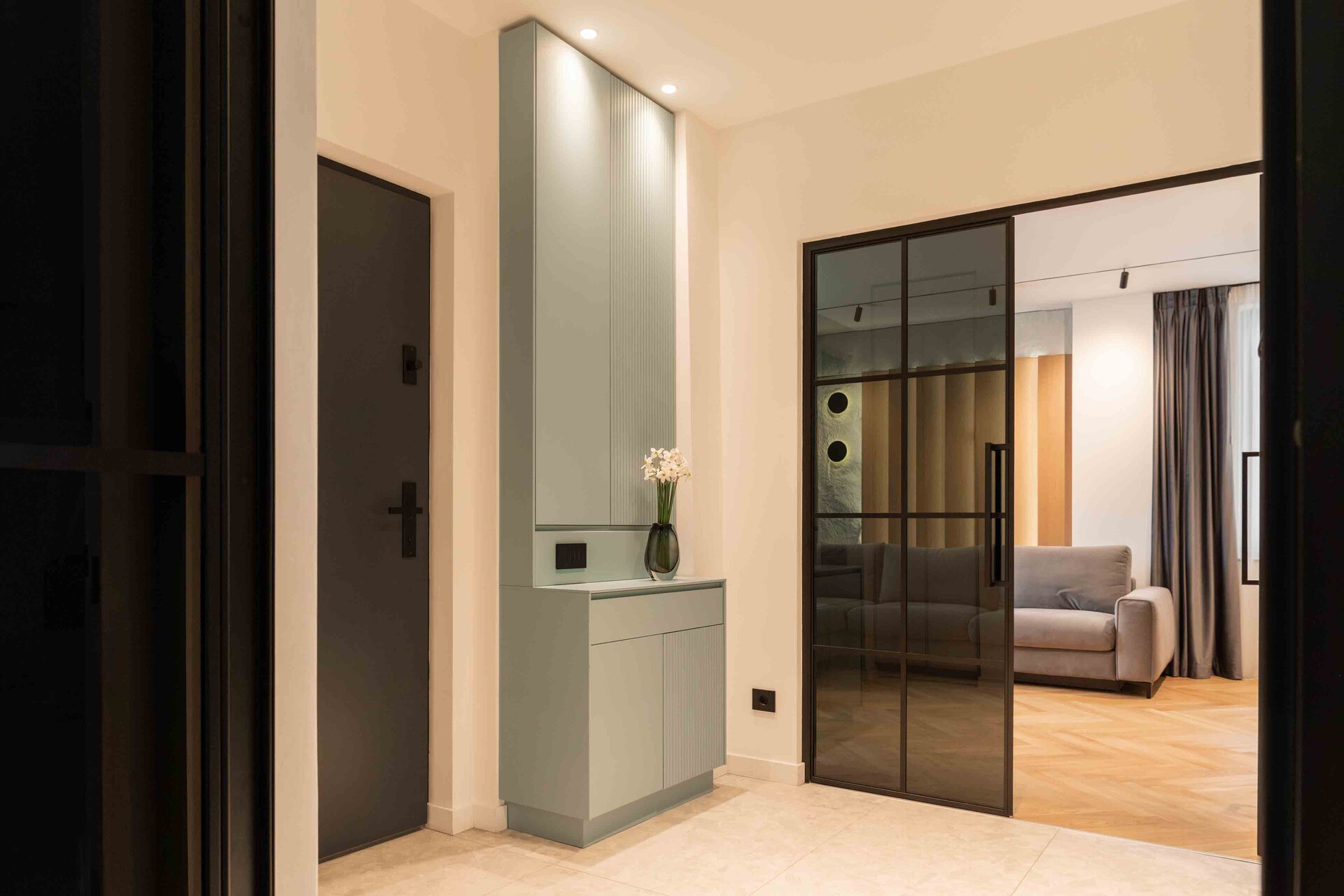 The entry hall maintains the same warm simplicity and understated elegance through matte surfaces, fine slatted details, and integrated furniture in pale tones. Sliding doors with frosted glazing and a metal frame introduce a touch of industrial refinement without disrupting the coherence of the composition.