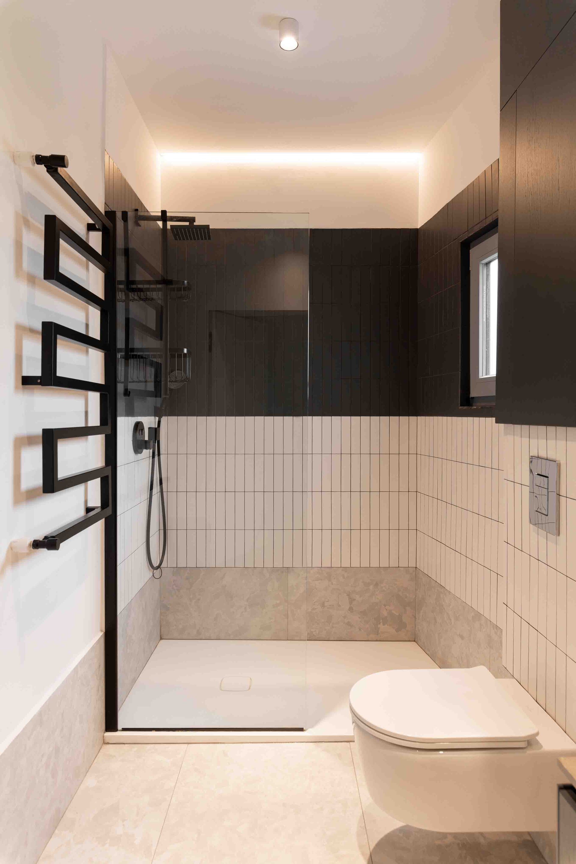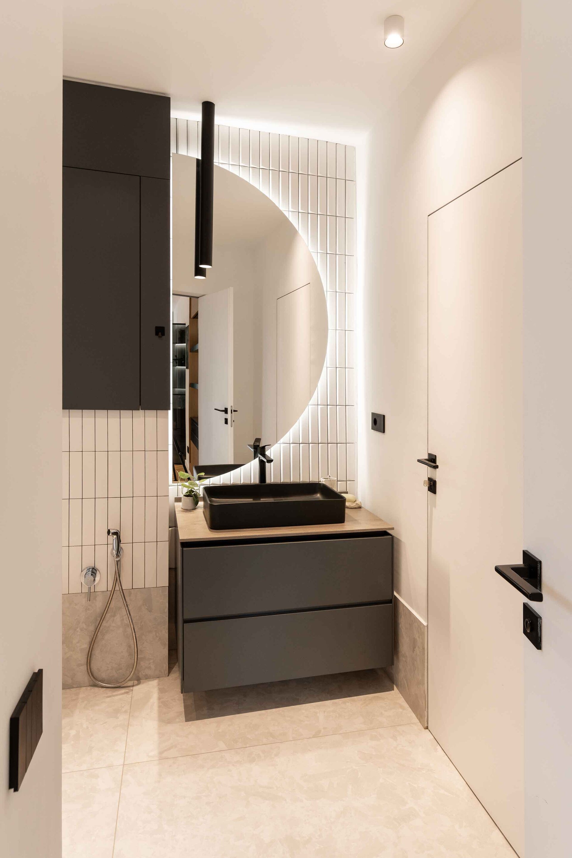 The bathrooms reflect the same coherent, refined approach, each space treated with meticulous attention to texture, light, and proportion. The first bathroom relies on a sophisticated contrast between matte graphite surfaces, a sculptural black basin, and a background of vertically arranged white tiles with subtle rhythm. The composition conveys a strong, sober character, suggesting a masculine presence in the balanced space.