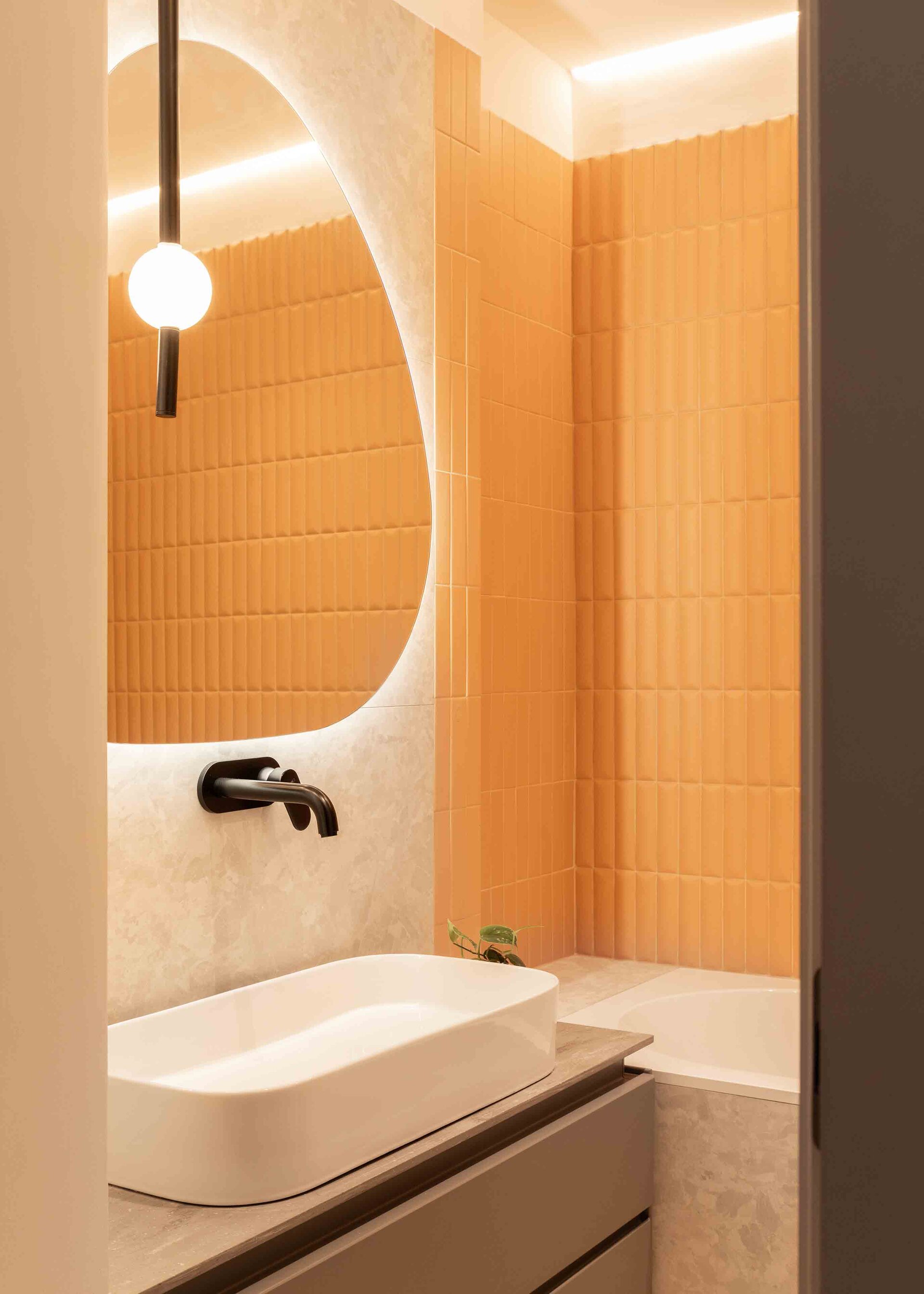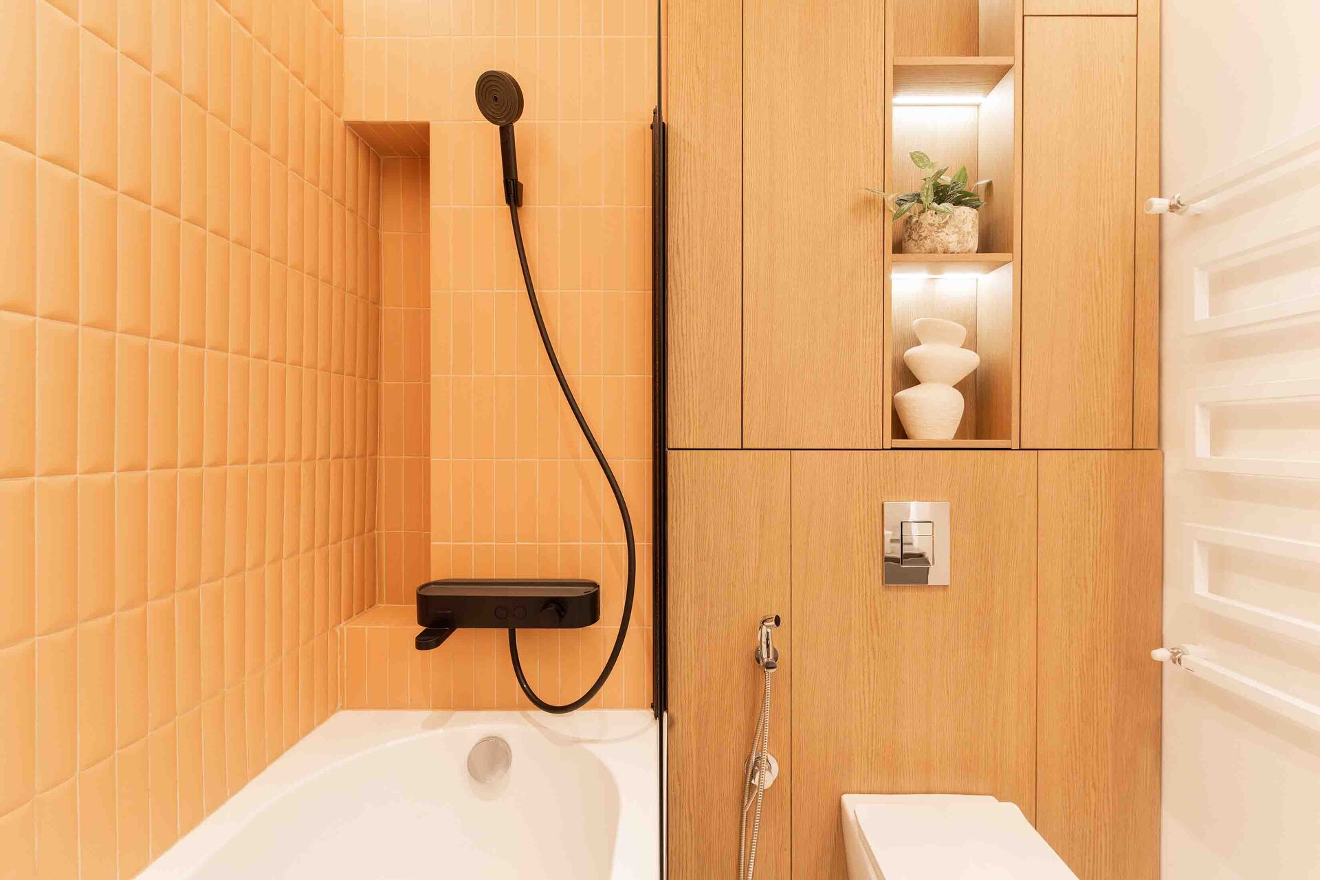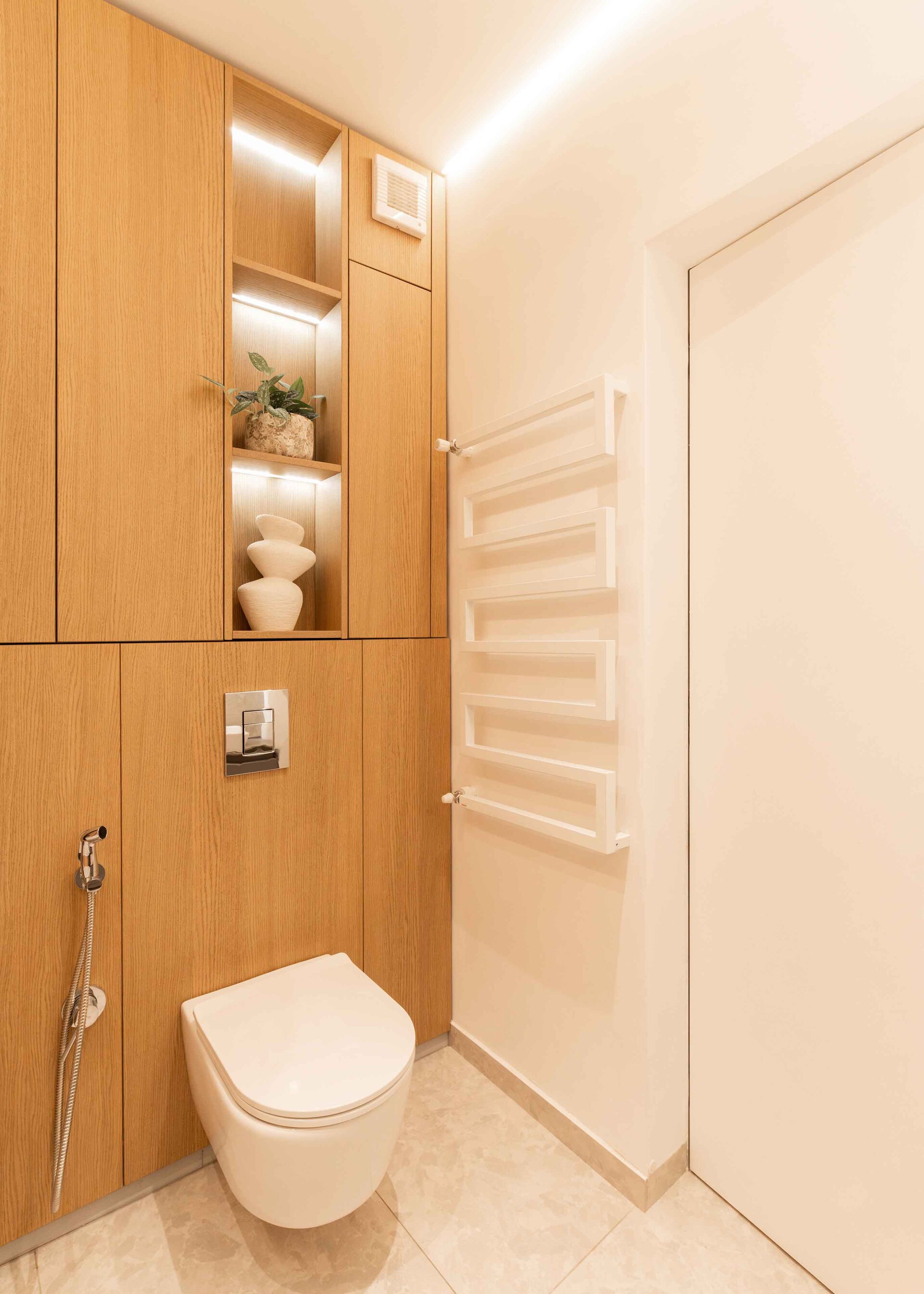 The second bathroom stands out through a warmer color palette and more organic shapes, with fine details that add a subtle feminine touch. Natural wood, used around the toilet area and in the built-in furniture, contributes to a warm, orderly atmosphere while maintaining a sophisticated aesthetic.