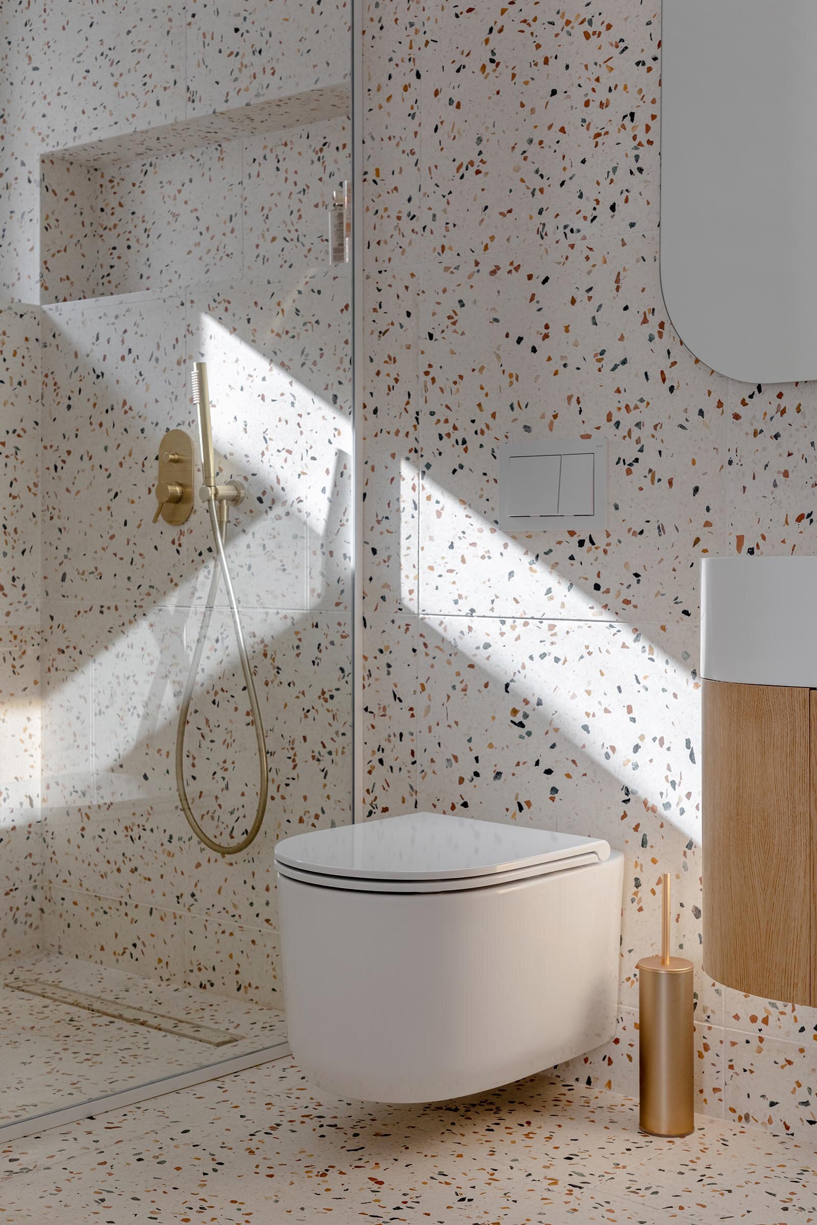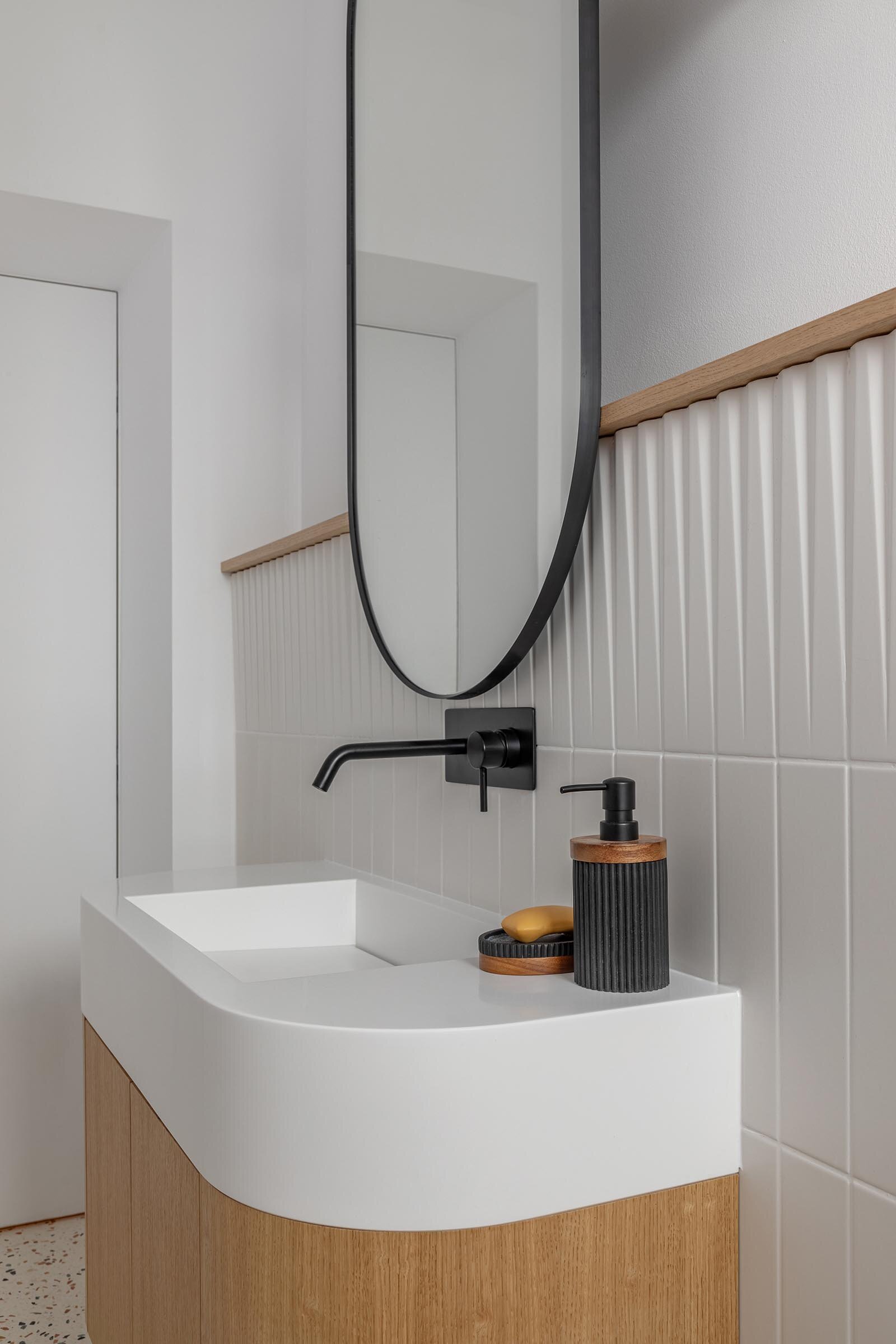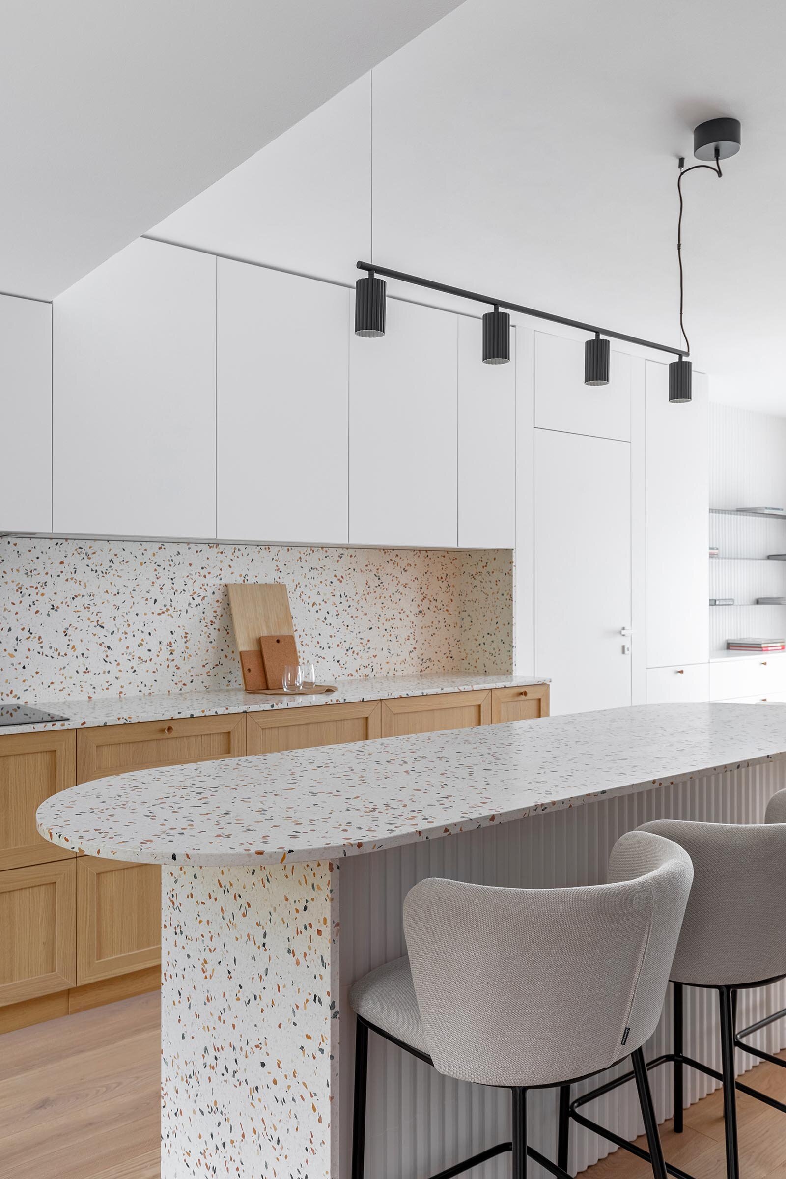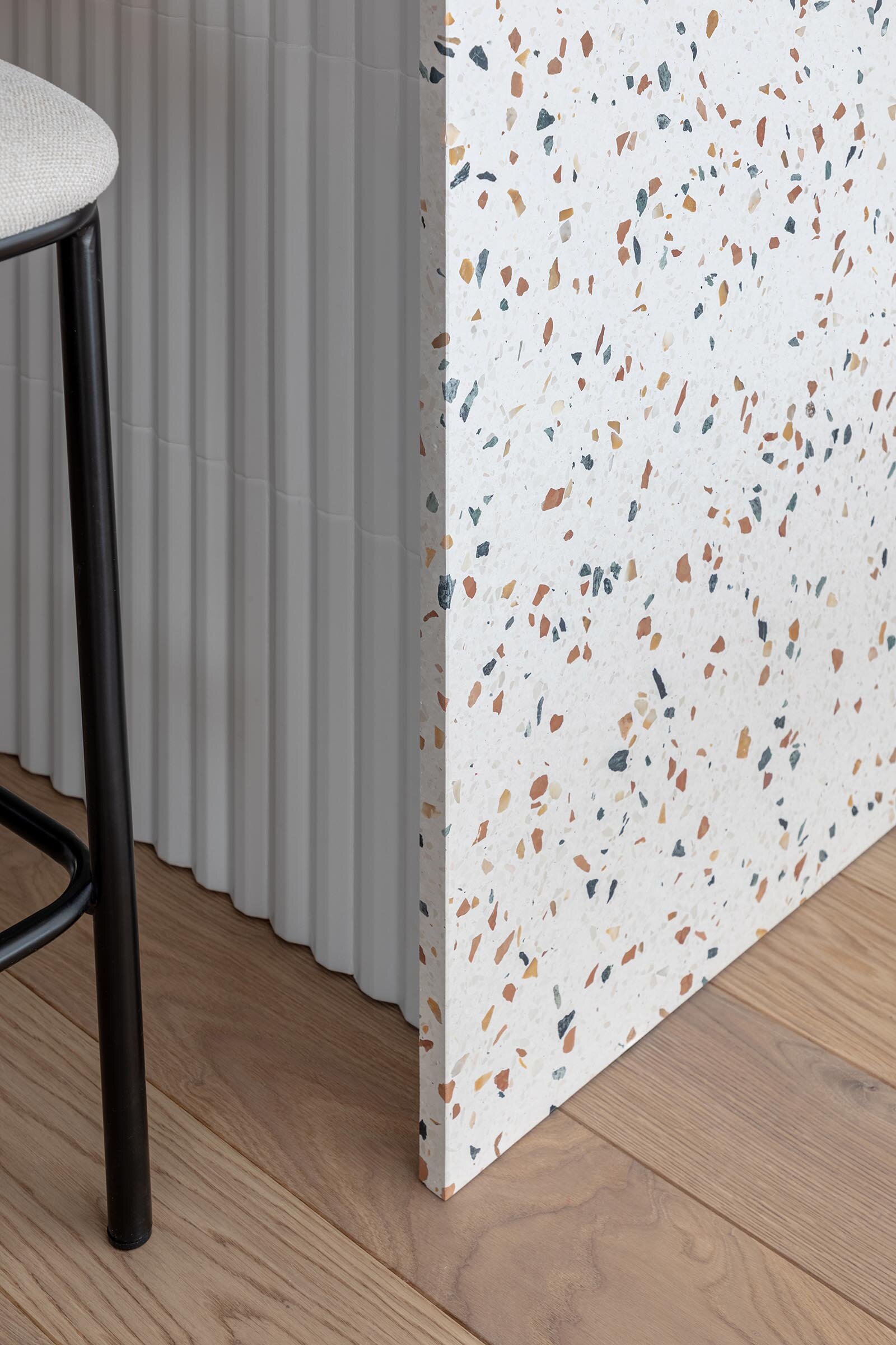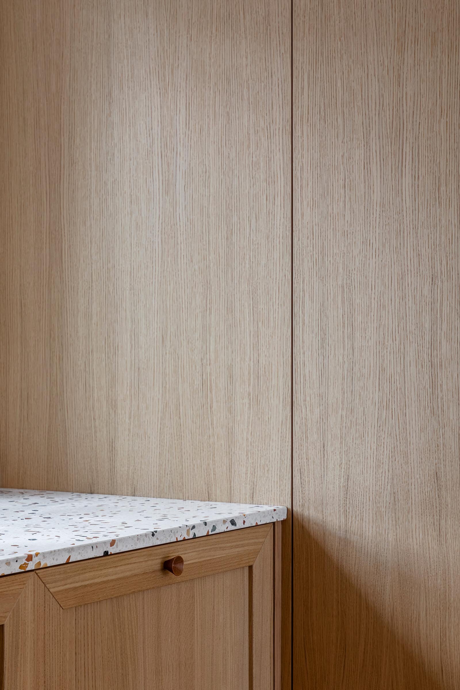 The beauty of this space is born from the carefully selected variety of materials. Oak wood defines the main surfaces, providing a warm and pleasant backdrop. Alongside it, Terrazzo finishes bring a natural, subtly textured contrast that balances the ensemble and adds a note of visual diversity. Together, these materials compose a tactile and visual experience, in which each element is revealed through light.