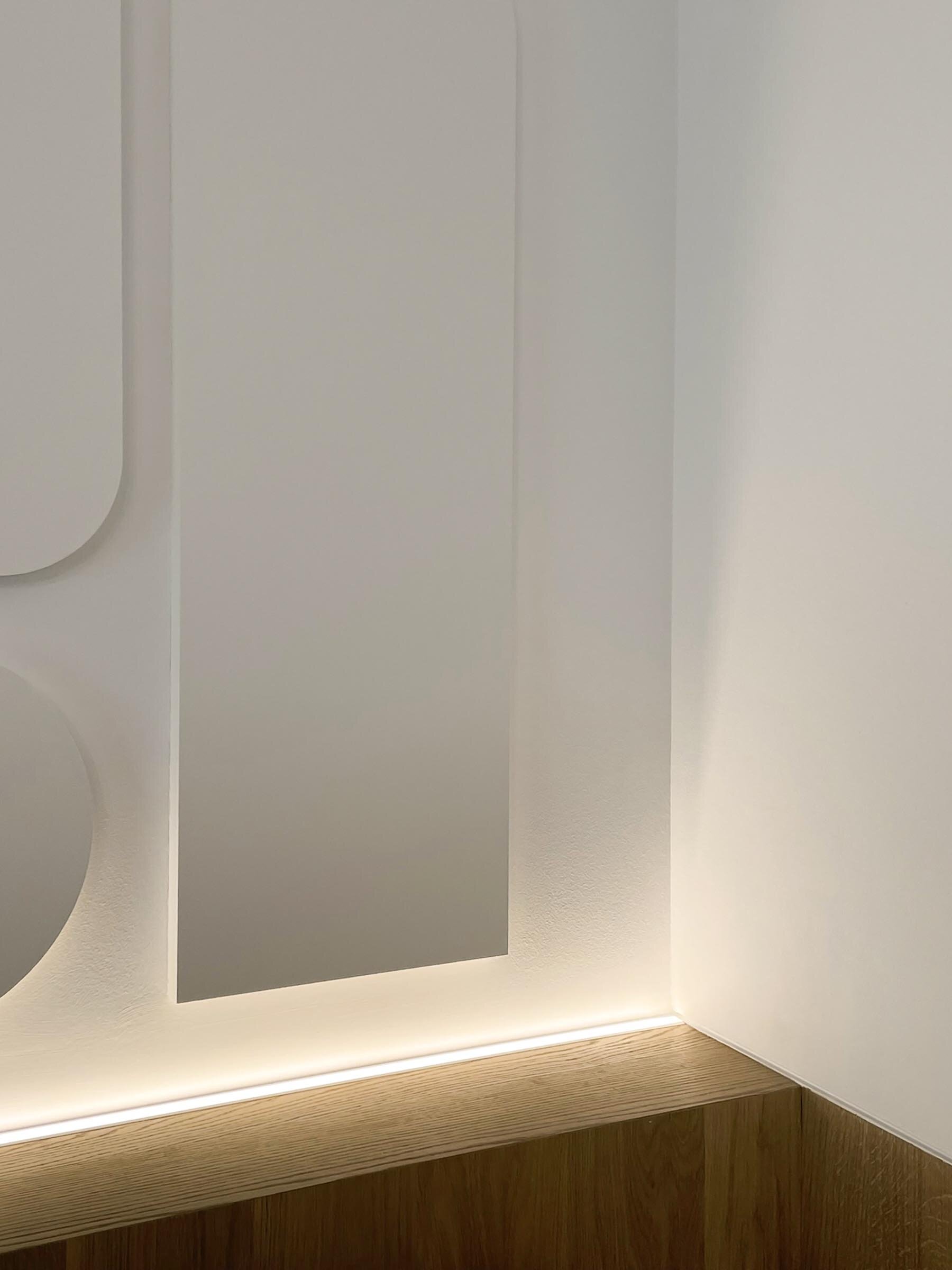 Light, whether natural or artificial, is treated as a fundamental element in shaping both atmosphere and spatial perception. It interacts directly with the materials, enhancing their texture as well as the proportions of each room. Each light source is deliberately placed to emphasize key areas and to contribute to a balanced ambiance. The lighting design supports a coherent and visually legible space where forms and materials become more expressive and easy to read.