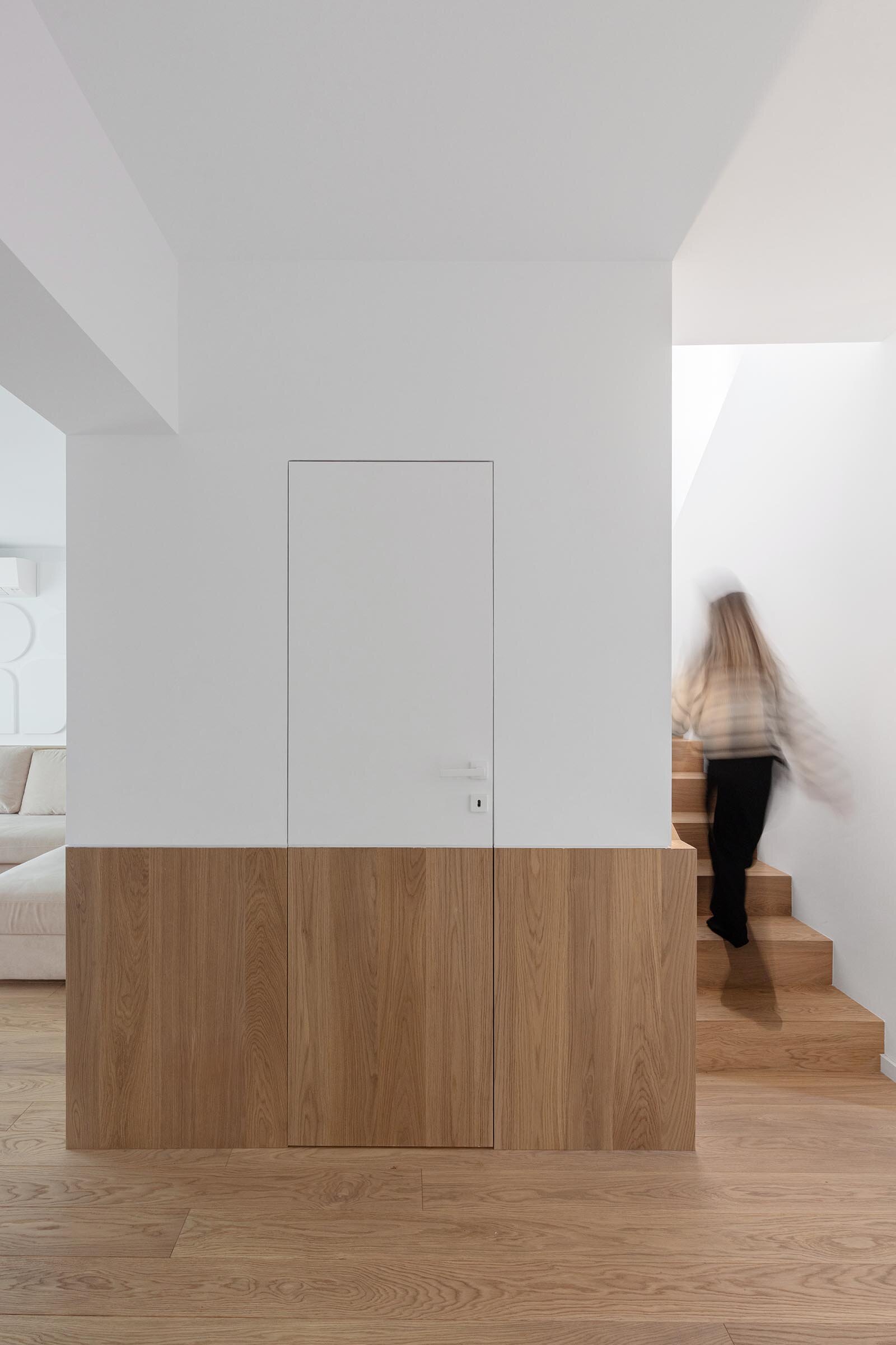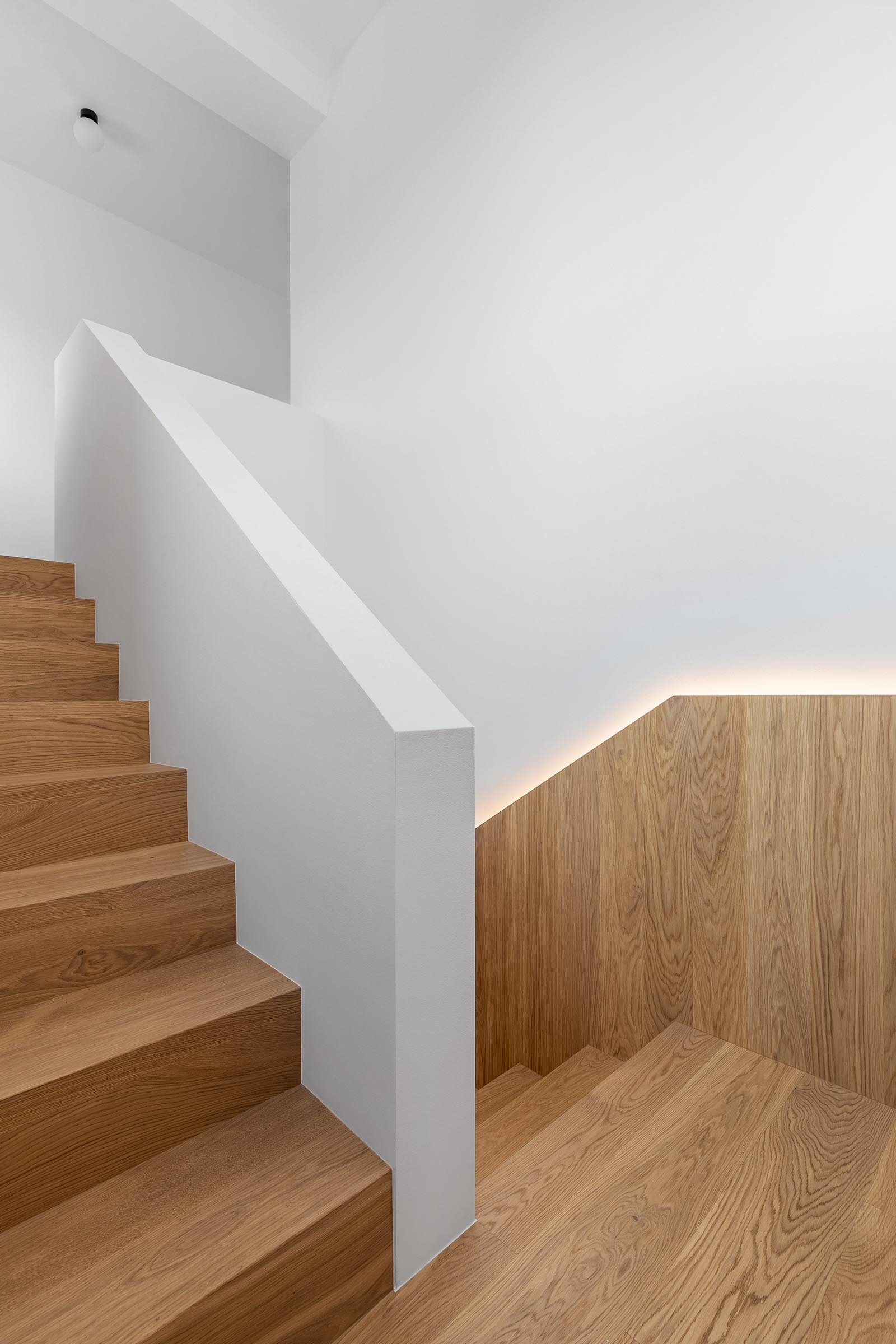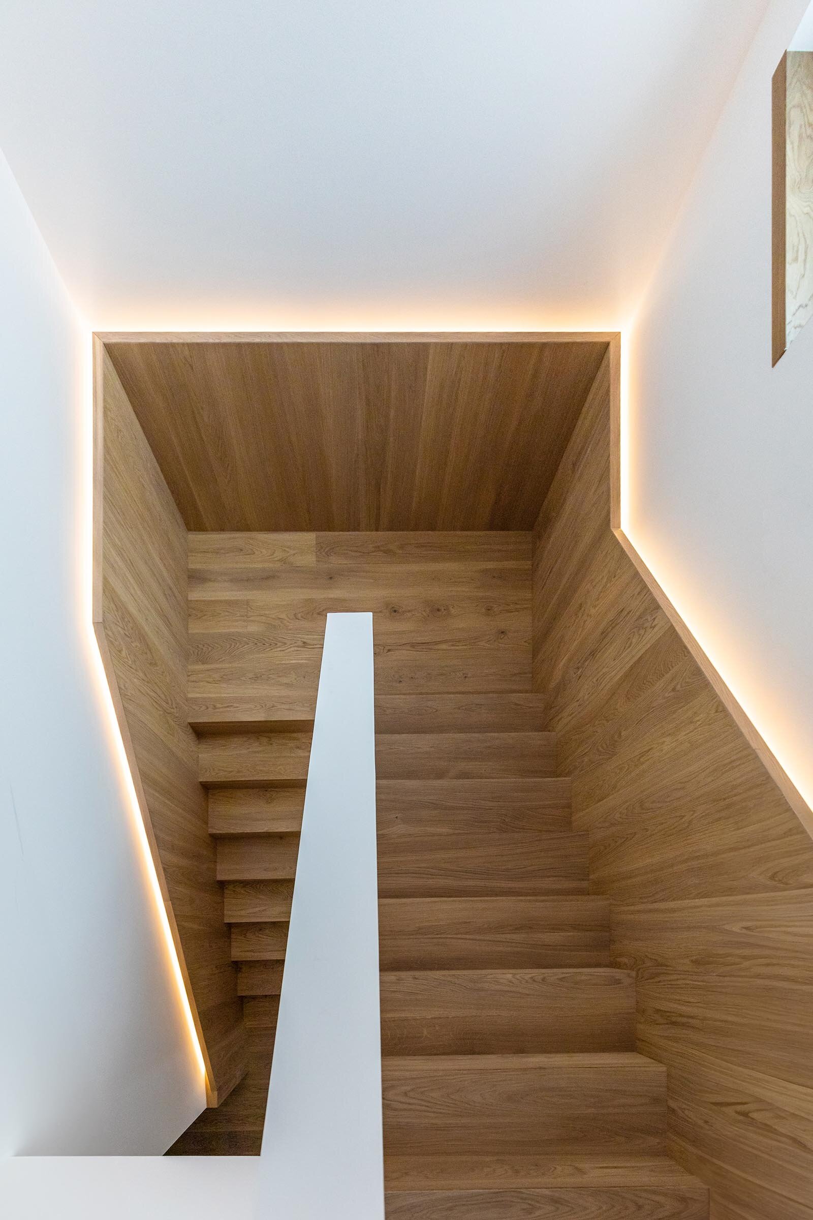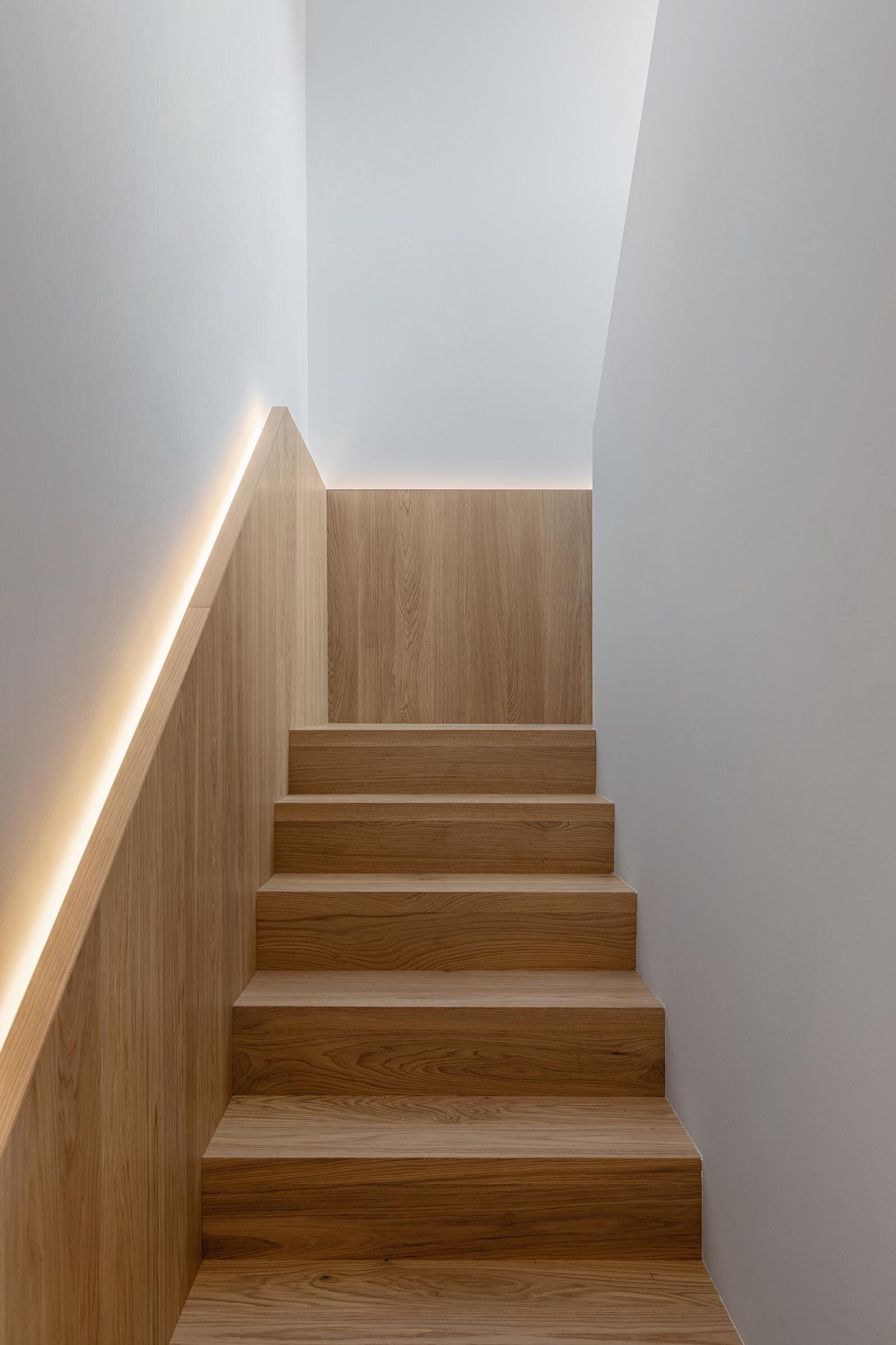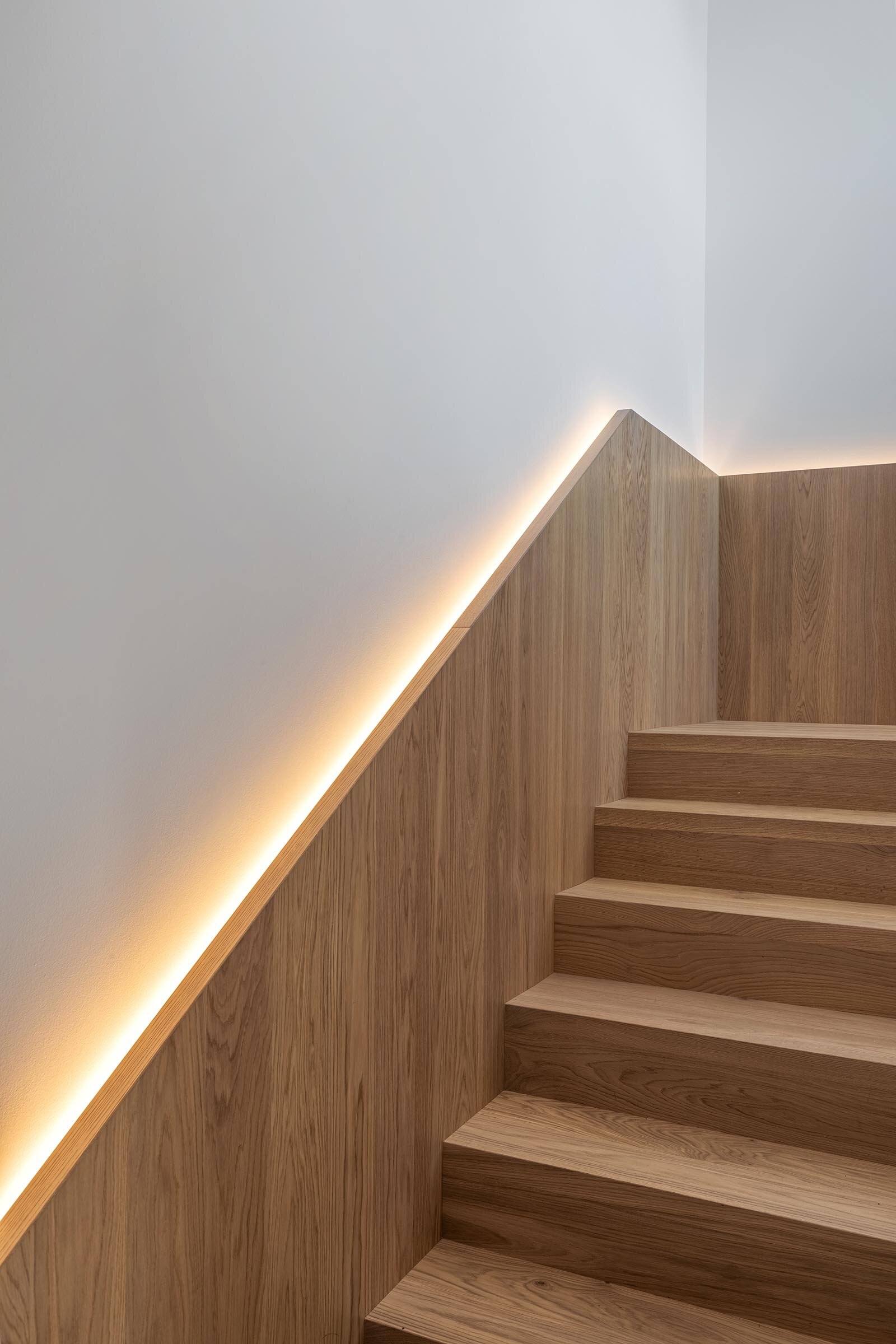 Special attention is given to the interior staircase, transformed into both a functional and visual element. The wood cladding gives it sculptural presence, while the continuous handrail, subtly highlighted by a hidden LED strip, creates a warm guiding line between floors.