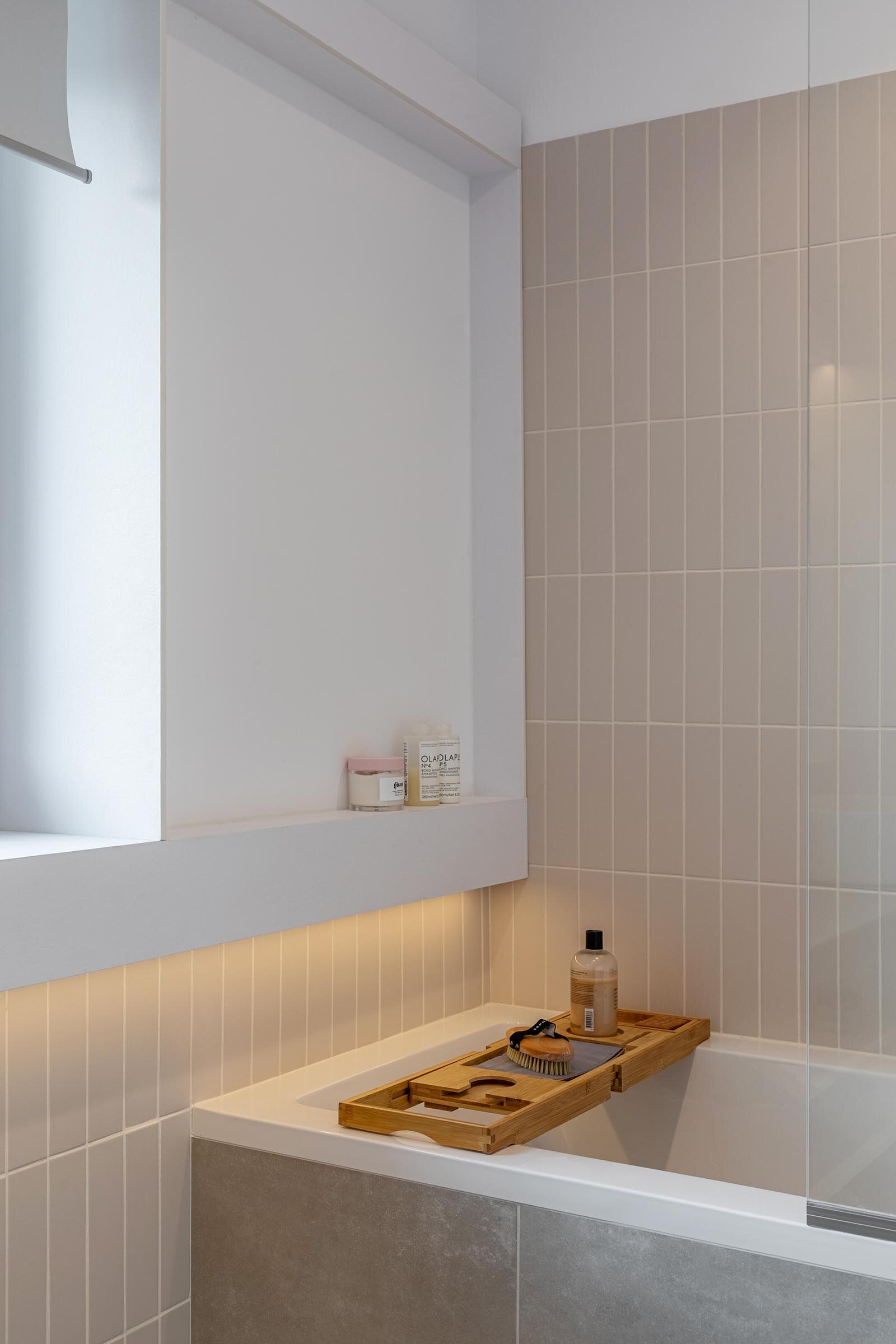 The furniture pieces do not disrupt the compositional calm, but rather integrate thoughtfully within it. Each item is carefully selected to match the already established materiality and color palette, contributing to a familiar, warm atmosphere where one can feel at home.