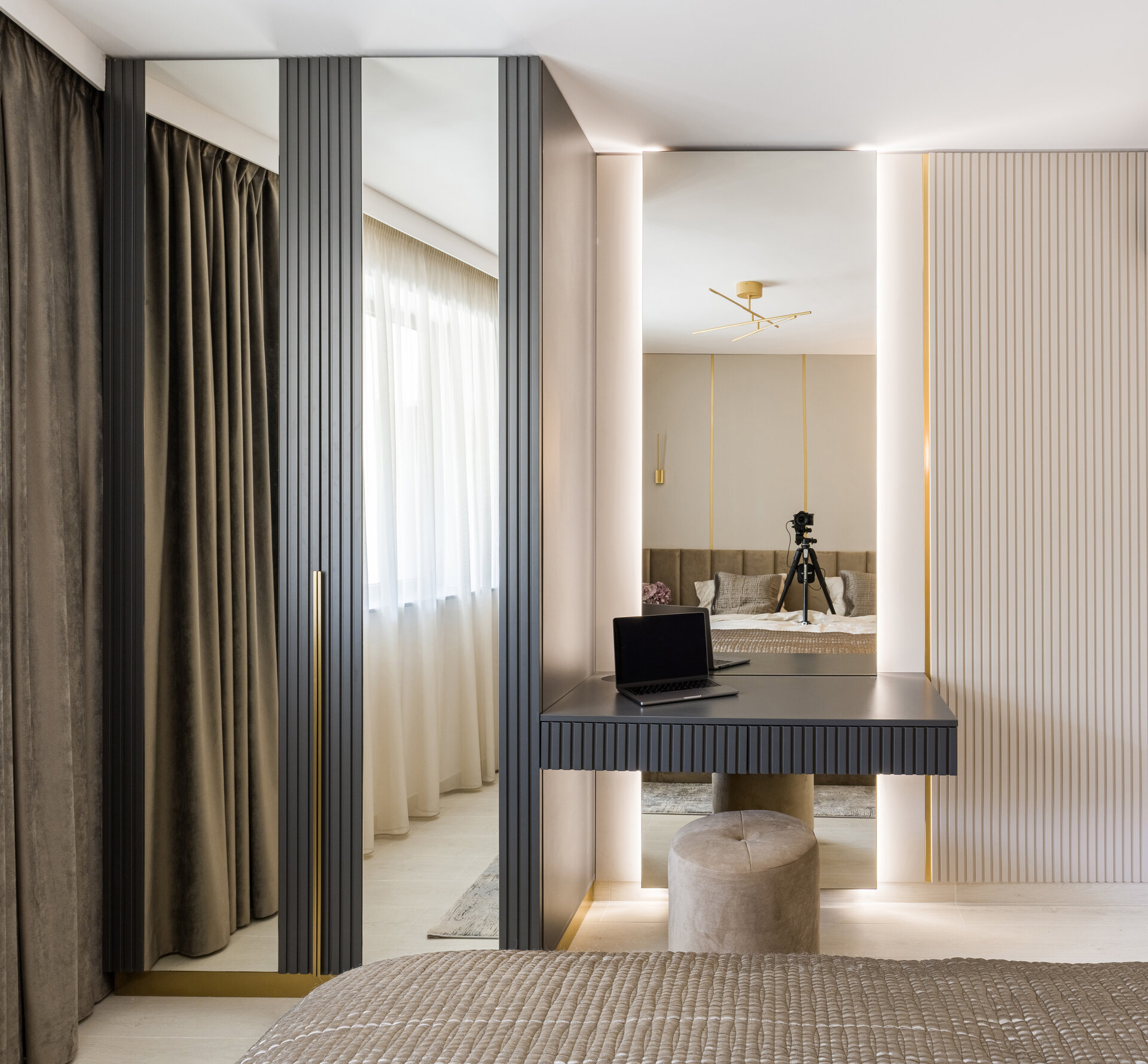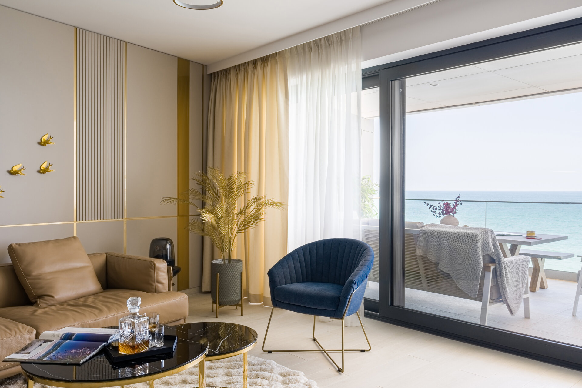 We made the most of the natural light that seems to flood both the living area and the bedrooms, highlighting the shine of metallic accents and the fine textures used.