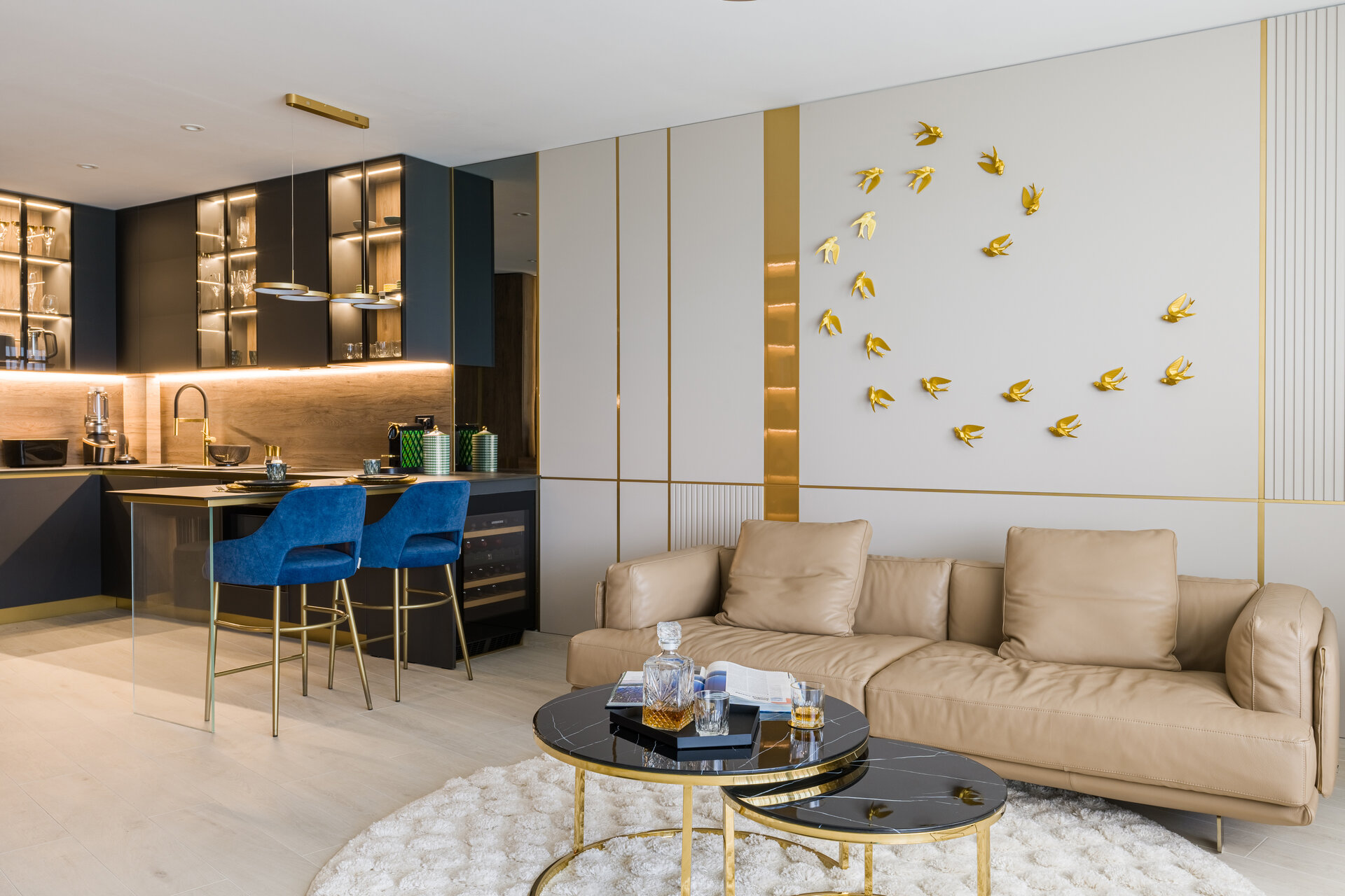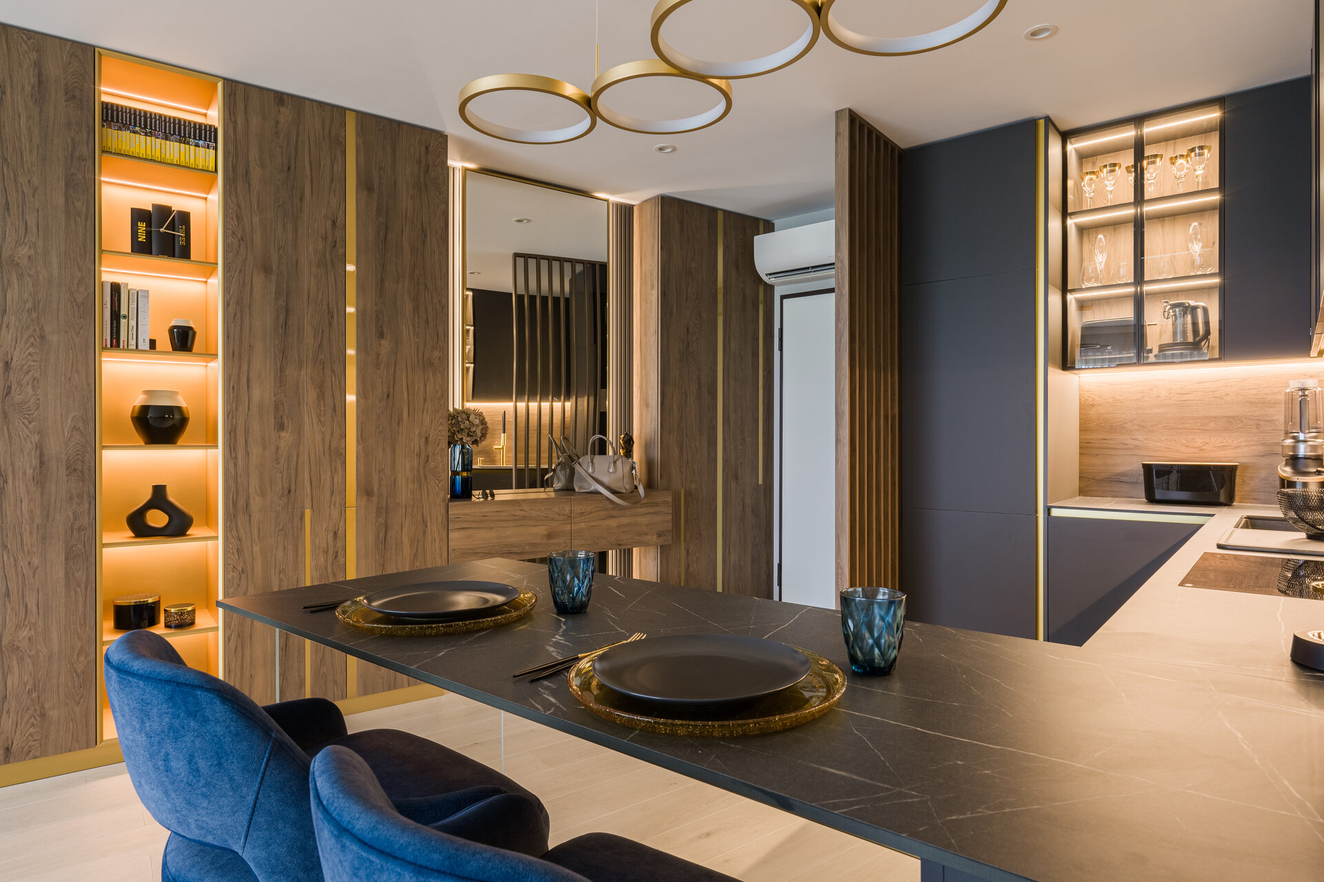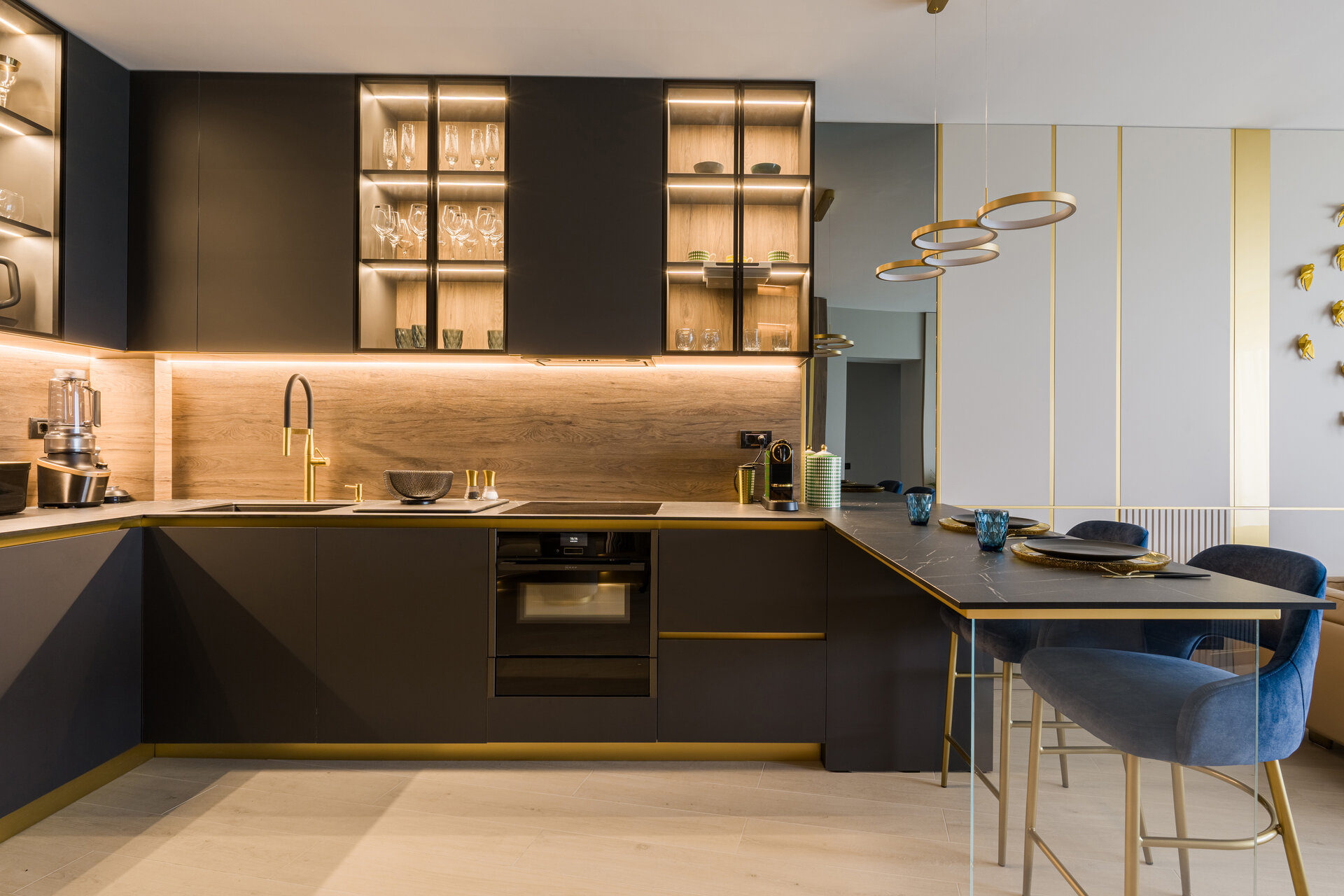 The elegance of the kitchen comes from the dark colors, subtle details, and high-quality materials used in the design of the furniture, all emphasized by the ambient lighting system. The golden accents found throughout the apartment enhance the overall sense of luxury.