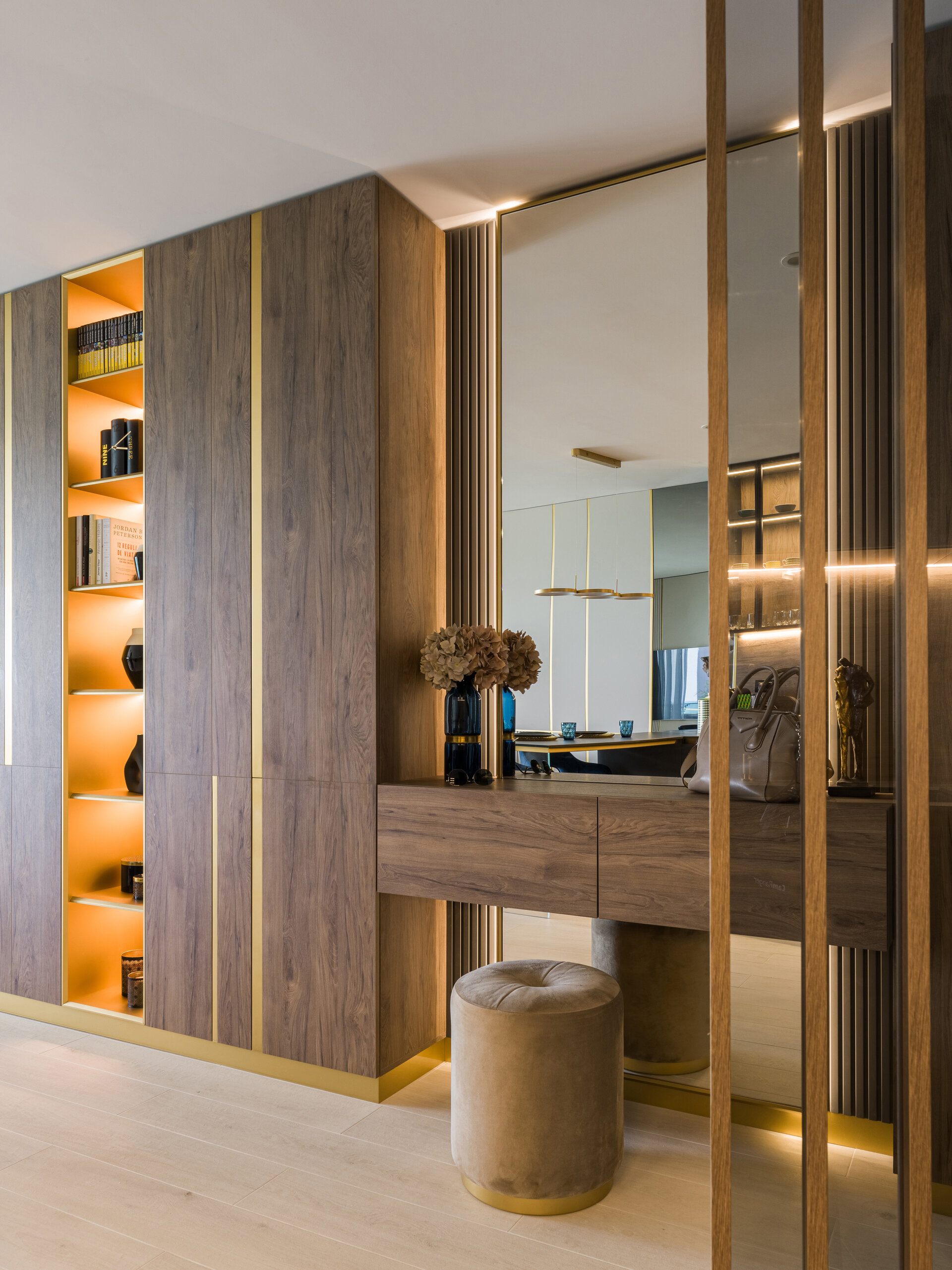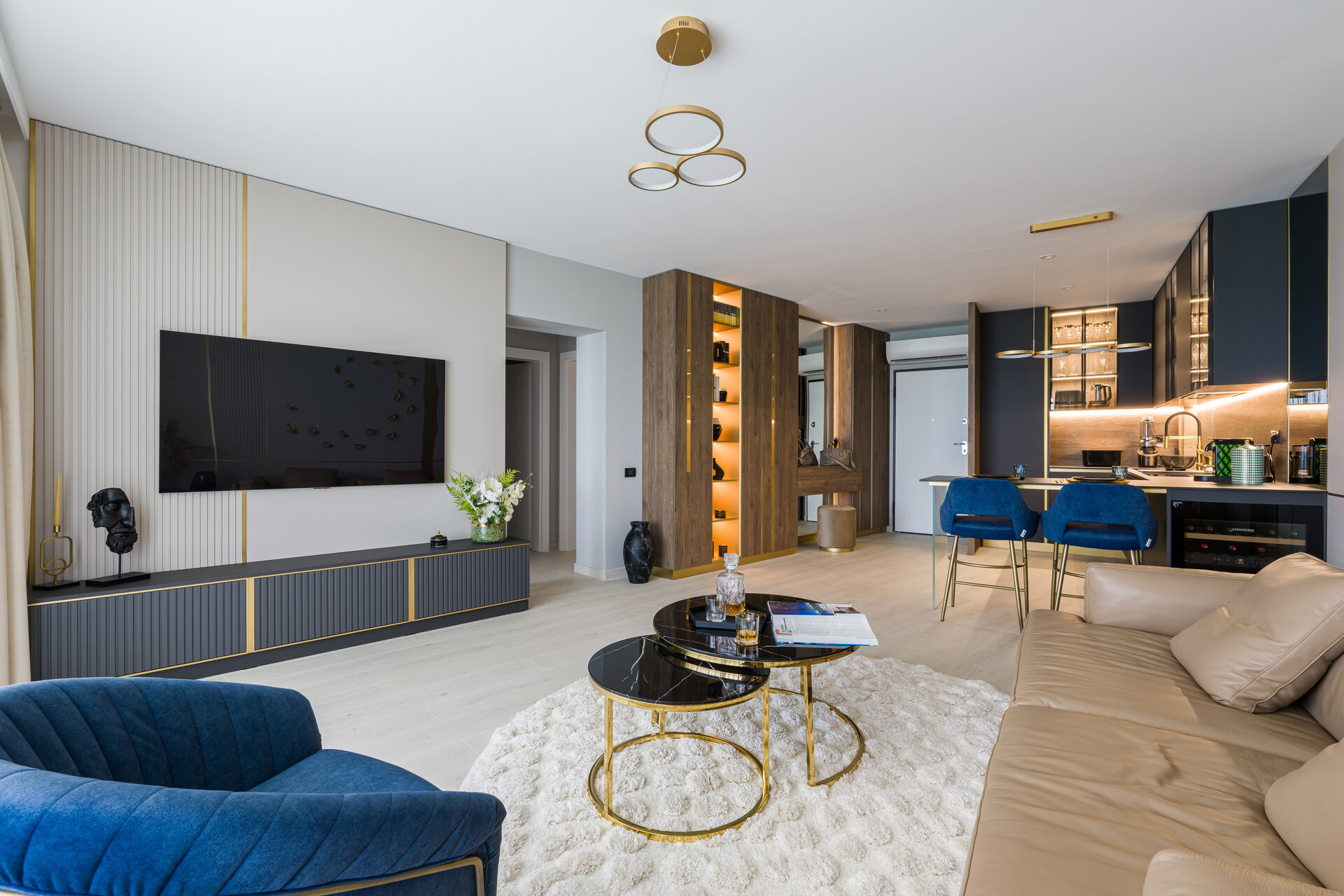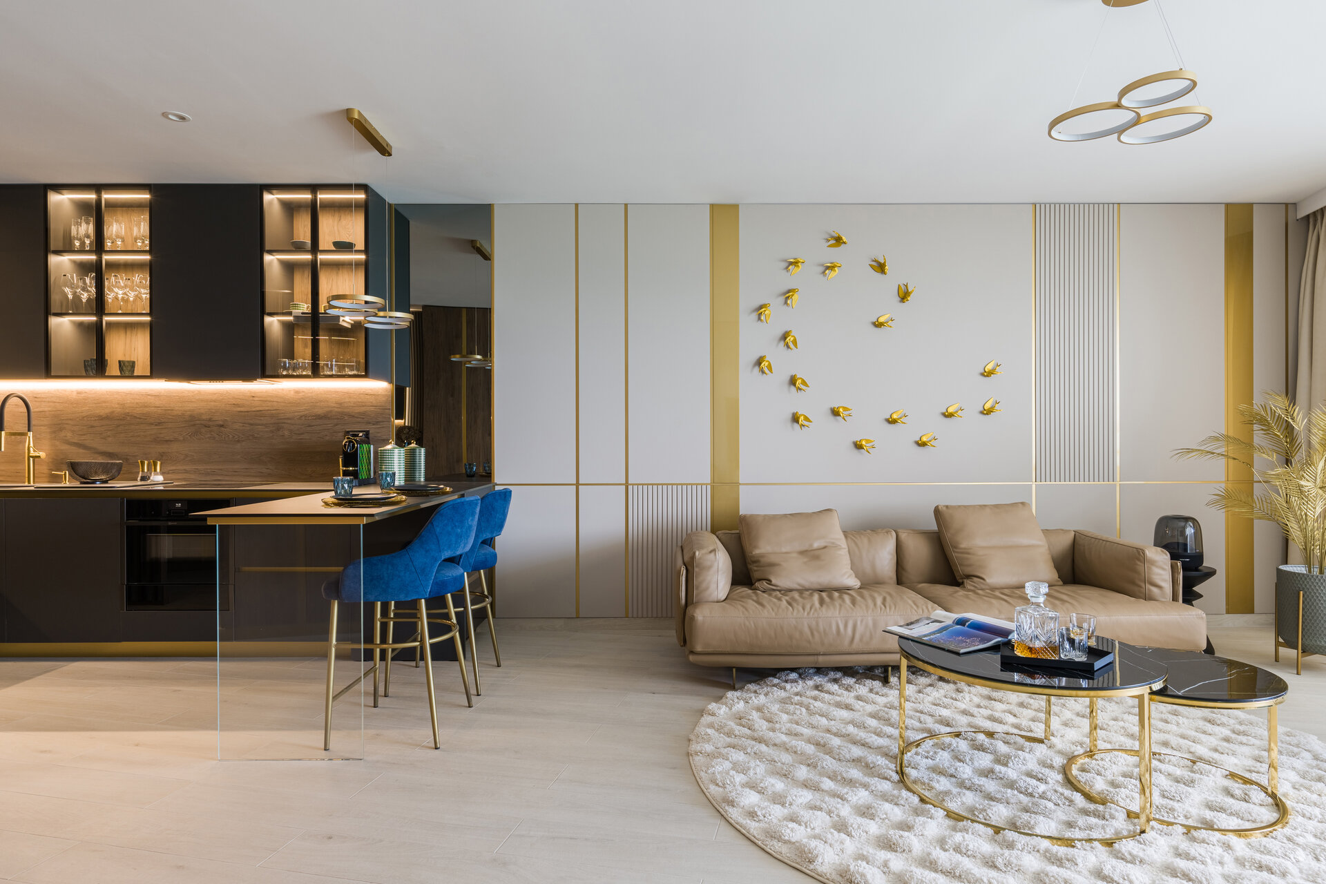 The elegance of the kitchen comes from the dark colors, subtle details, and high-quality materials used in the design of the furniture, all emphasized by the ambient lighting system. The golden accents found throughout the apartment enhance the overall sense of luxury.