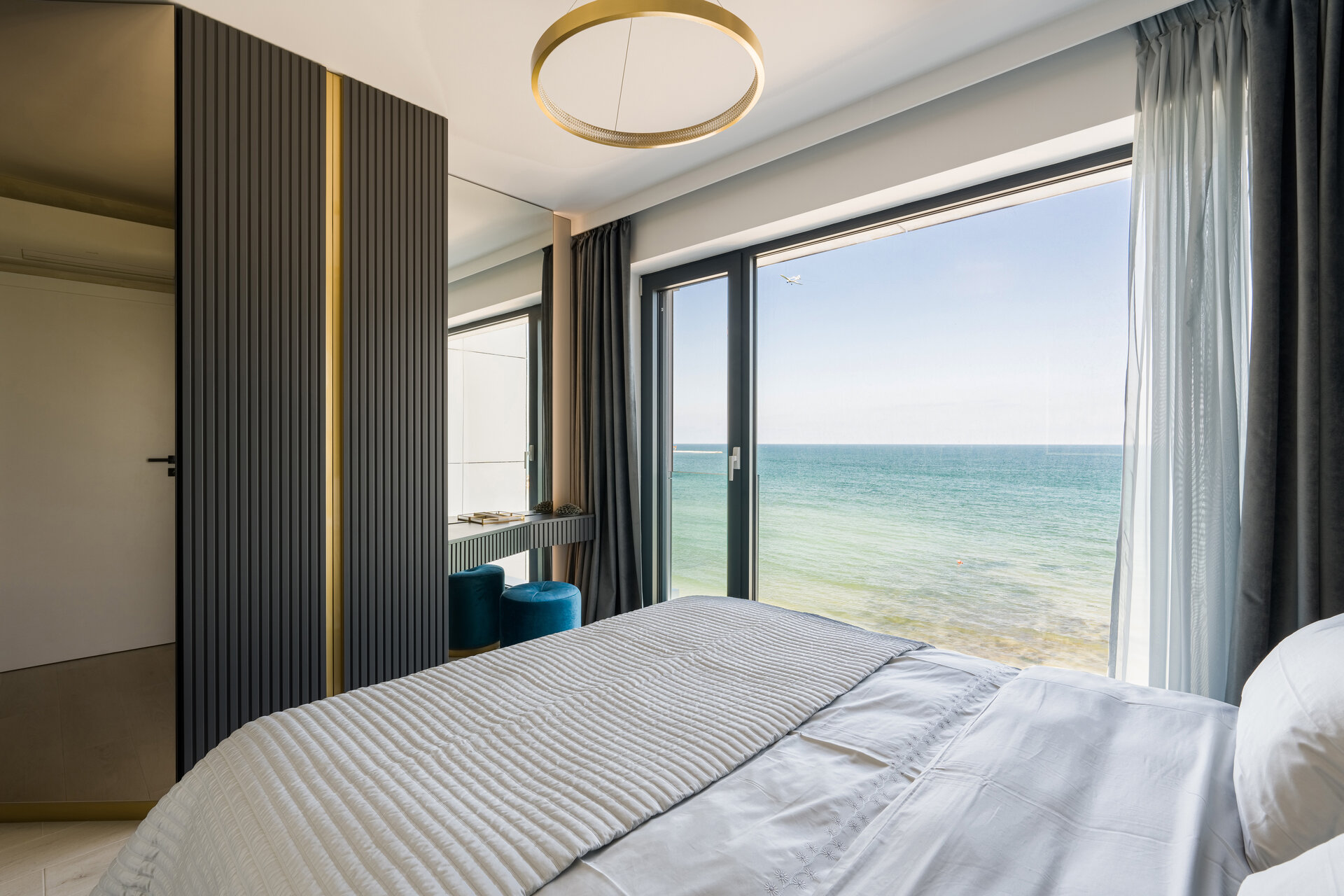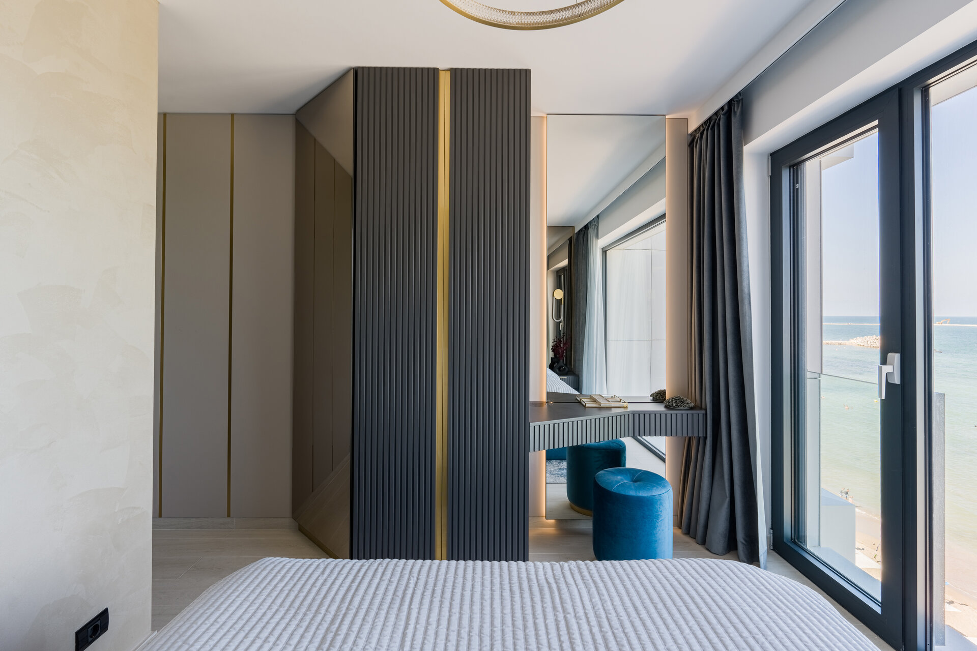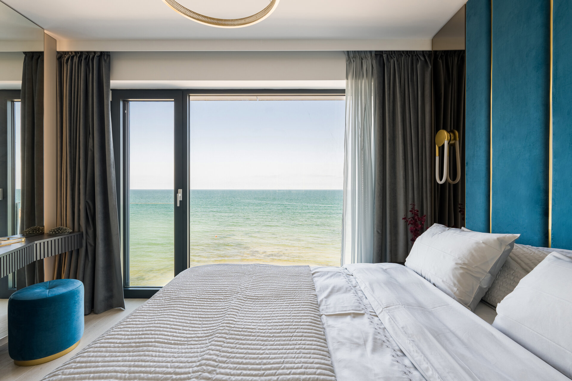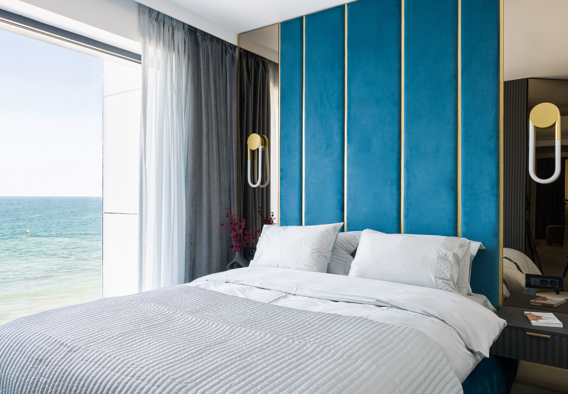 It was a challenge to work with the minimal dimensions of the master bedroom, but with the help of mirrors, I was able to offer a sense of space and much more light. The upholstered headboard in a shade of blue represents a reflection of the stormy sea, whose waves seem to symbolically enter the room.