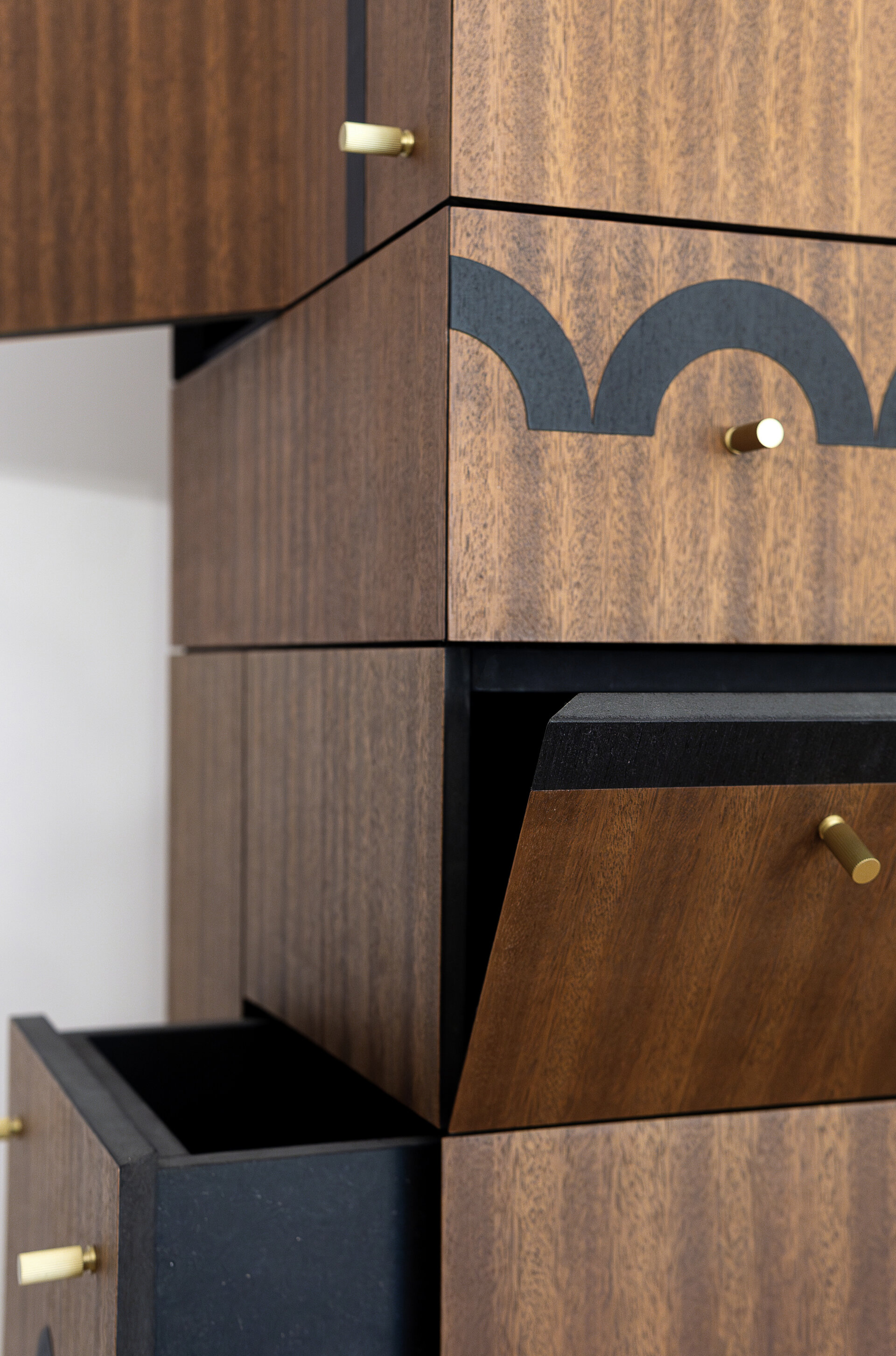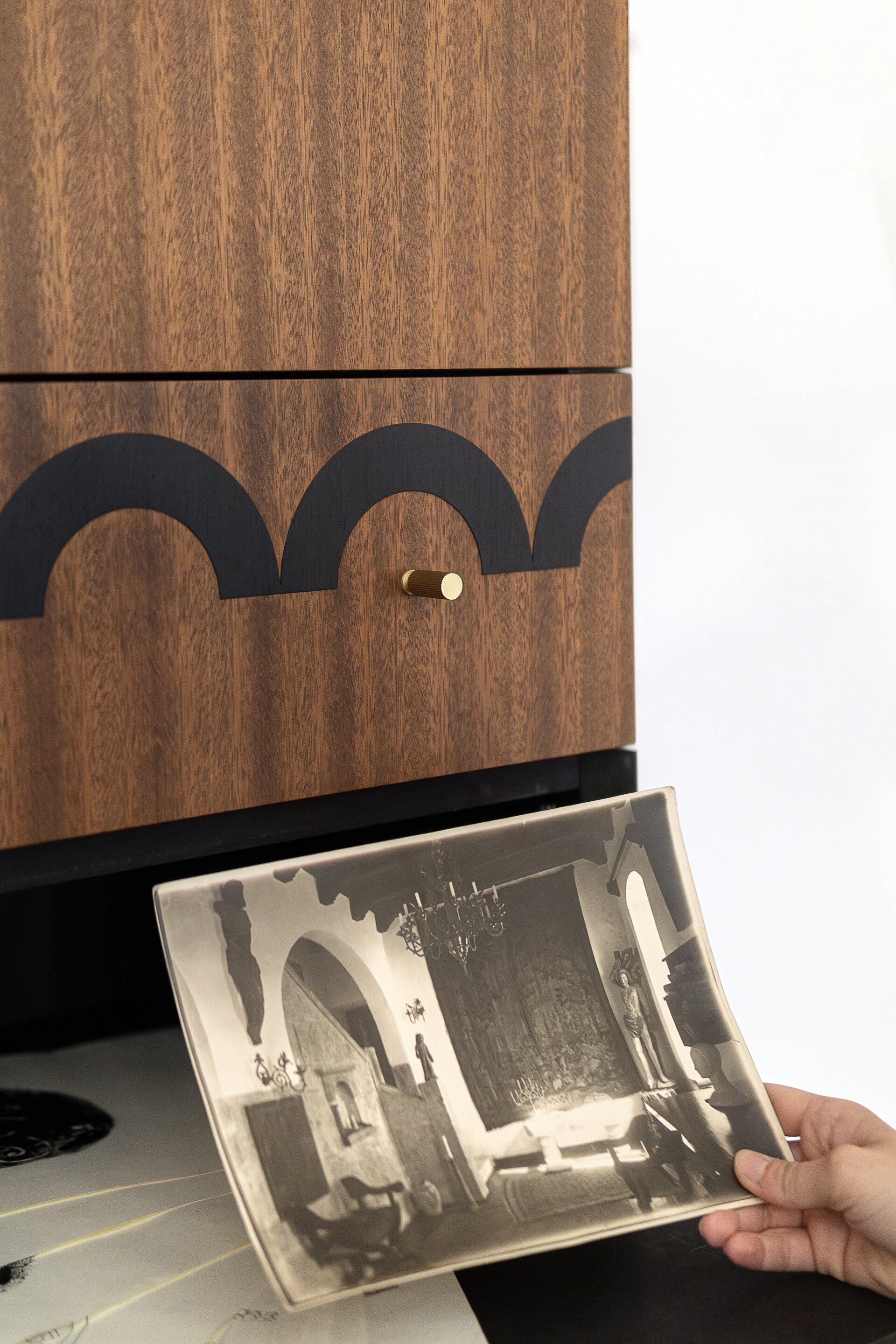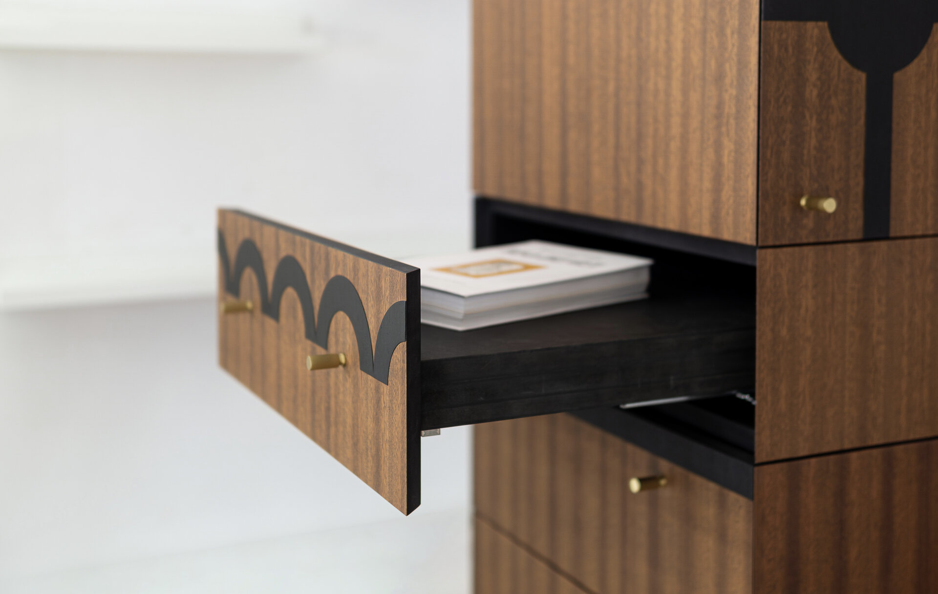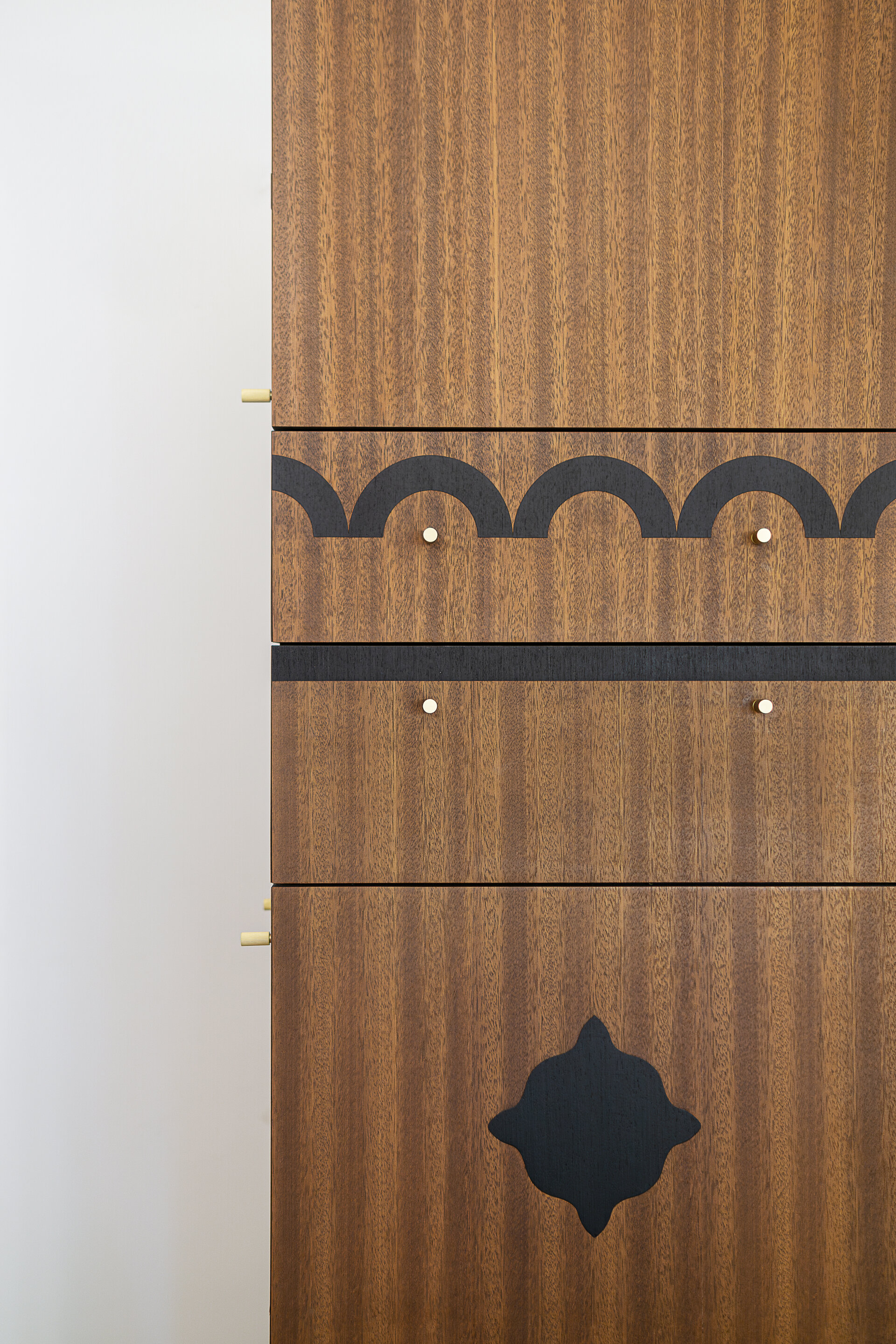 Composed of several modules, with a structure of through-coloured MDF veneered in tatajuba wood, the object is adorned with ebony-veneer motifs inspired by the ceilings of Casa Storck. Thus emerges a thoughtfully designed piece, with sculptural valences, intended for human interaction — gaining dynamism and warmth once it is touched and explored.