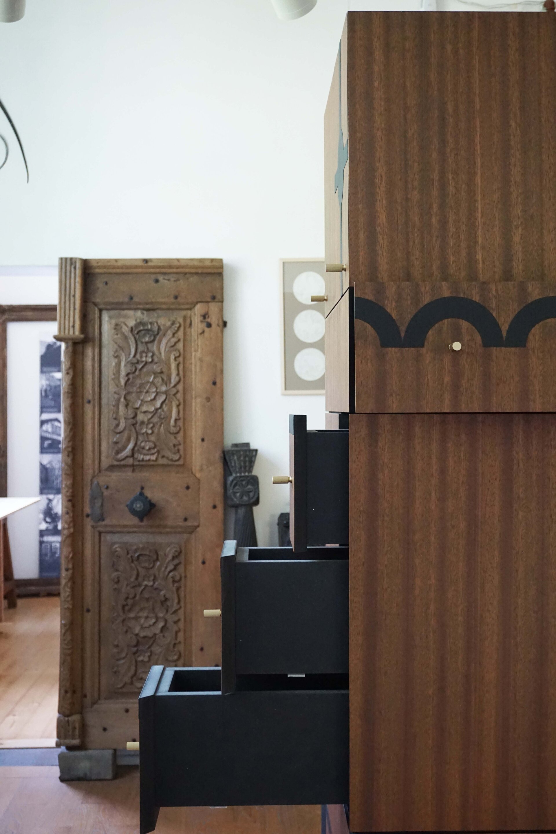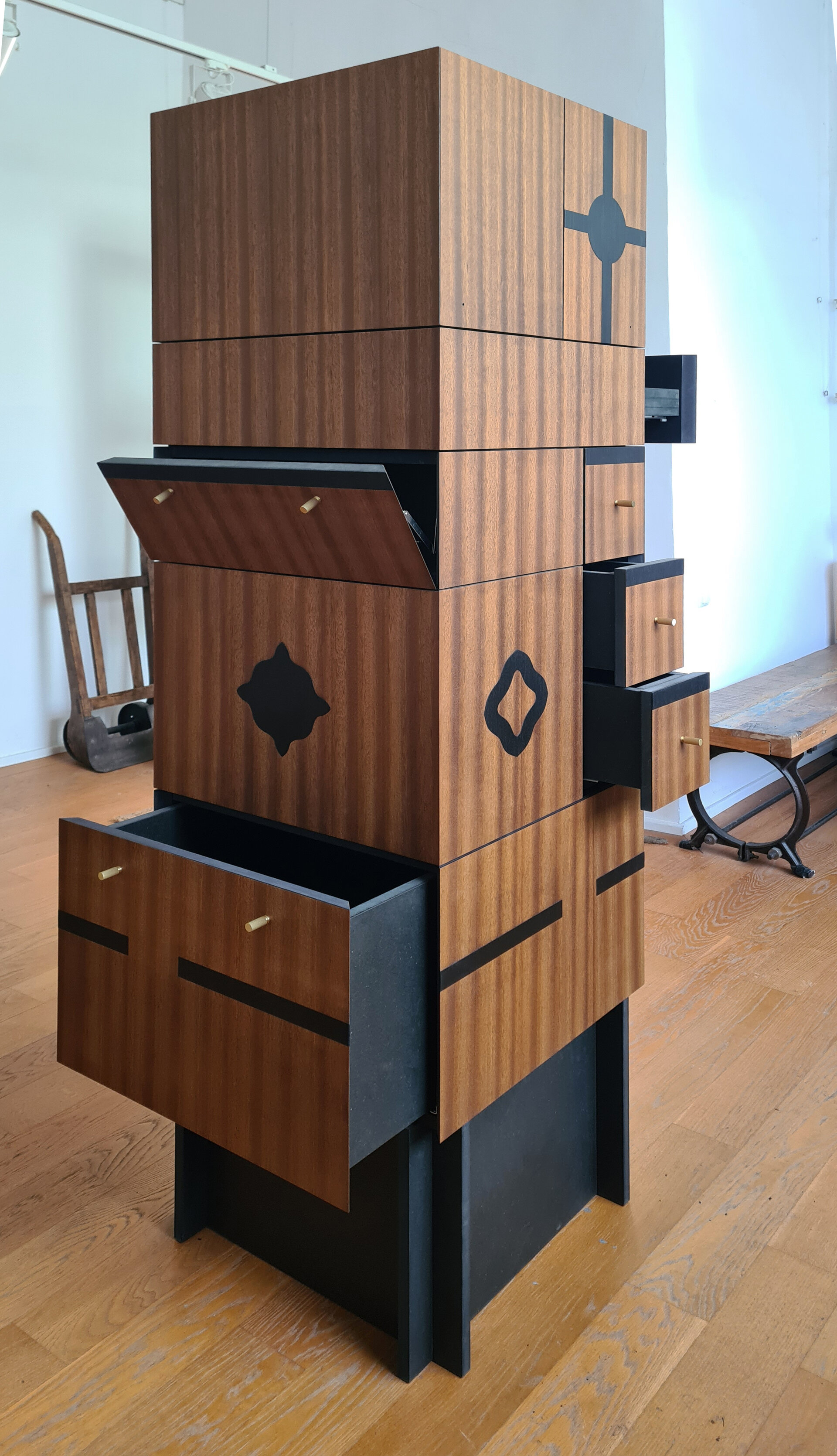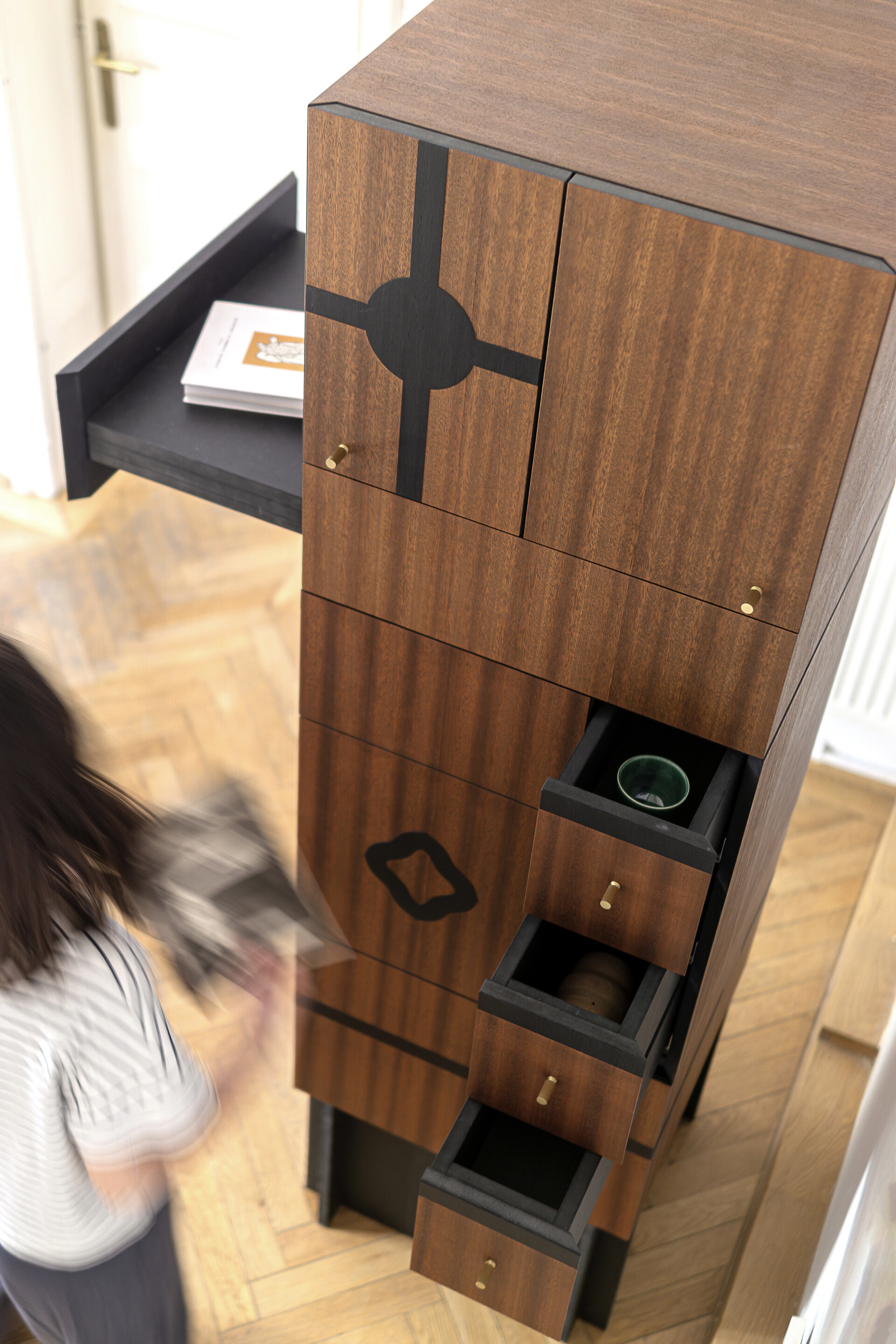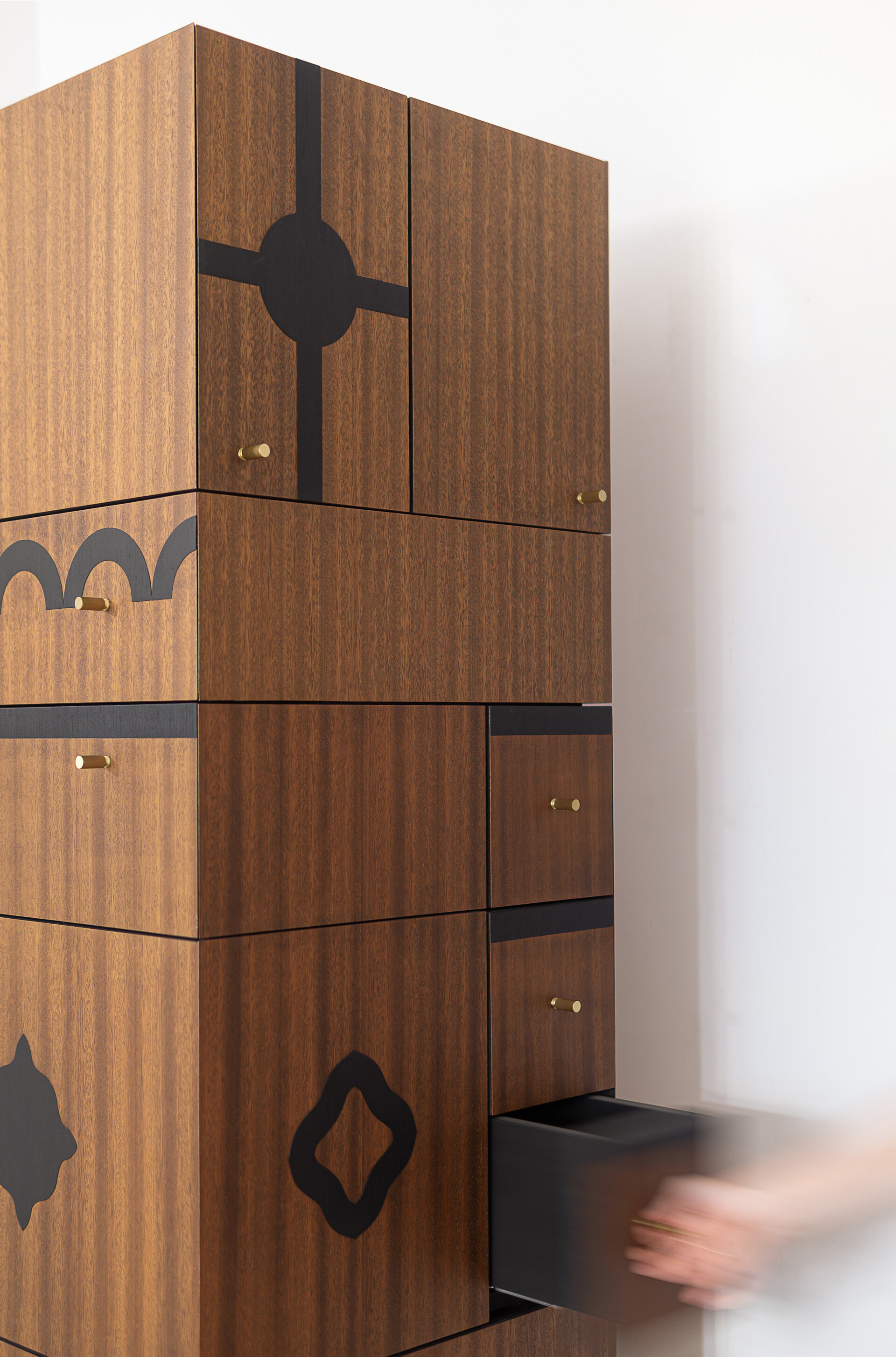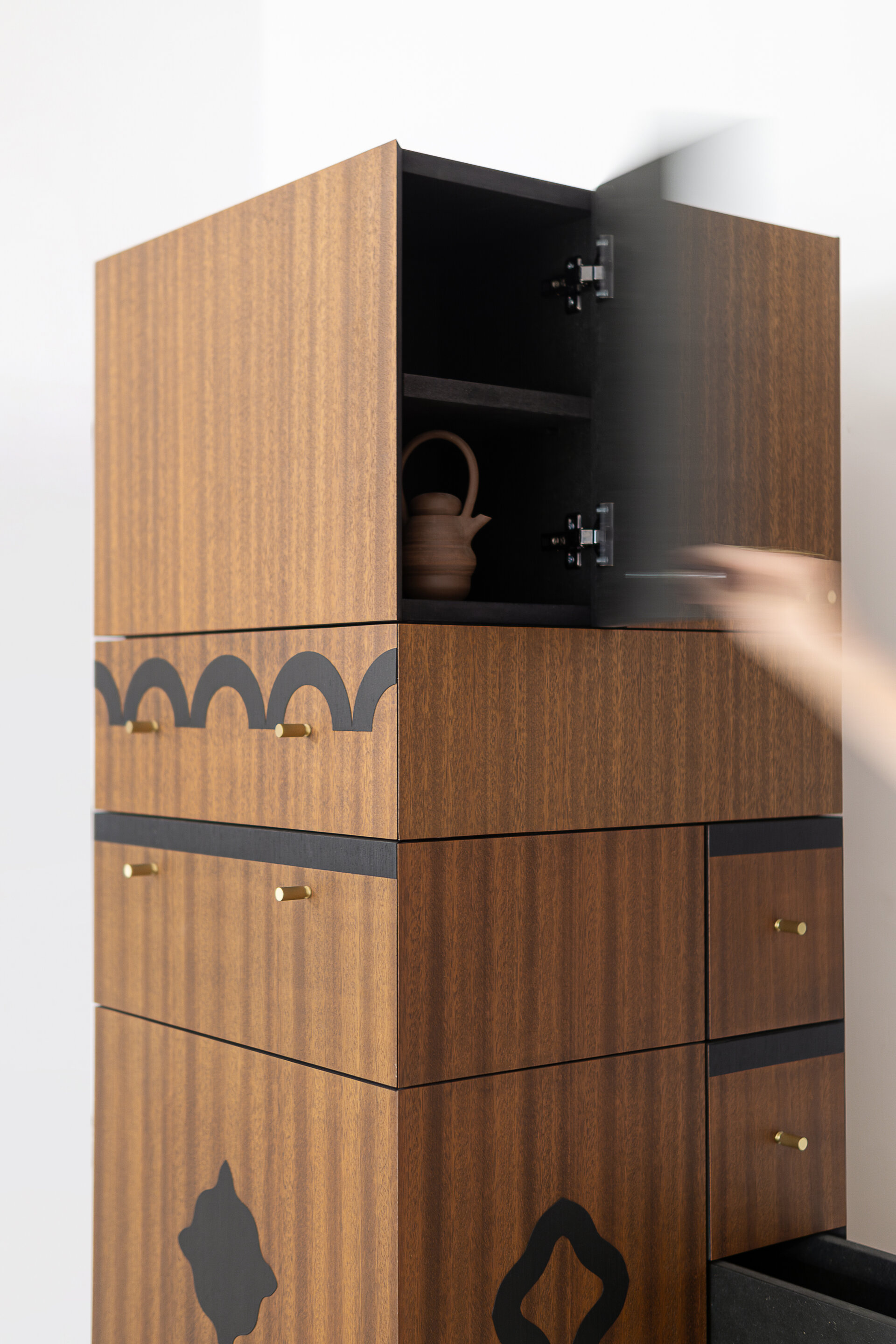 Composed of several modules, with a structure of through-coloured MDF veneered in tatajuba wood, the object is adorned with ebony-veneer motifs inspired by the ceilings of Casa Storck. Thus emerges a thoughtfully designed piece, with sculptural valences, intended for human interaction — gaining dynamism and warmth once it is touched and explored.