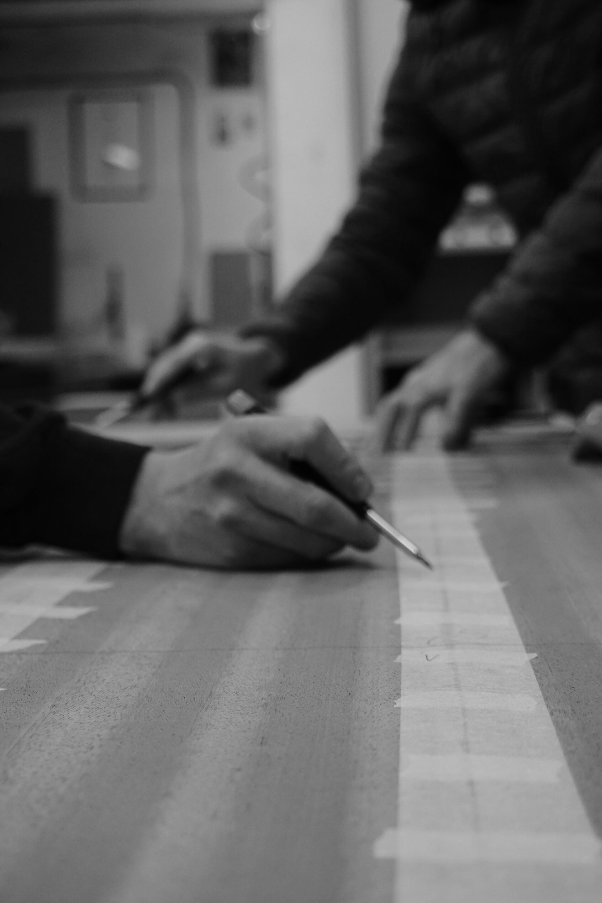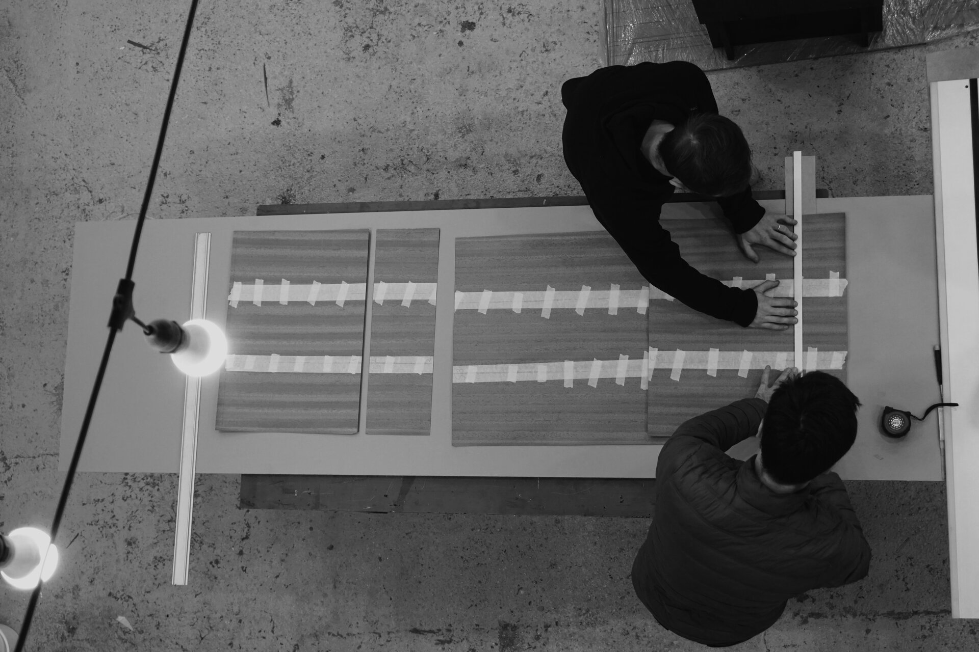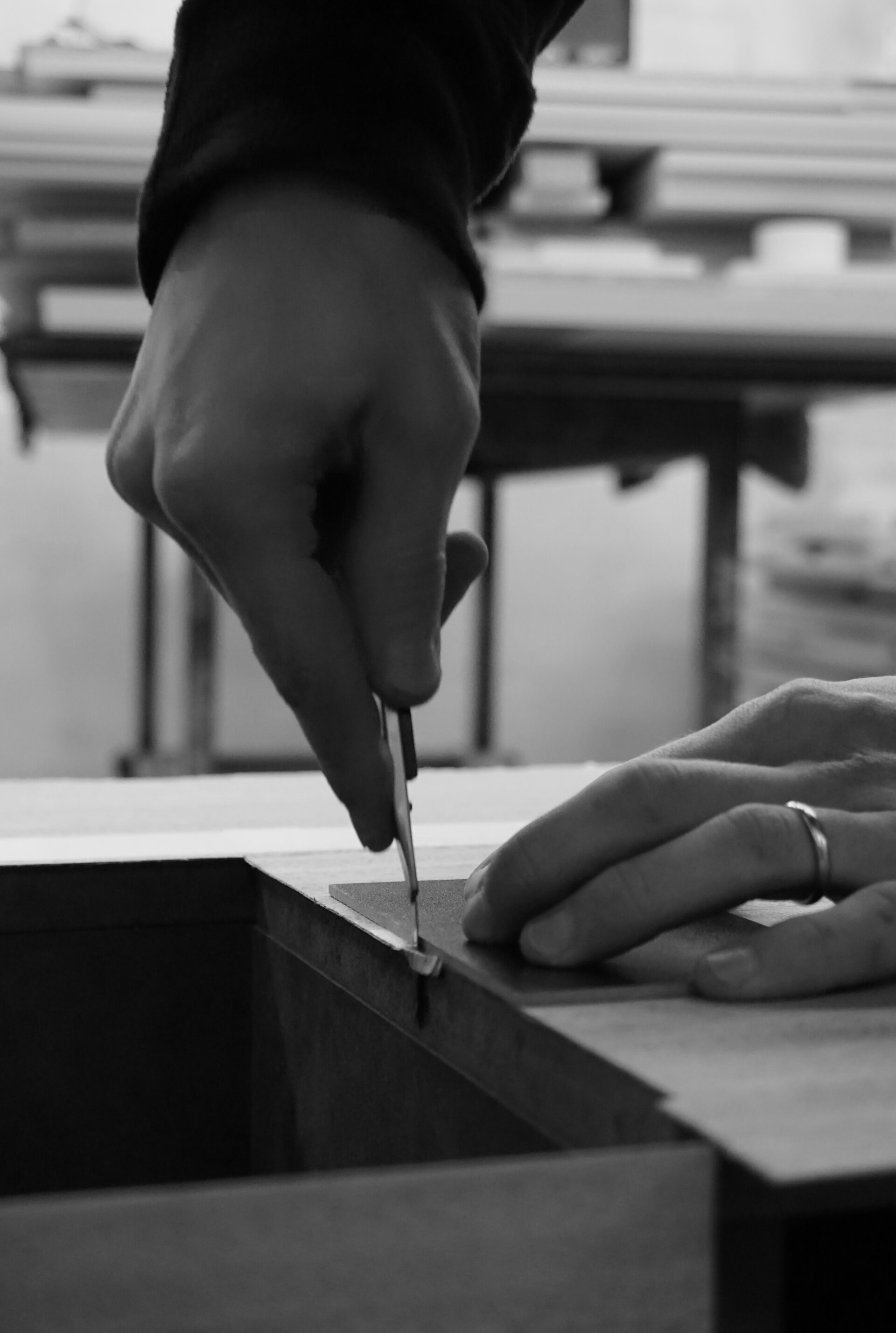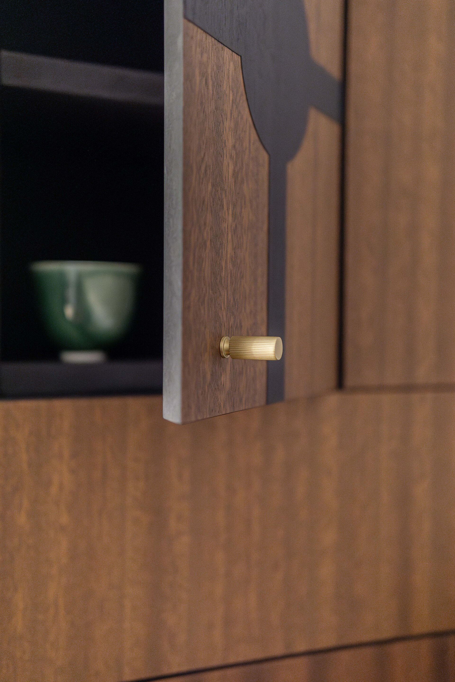 Composed of several modules, with a structure of through-coloured MDF veneered in tatajuba wood, the object is adorned with ebony-veneer motifs inspired by the ceilings of Casa Storck. Thus emerges a thoughtfully designed piece, with sculptural valences, intended for human interaction — gaining dynamism and warmth once it is touched and explored.