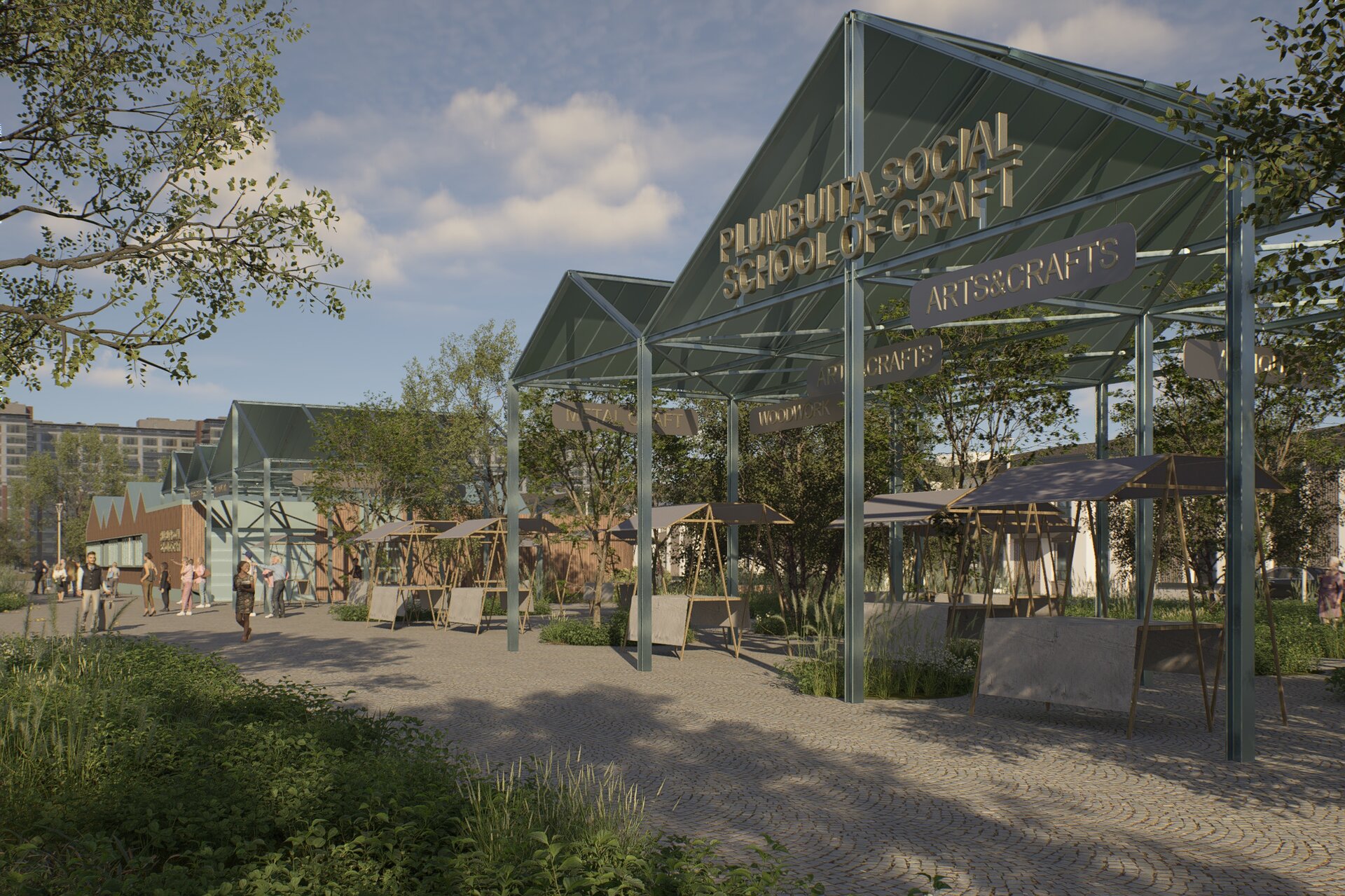 The proposed spaces include workshops for technical education, areas for craft fairs, and a meadow designated for community events.