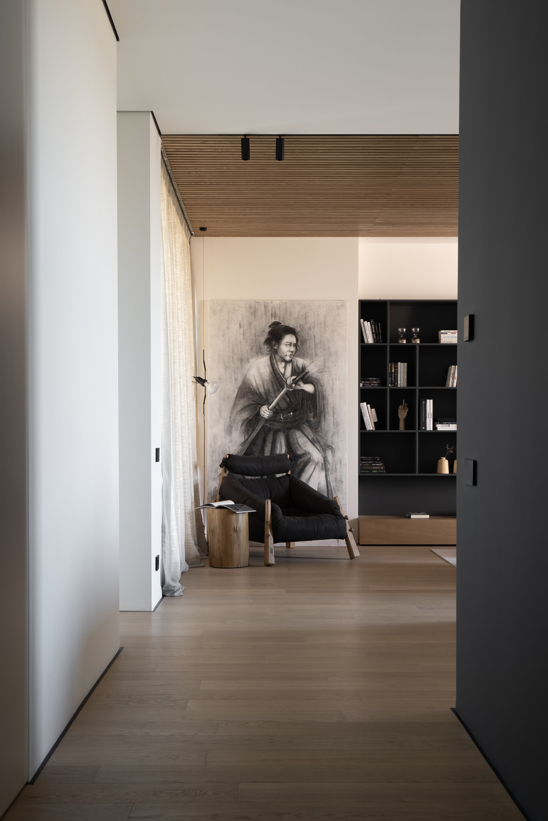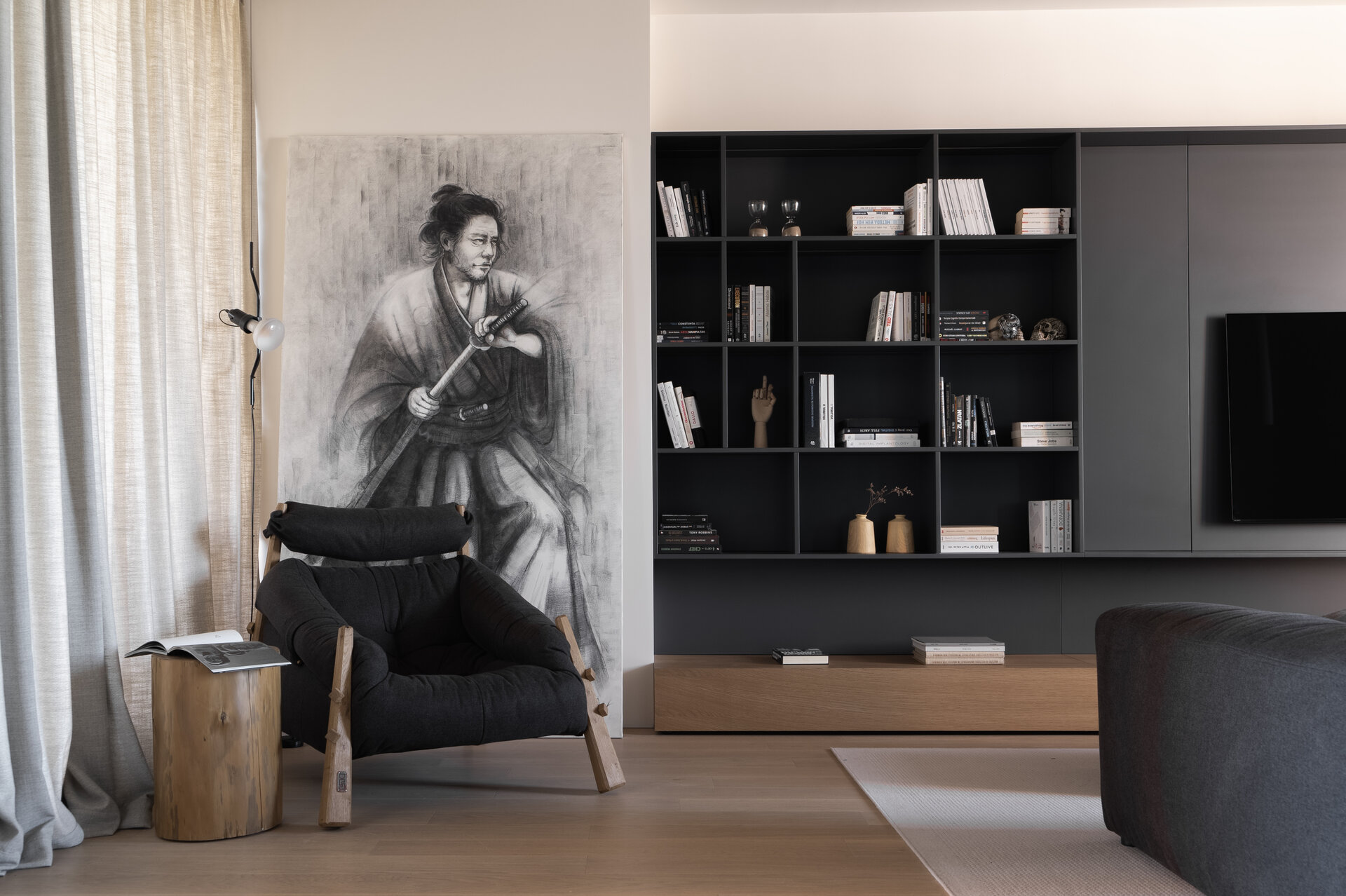A particular highlight is the charcoal artwork depicting a samurai. A personal choice of the clients, this piece expresses quiet strength, rigor and respect for discipline. The black and white drawing does not visually burden the atmosphere - on the contrary, the charcoal texture adds depth and expressiveness.