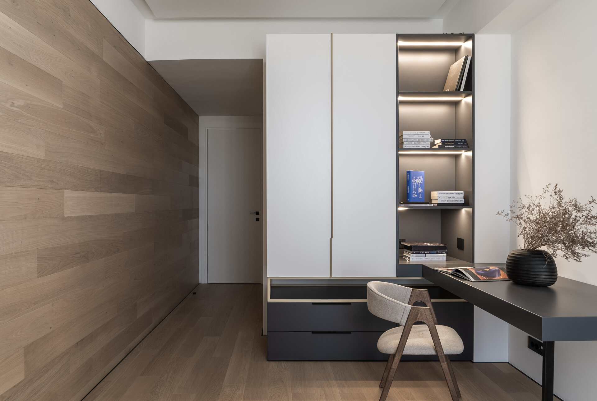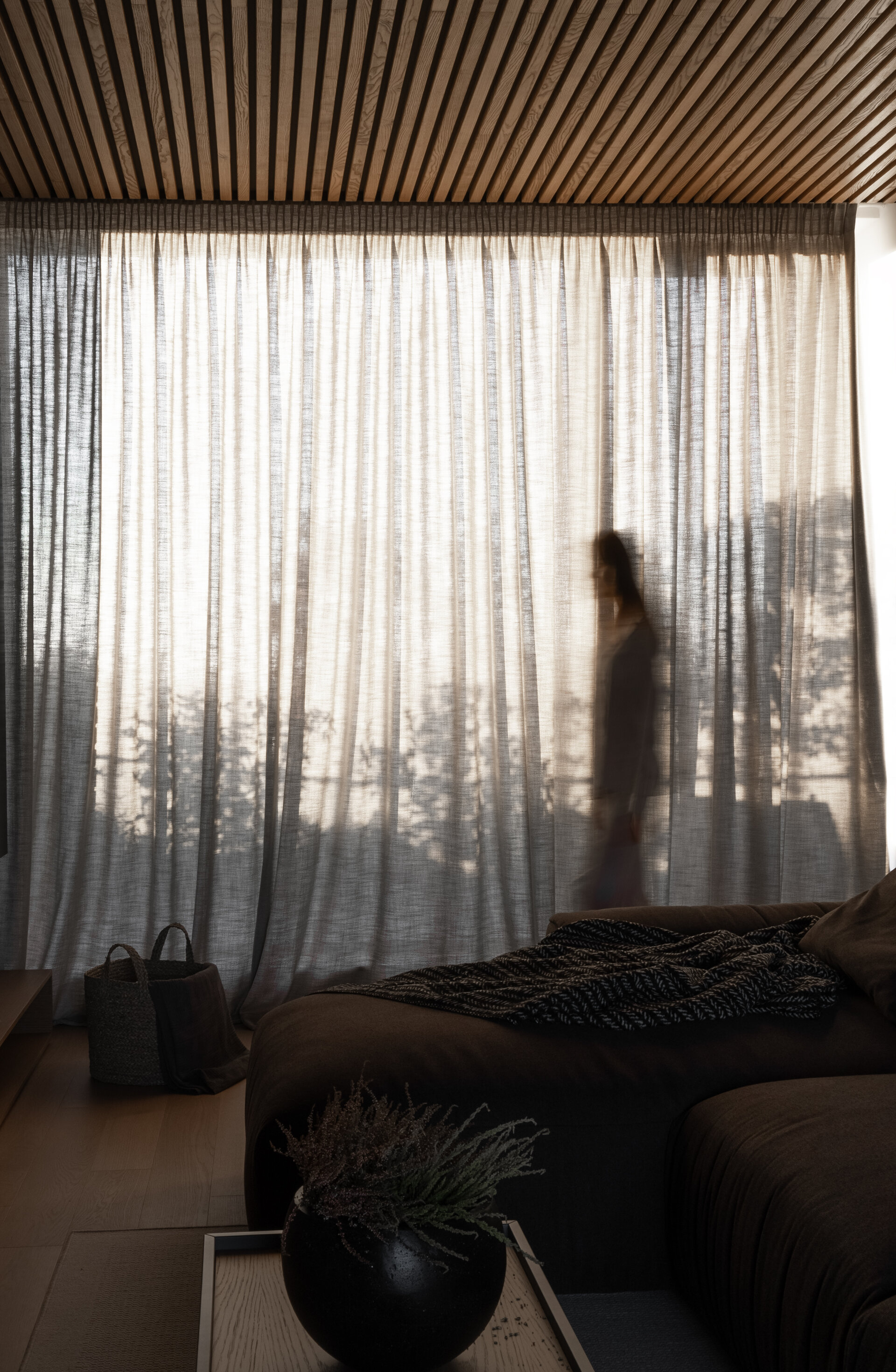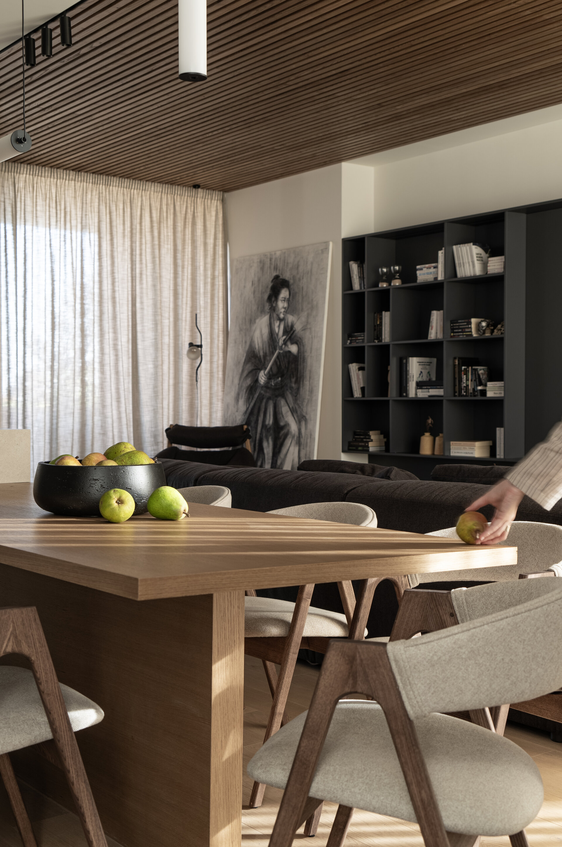 The living space - consisting of living room, dining room and kitchen - has been treated as a unit. The color palette is sober and refined: anthracite gray and warm white tones, complemented by natural wood accents. The focal point that visually anchors the space is the rhythmically elegant wooden slatted ceiling. By aligning these slats flush with the white ceiling, a seamless visual flow is achieved, eliminating any fragmentation or visual clutter.