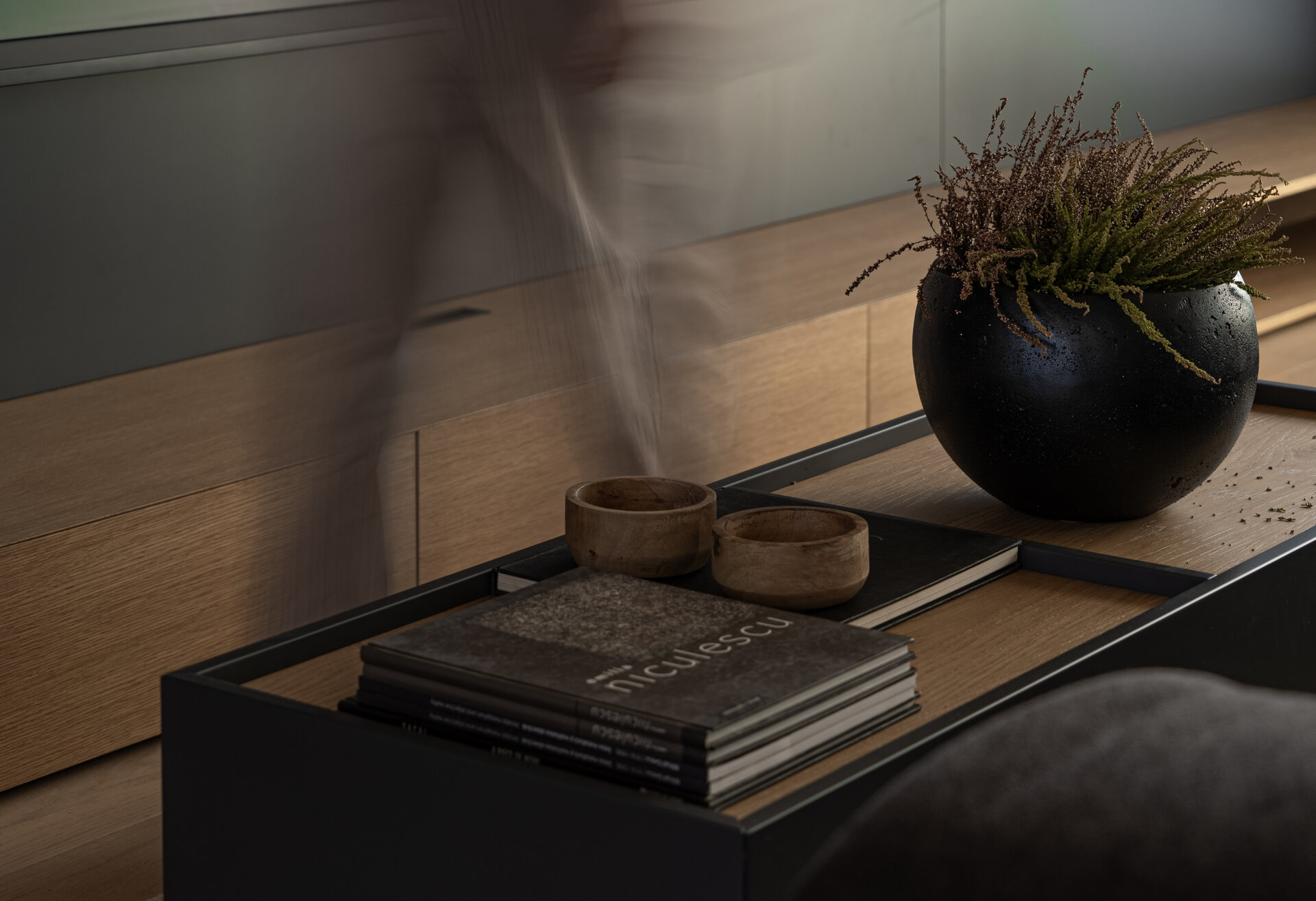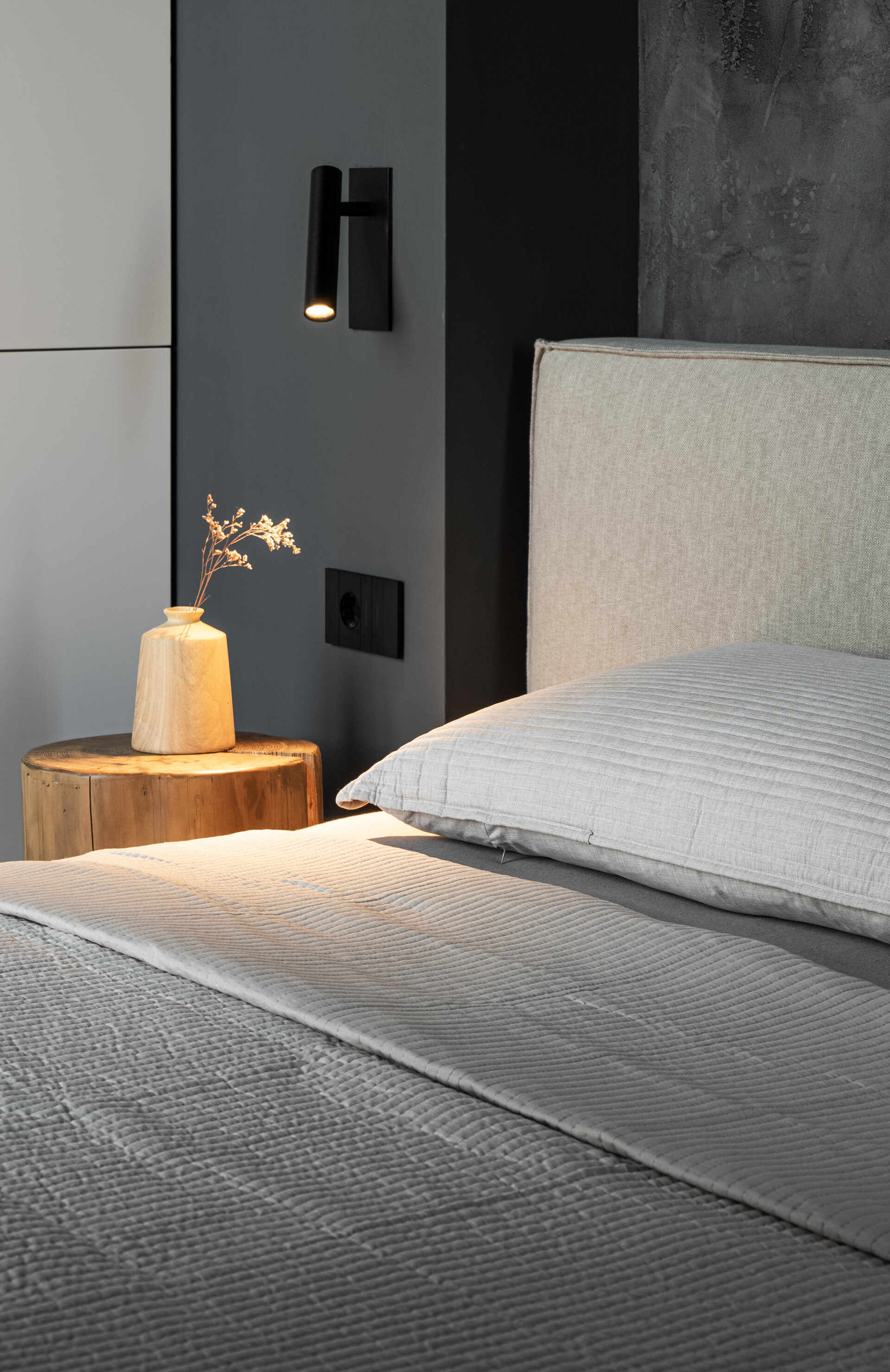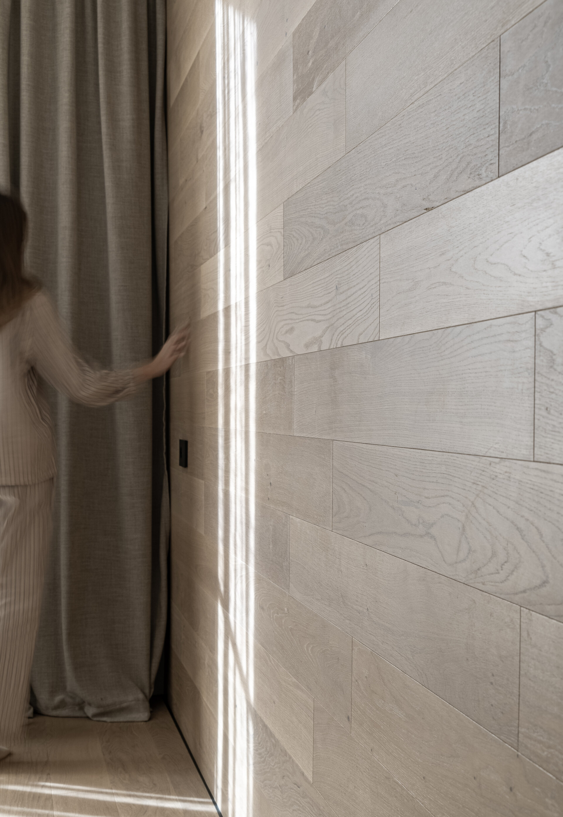 Solid wooden logs can be found in every room - in the bedroom, living room or balcony. They have been carefully integrated and function as sculptural pieces, retaining the naturalness of the wood through visible cracks, knots or fibers. In the bedroom, the raw wood tempers the straight lines and cool finish of the decorative plaster, transforming the room into a warm space. Each log is unique, discreetly contributing to the identity of each area.