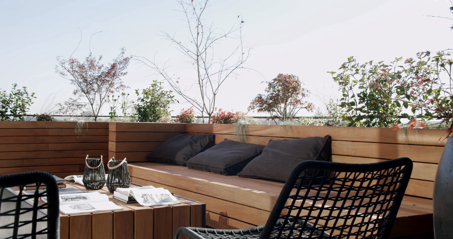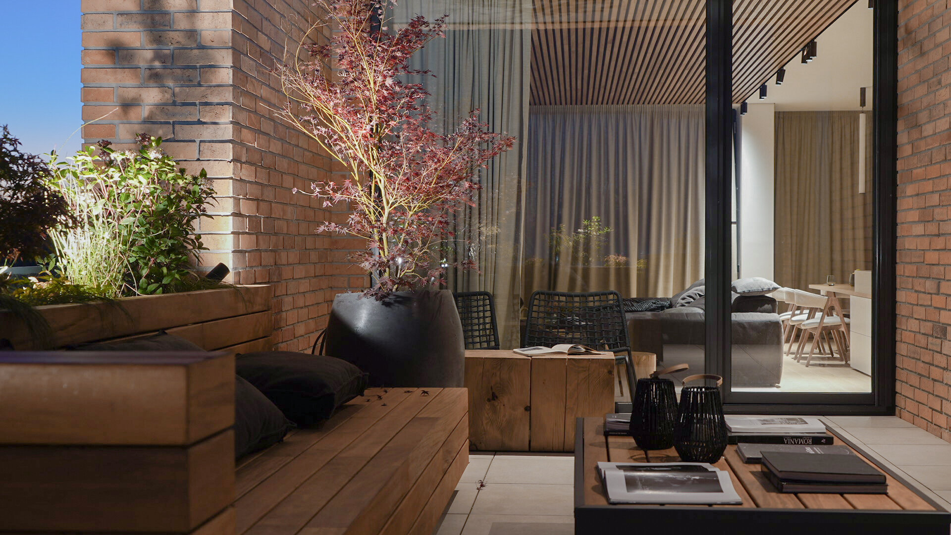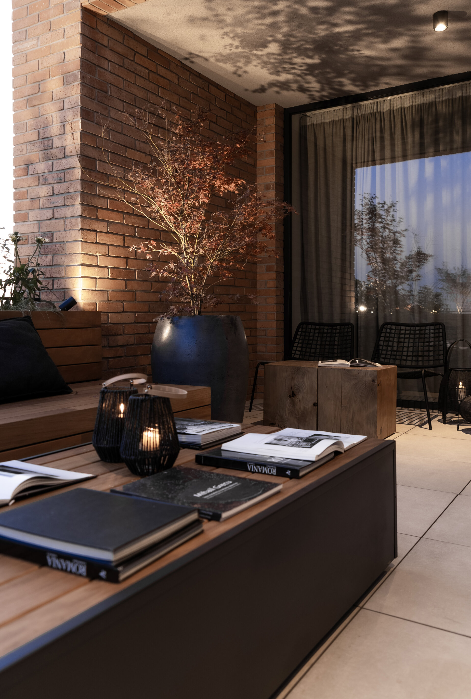 The terrace becomes a natural extension of the interior. The furniture is made of exotic Brazilian wood, chosen for its natural moisture resistance and durability. Spotlights, discreetly placed among the plants, are directed upwards, highlighting the reddish leaves of the Japanese maples and casting elegant shadows on the brick wall. The result is an intimate, warm and lively nook, ideal for quiet evenings or gatherings with friends.
