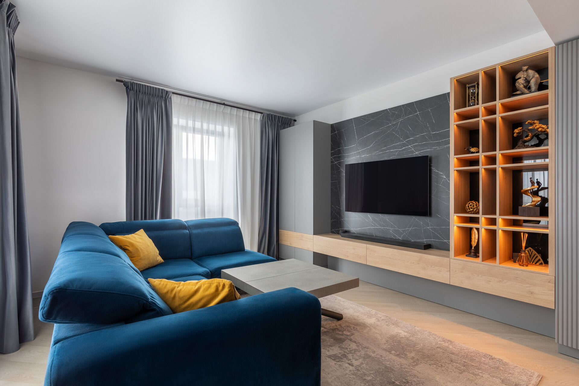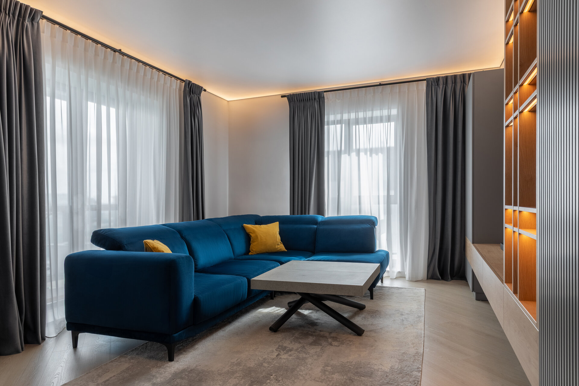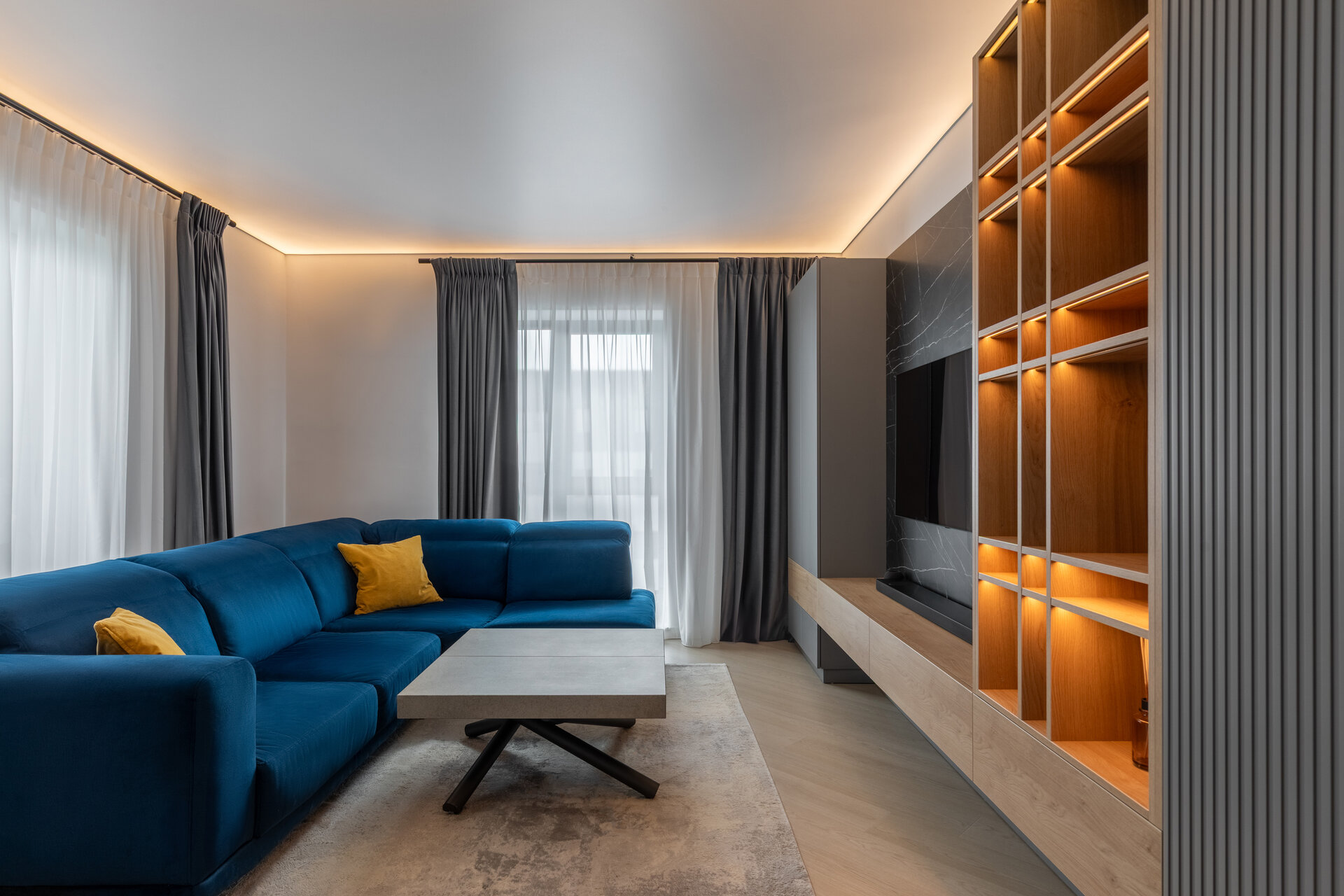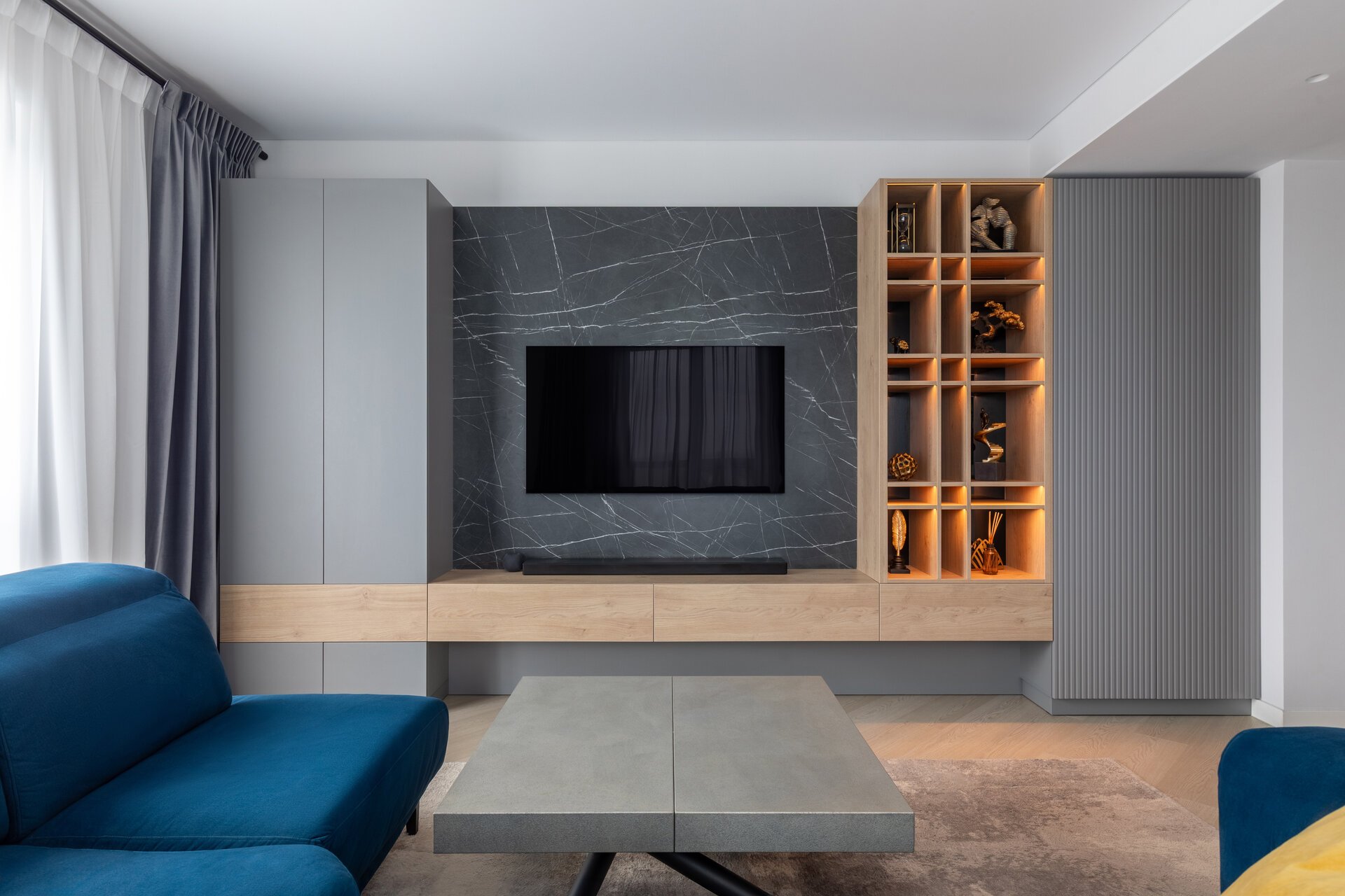 The apartment perfectly reflects their lifestyle: organized, contemporary, and at the same time, warm and inviting. The design blends neutral grey tones with bold color accents, carefully introduced to bring energy and personality to each area. Soft textures, ambient lighting, and thoughtfully selected furniture contribute to a calm and balanced atmosphere.
