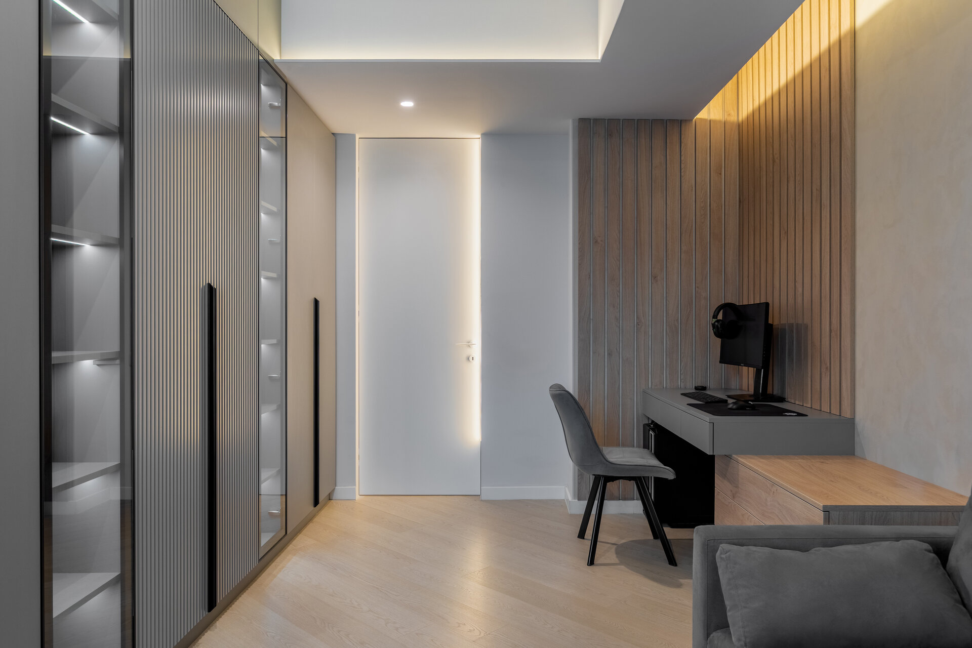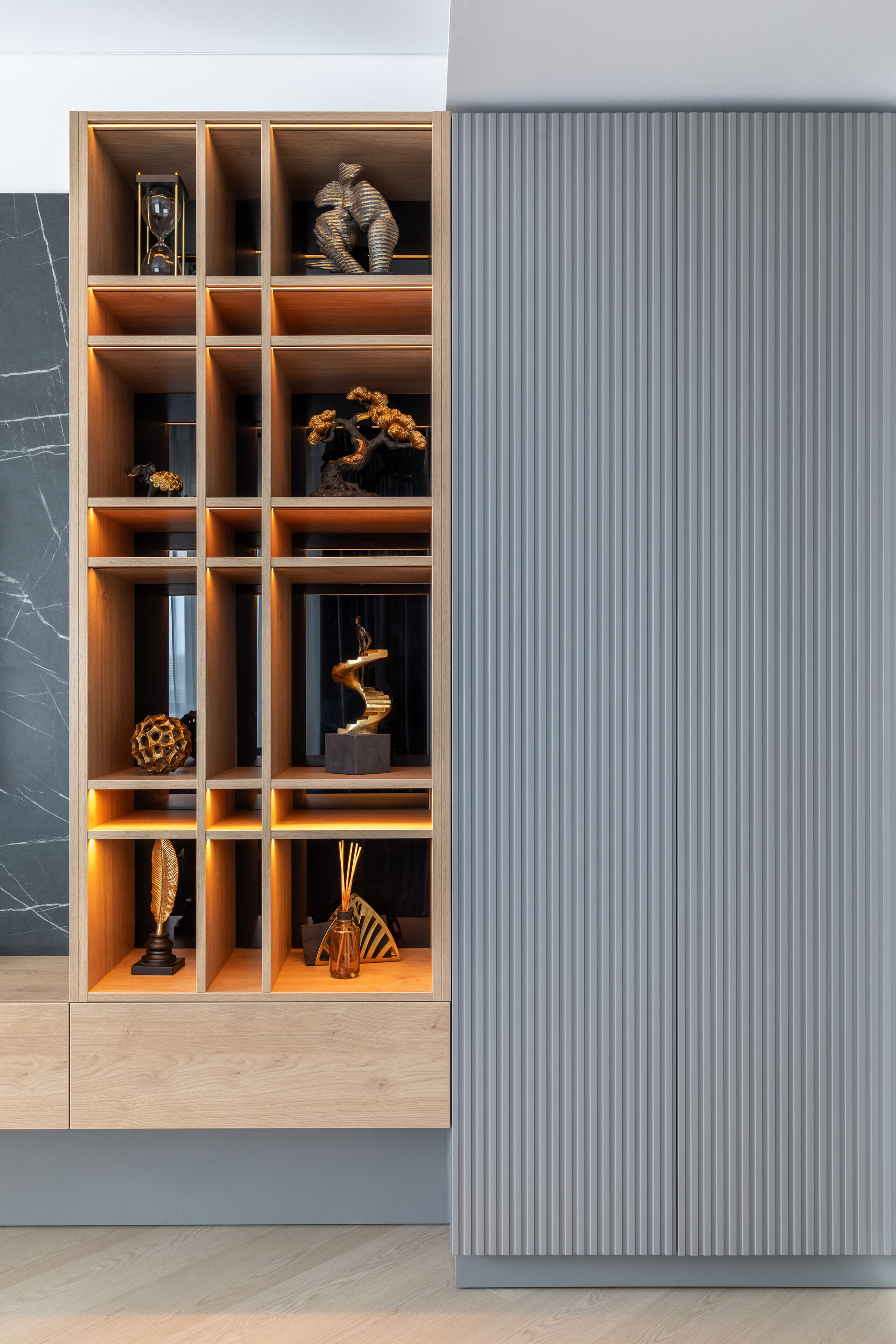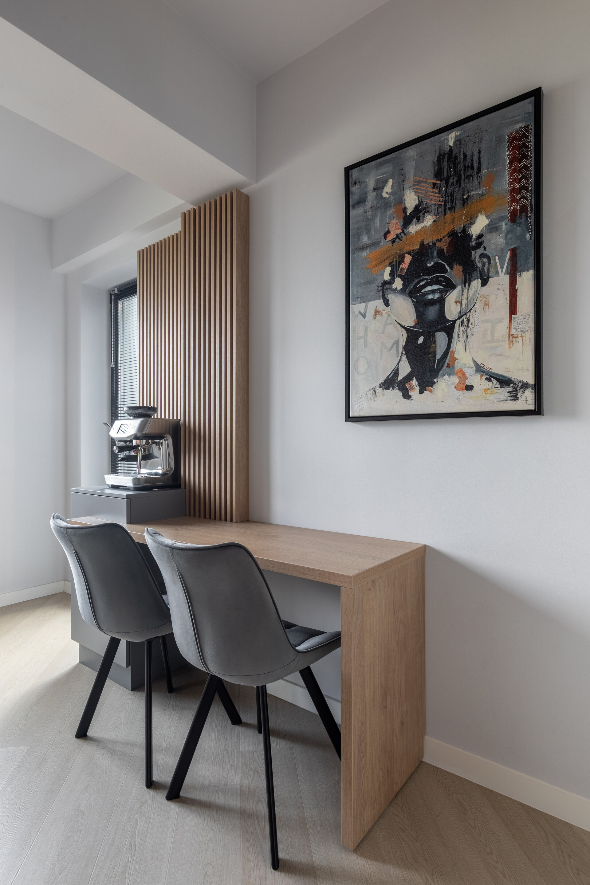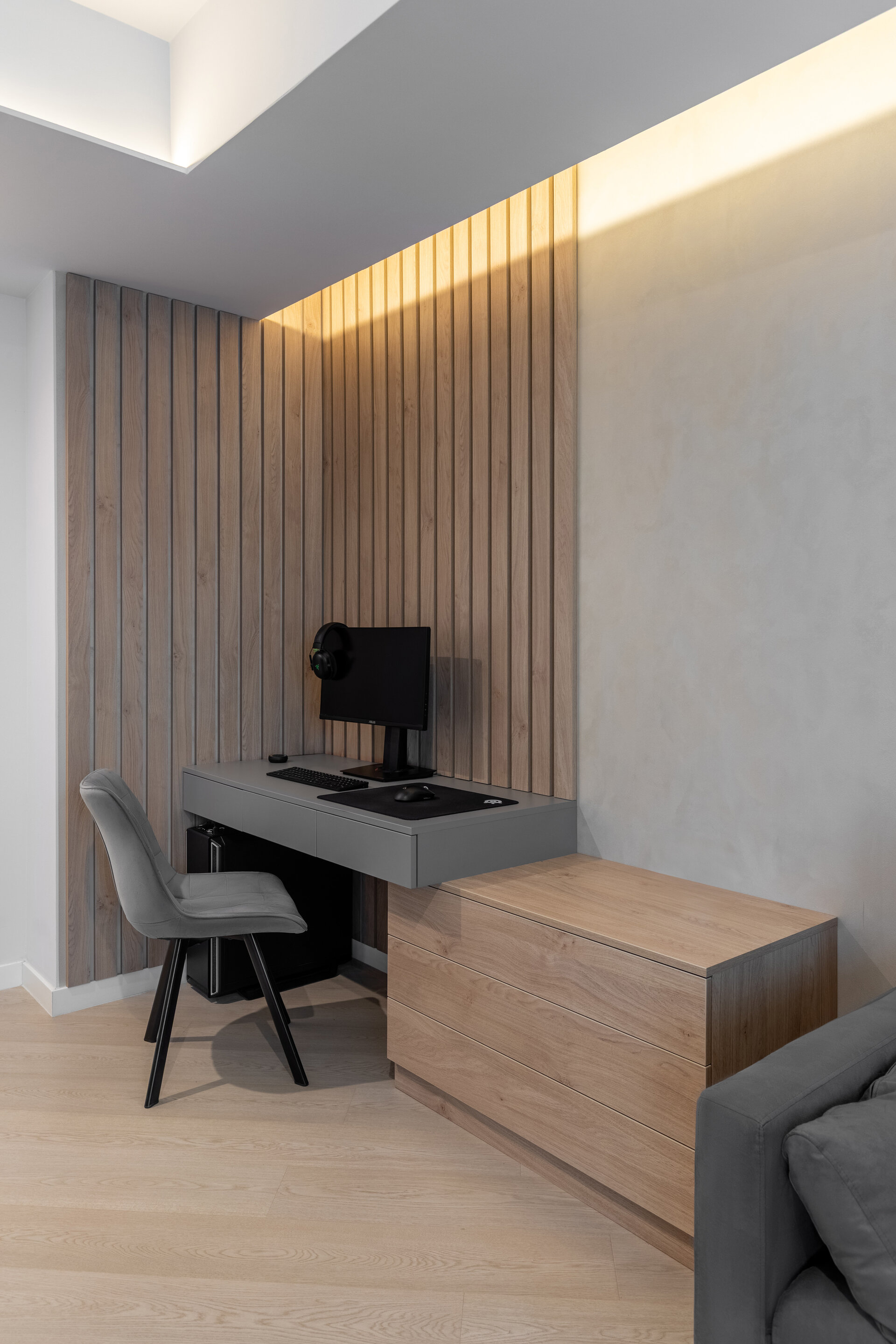 The apartment perfectly reflects their lifestyle: organized, contemporary, and at the same time, warm and inviting. The design blends neutral grey tones with bold color accents, carefully introduced to bring energy and personality to each area. Soft textures, ambient lighting, and thoughtfully selected furniture contribute to a calm and balanced atmosphere.