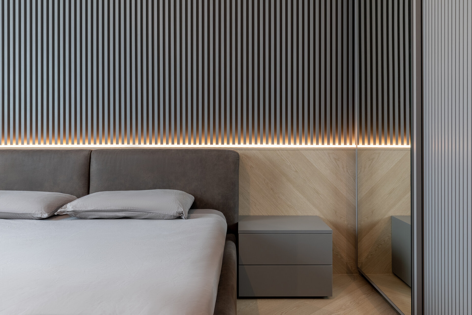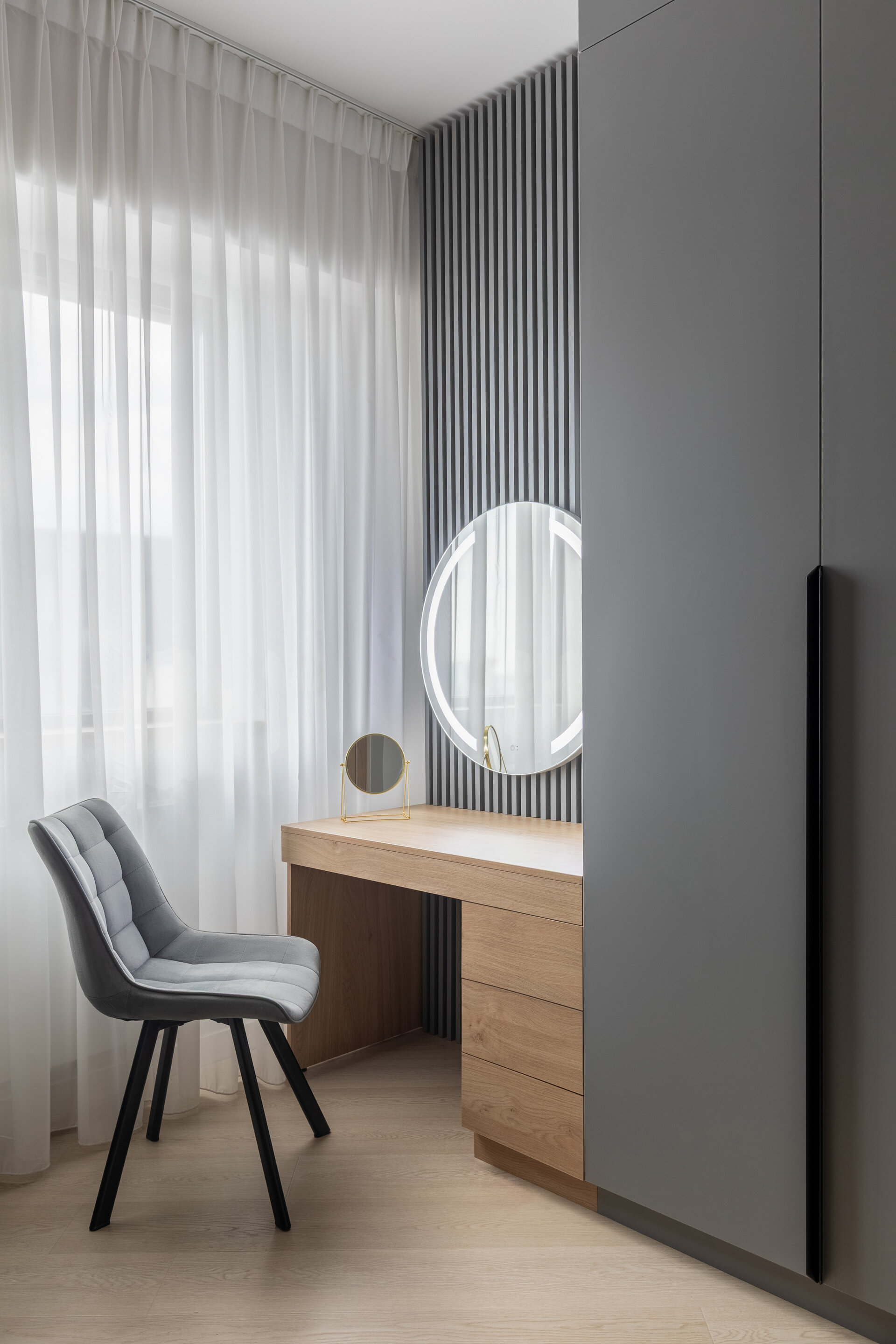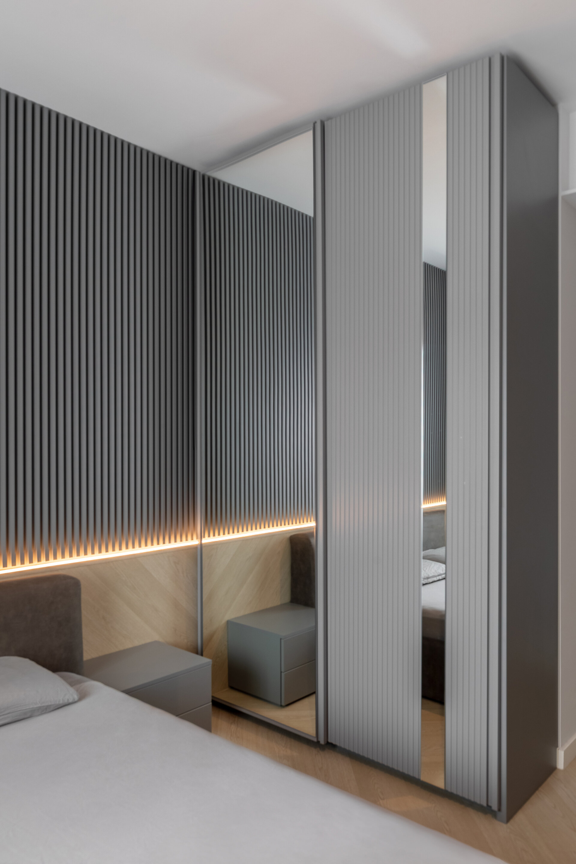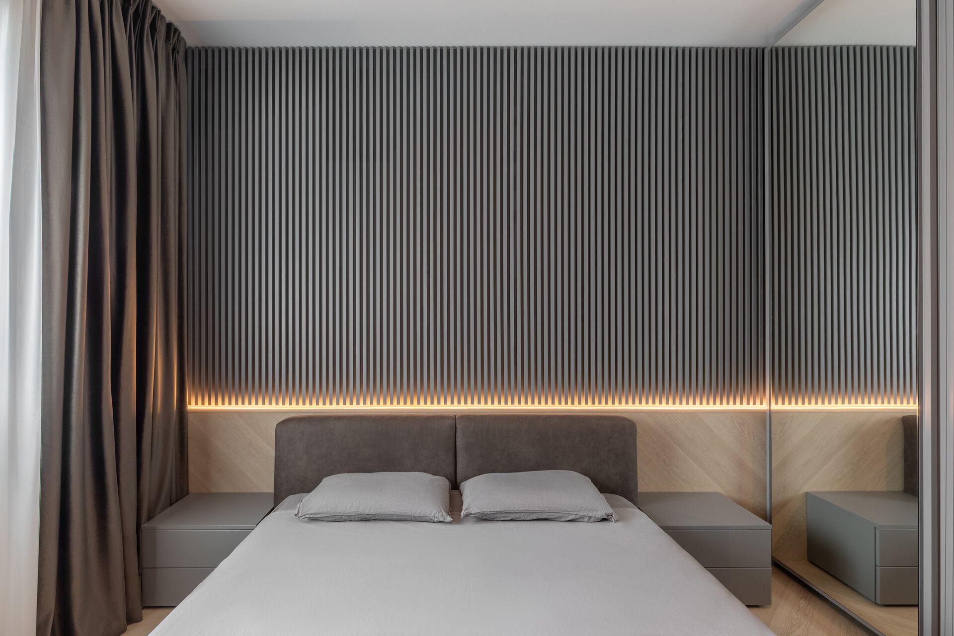 The apartment perfectly reflects their lifestyle: organized, contemporary, and at the same time, warm and inviting. The design blends neutral grey tones with bold color accents, carefully introduced to bring energy and personality to each area. Soft textures, ambient lighting, and thoughtfully selected furniture contribute to a calm and balanced atmosphere.