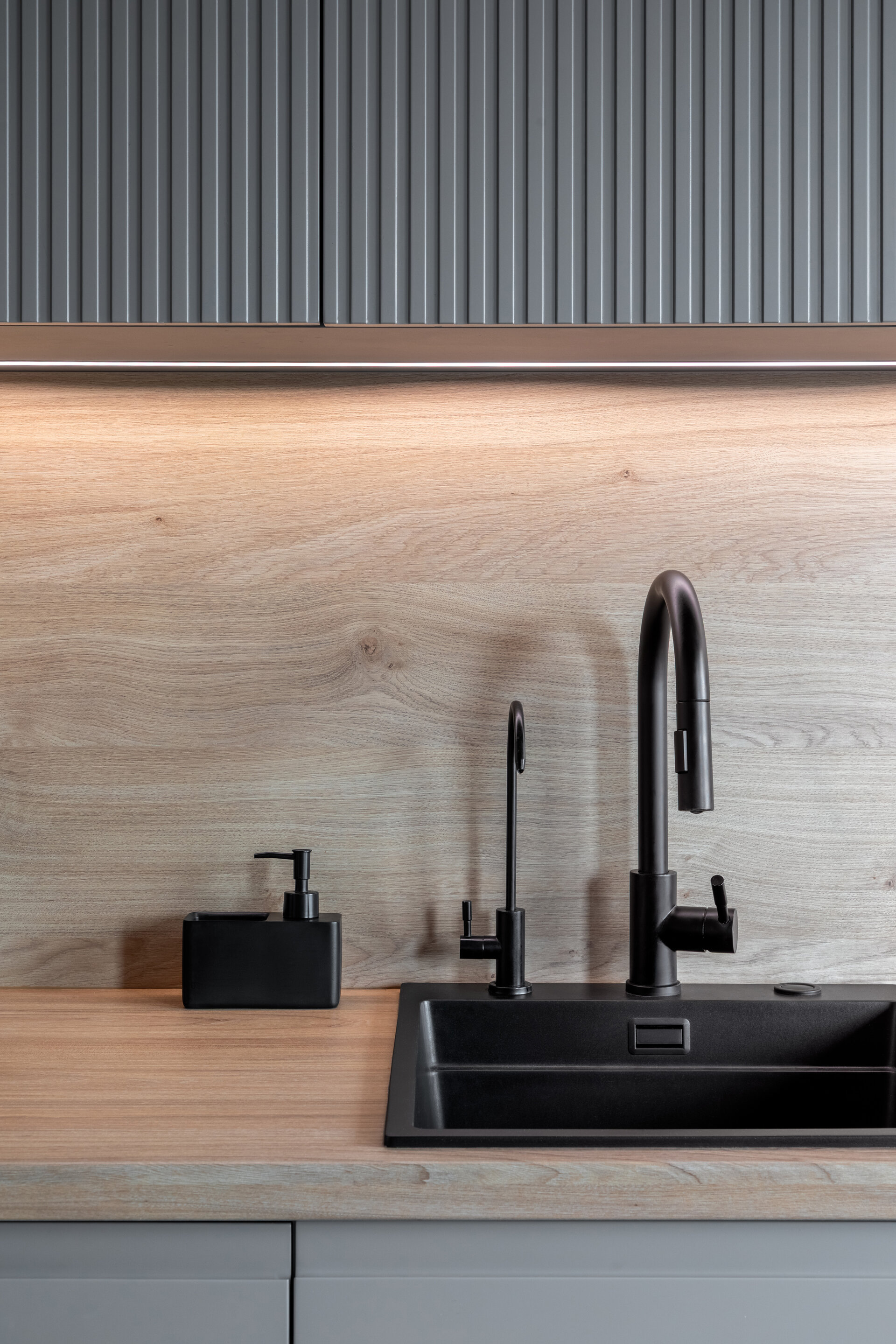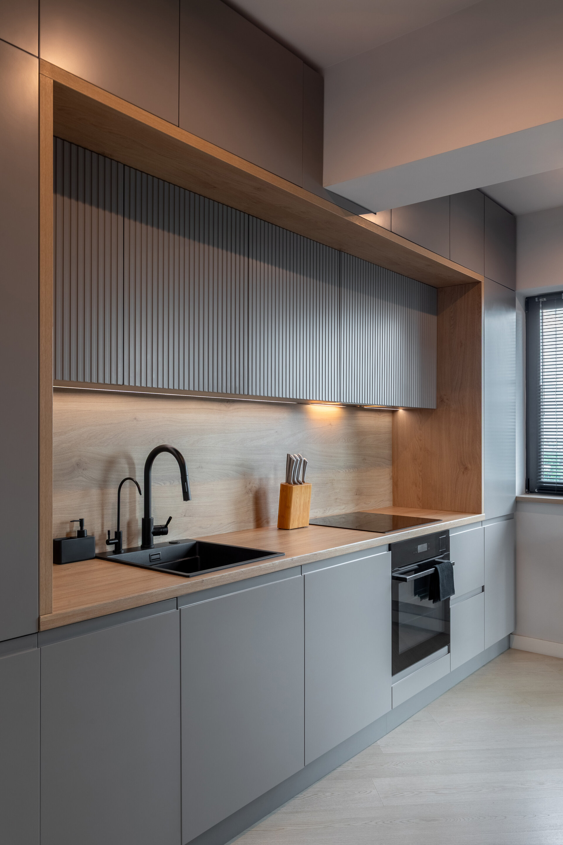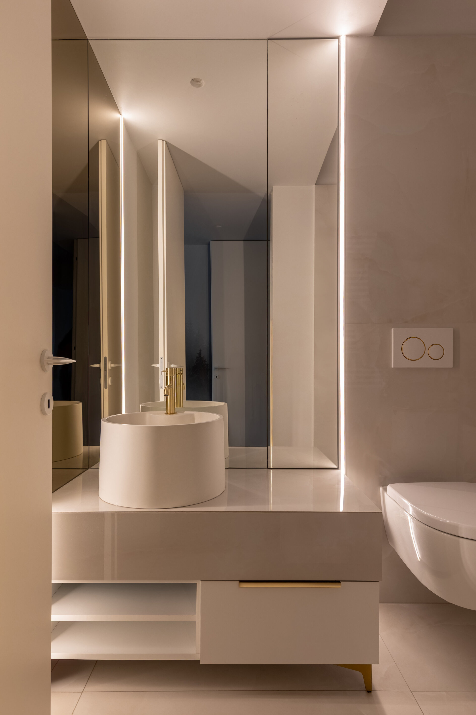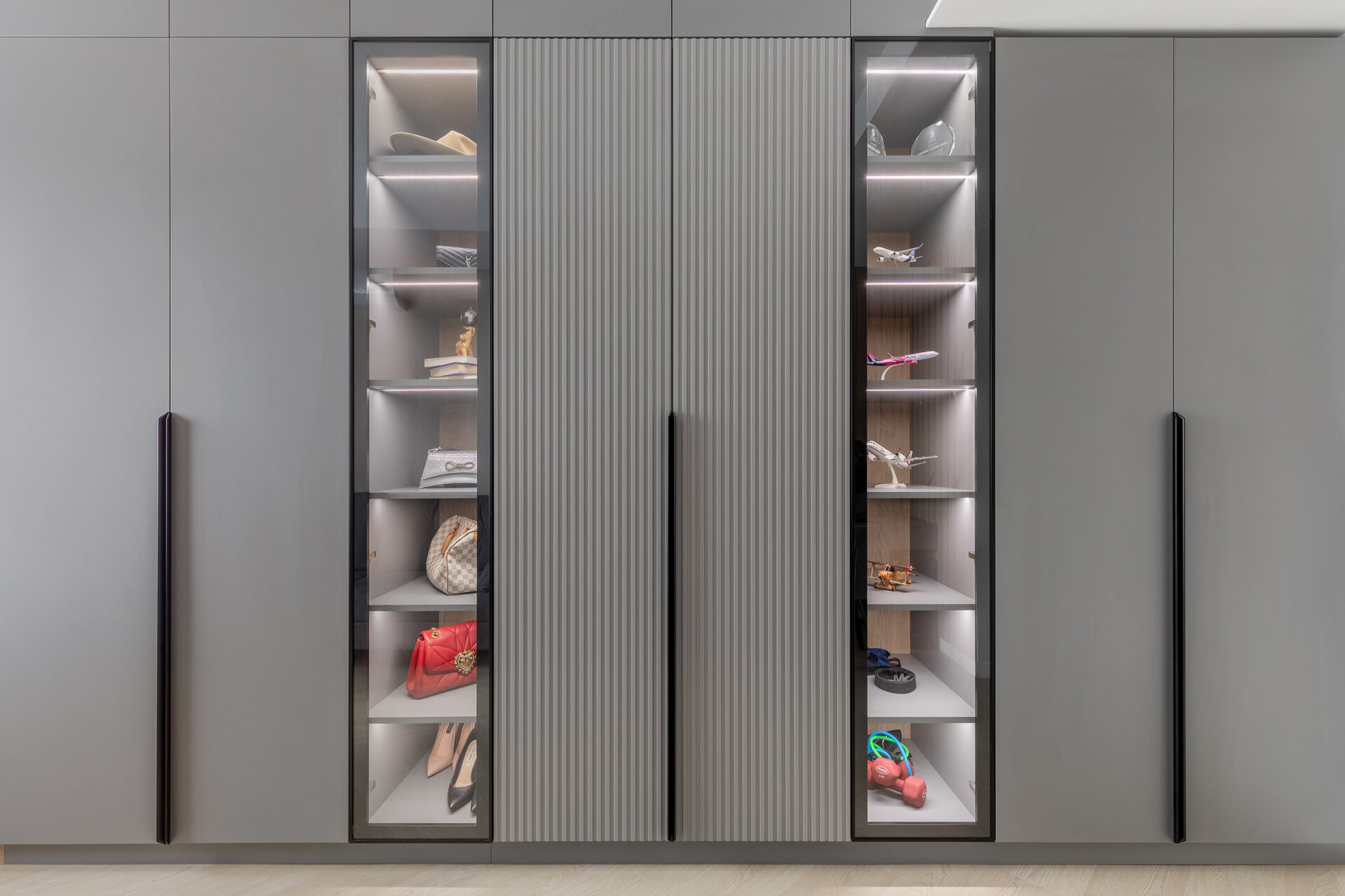 The apartment perfectly reflects their lifestyle: organized, contemporary, and at the same time, warm and inviting. The design blends neutral grey tones with bold color accents, carefully introduced to bring energy and personality to each area. Soft textures, ambient lighting, and thoughtfully selected furniture contribute to a calm and balanced atmosphere.