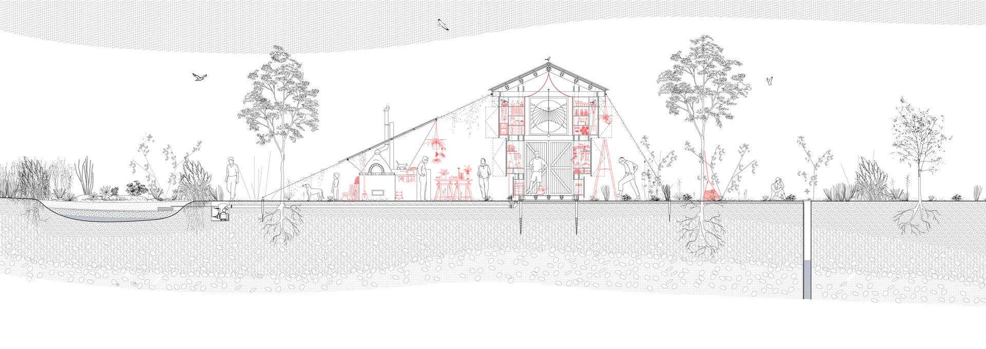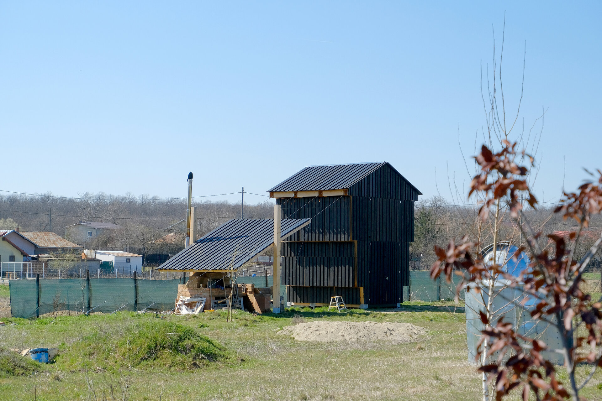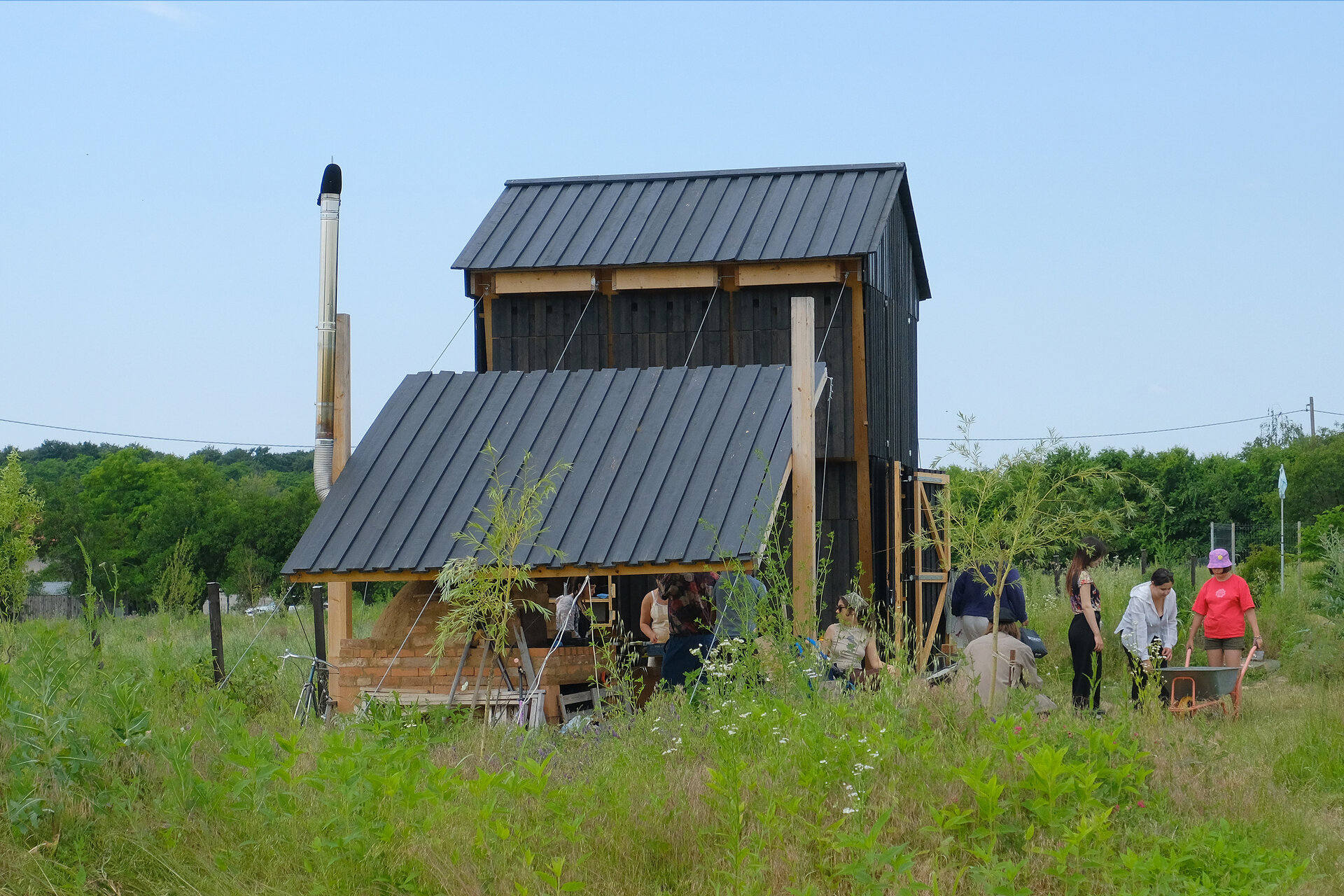 The community kitchen is located next to the Demetra oven, built by the poet Vasile Leac, and is oriented southward, establishing a direct relationship with the sun without conforming to the administrative boundaries of the plot — anticipating an opening towards the neighboring land and, further, to the village. It operates in relation with a drilled well and a phyto-epuration system, forming a circular water-use system.