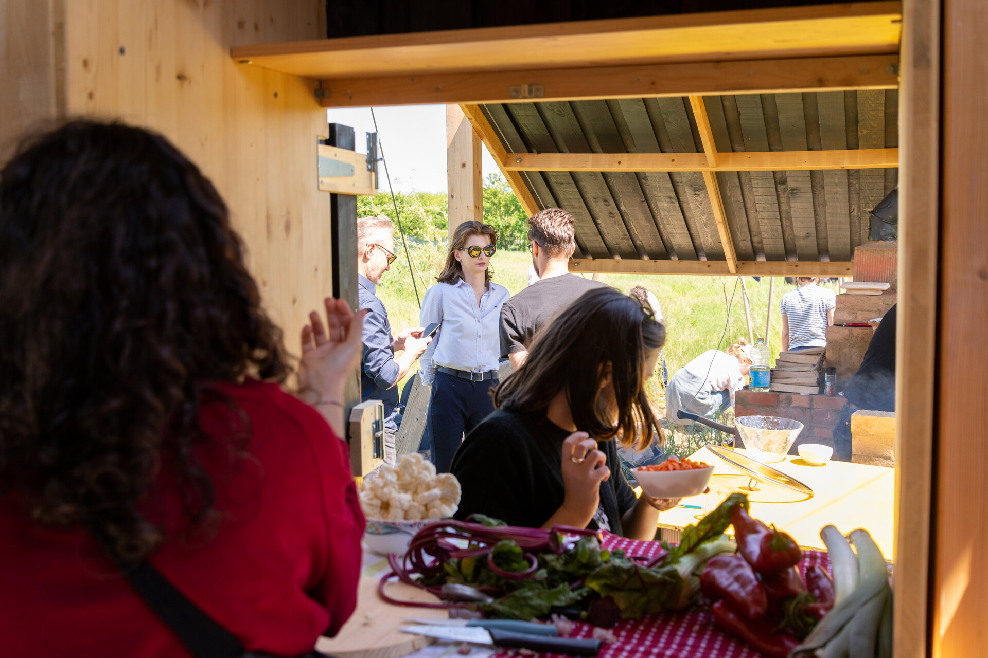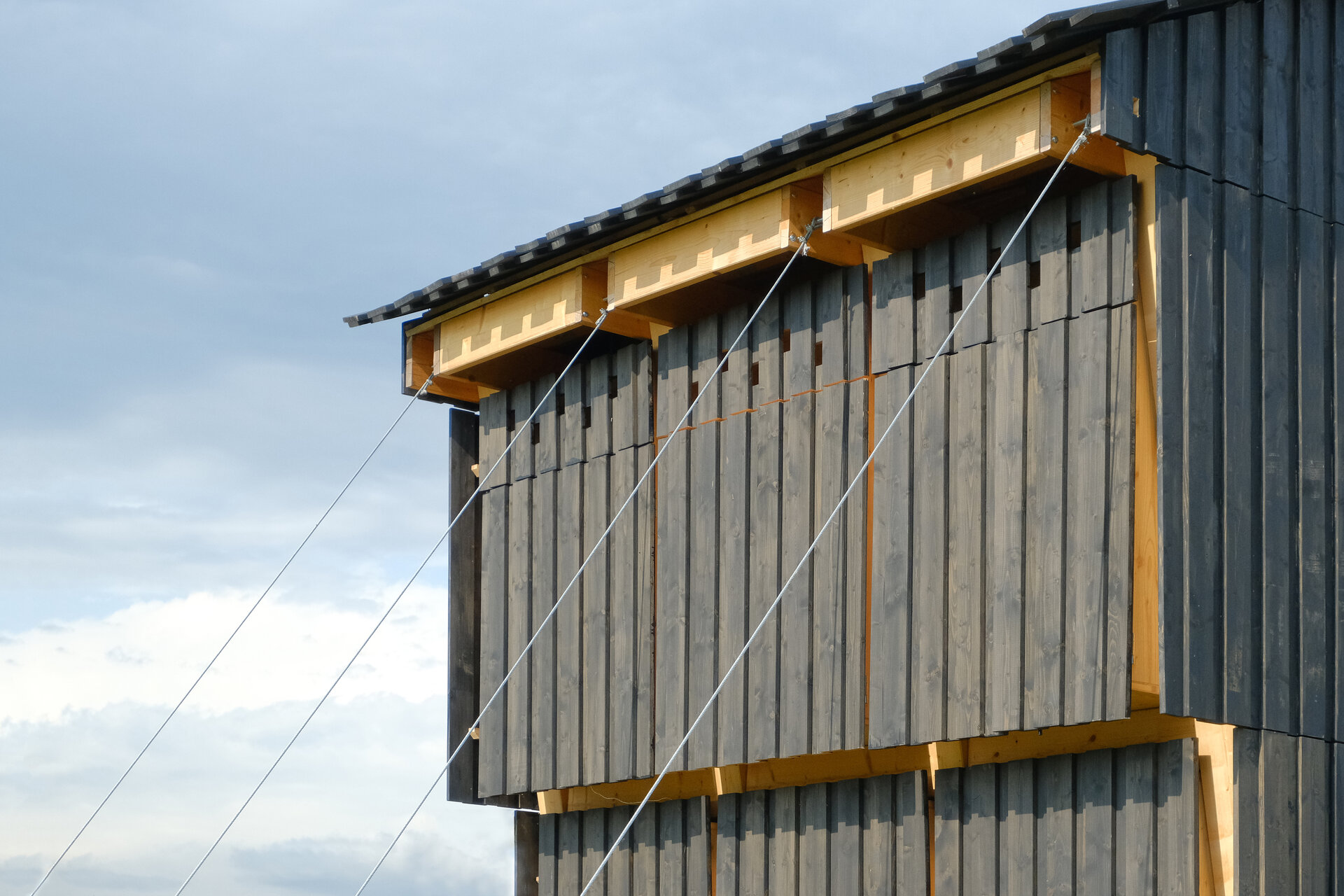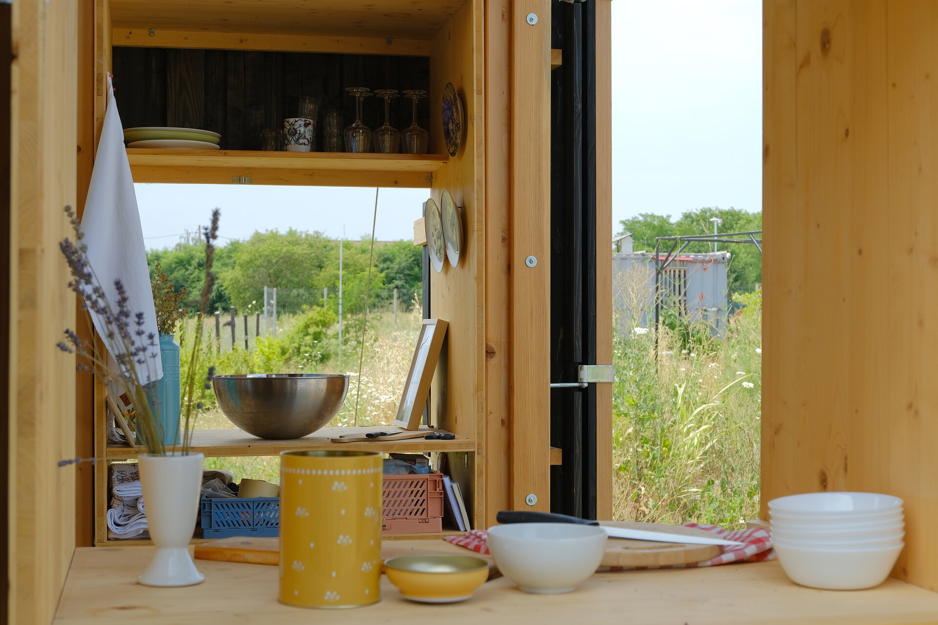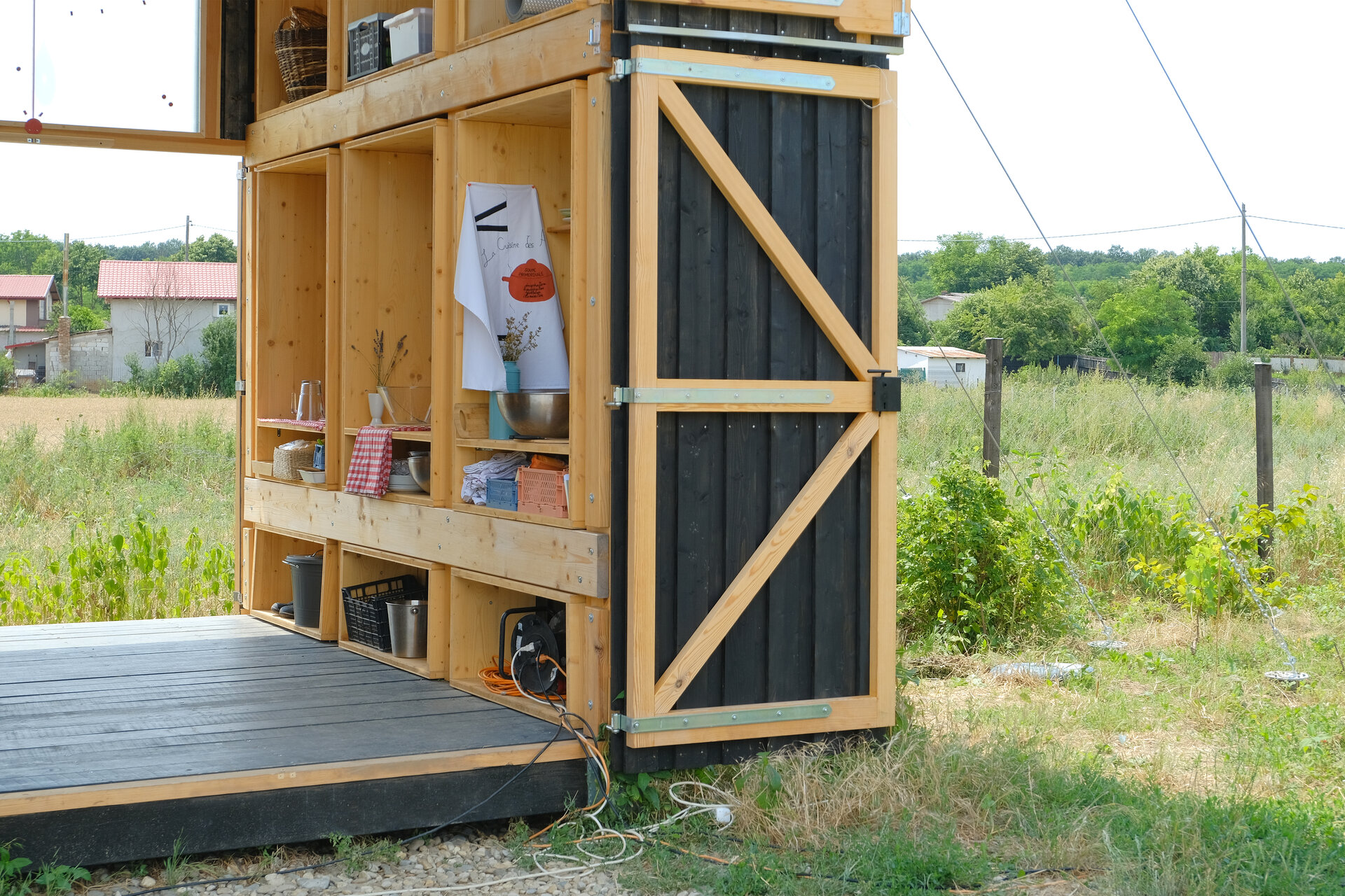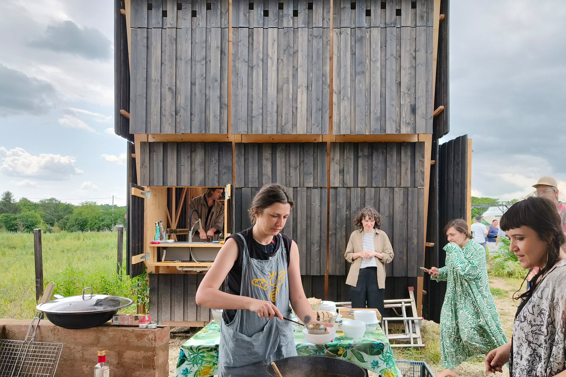 The construction sits on screw-in metal foundations that are reversible and non-invasive to the soil. The structure is entirely made of wood, composed of a primary volume that houses the kitchen and an attached lean-to structure that shelters the oven. The silhouette of the annex is extended by four steel cables on each longitudinal side, anchoring the building to the ground and defining the framework of a future pergola. At their base, climbing plants such as grapevines and beans have been planted to create shaded spaces over time.