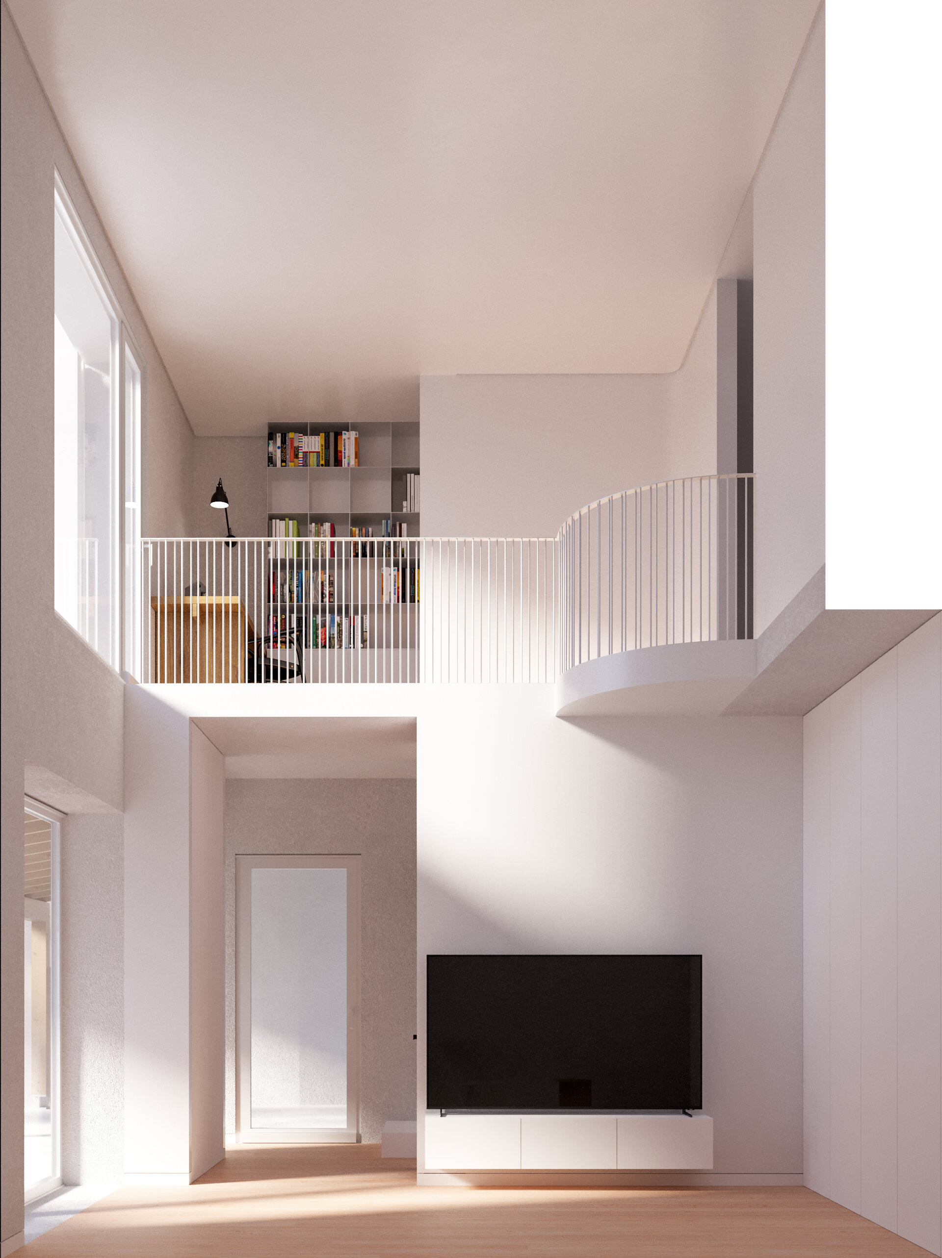 The project addresses these challenges through an introverted volumetric approach, optimizing the use of land without compromising interior comfort. The dwelling, with a maximum built area of 138 sqm, features a double-height open living area, emphasizing verticality and enhancing natural lighting. Above this living space, a mezzanine constructed from a lightweight metal structure hosts a library and workspace—an arrangement that enables future expansion, adaptable to the changing needs of the family.