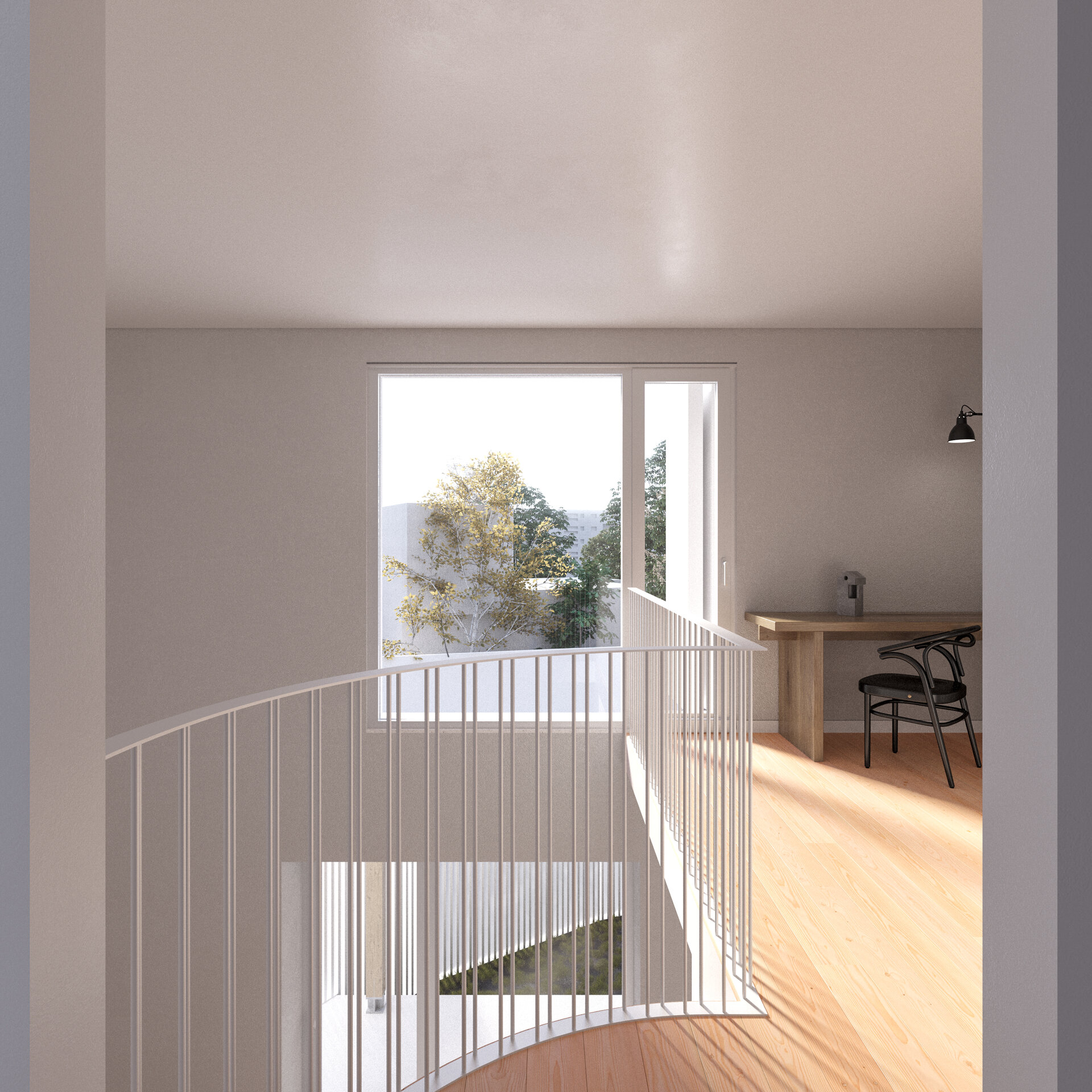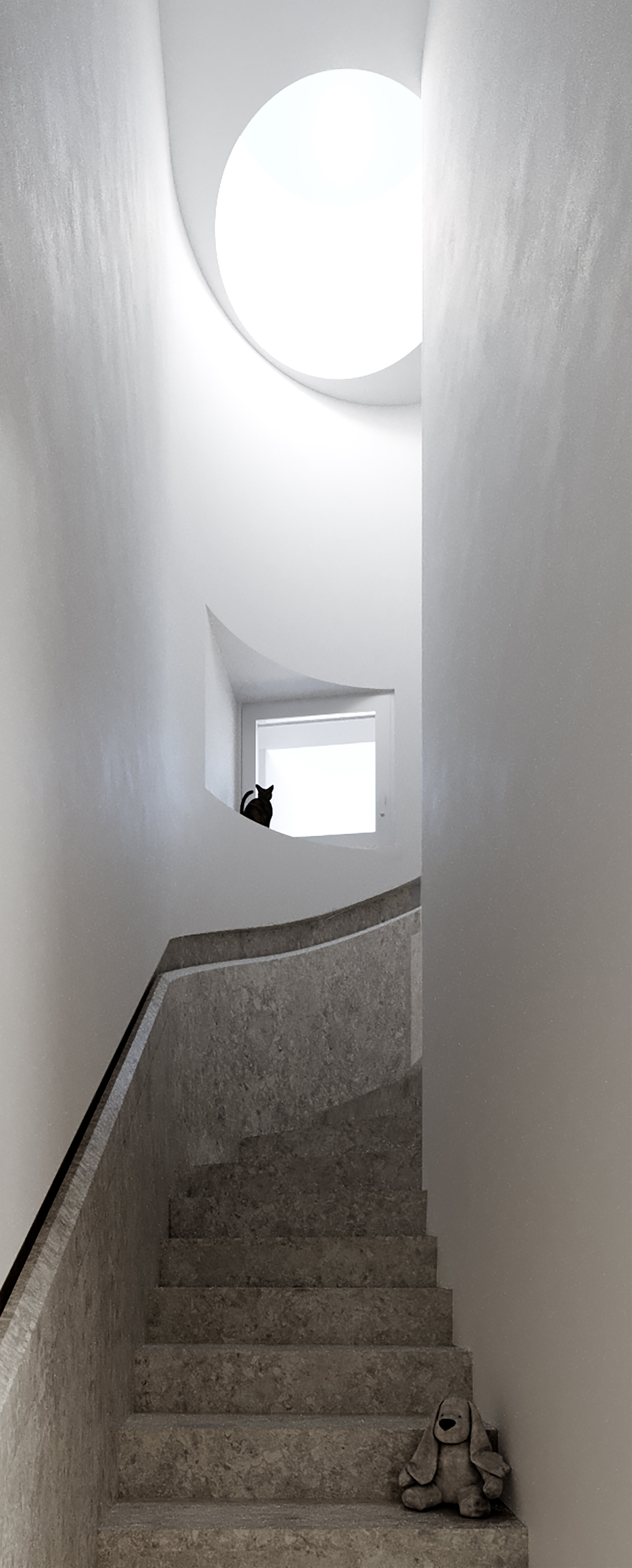 The master bedroom is located on the upper level, while vertical circulation is achieved through a balanced staircase positioned along the northern facade, contributing to the efficiency of the interior layout. Thus, the project proposes a compact and flexible dwelling integrated into the urban context and tailored to the requirements of a young family embarking on their new life journey.