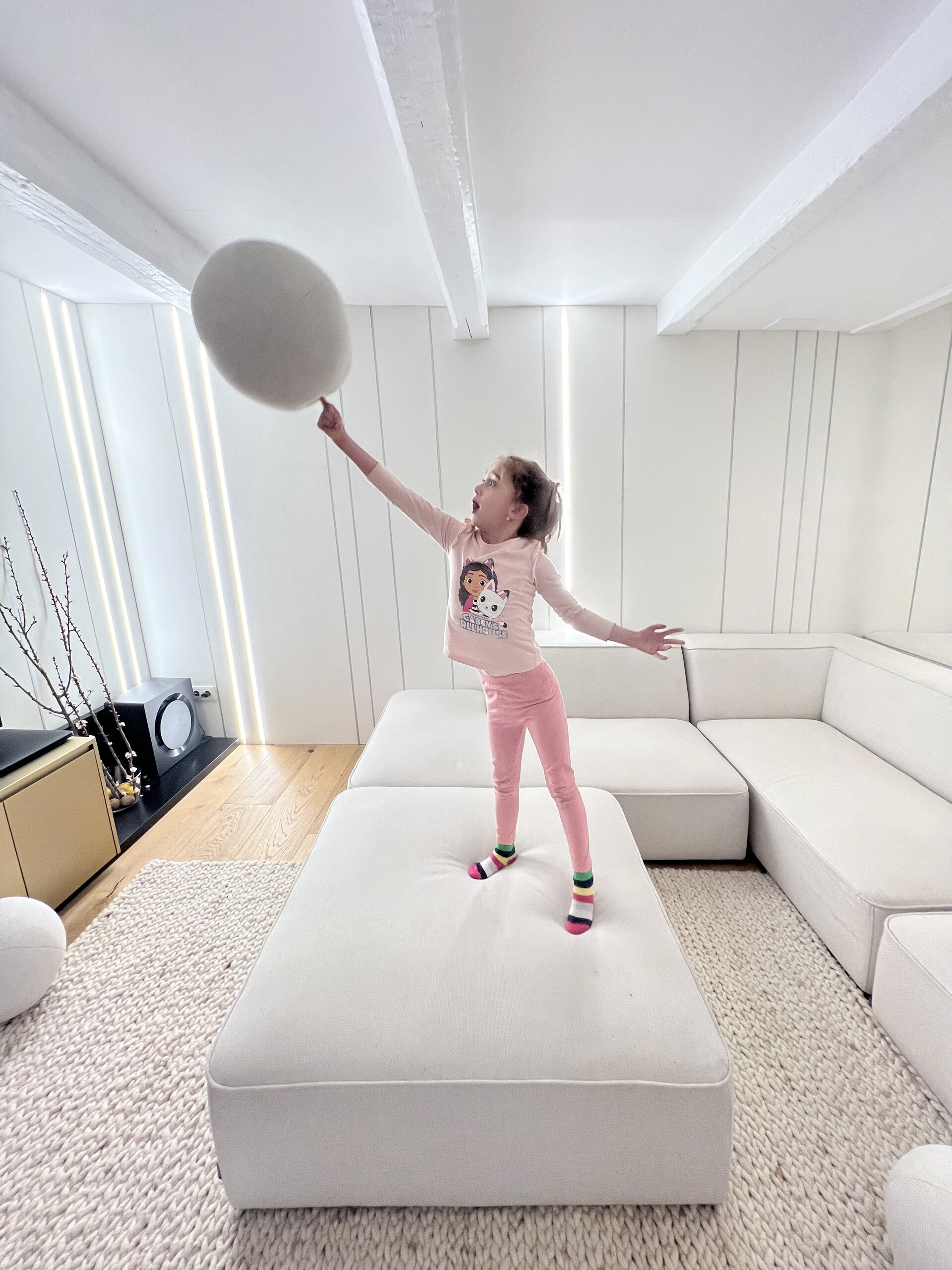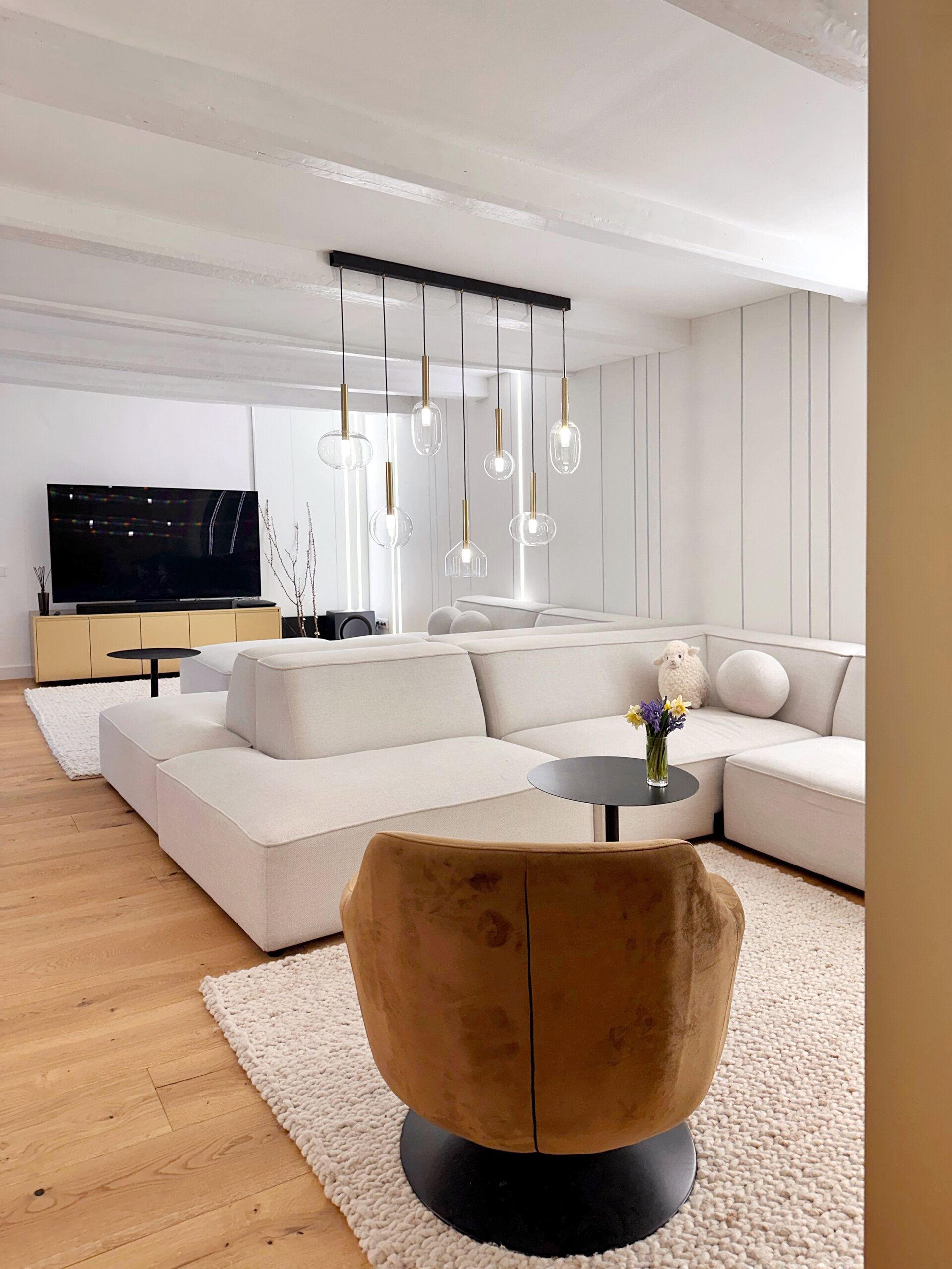 On the ground floor, the living room breathes in two distinct registers, separated by a curtain of light. An enigmatic library, with handleless doors and a magnetic opening system, hides literary treasures. The former main entrance becomes a calm alcove, a retreat facing the wide garden window, a bridge between inside and out. The kitchen includes a quiet nook with a small sofa, and light playfully marks the dining area as a place of dialogue.
