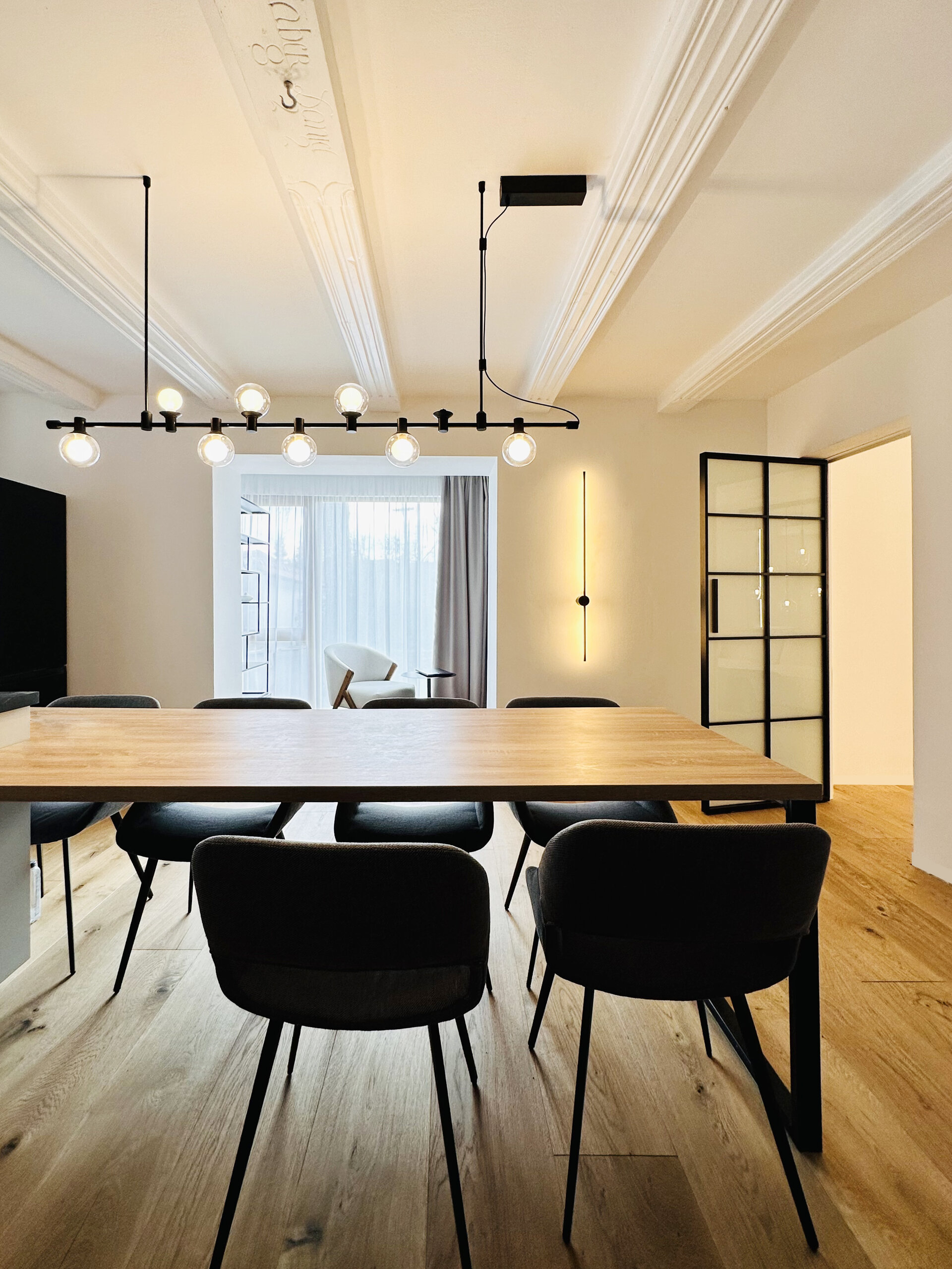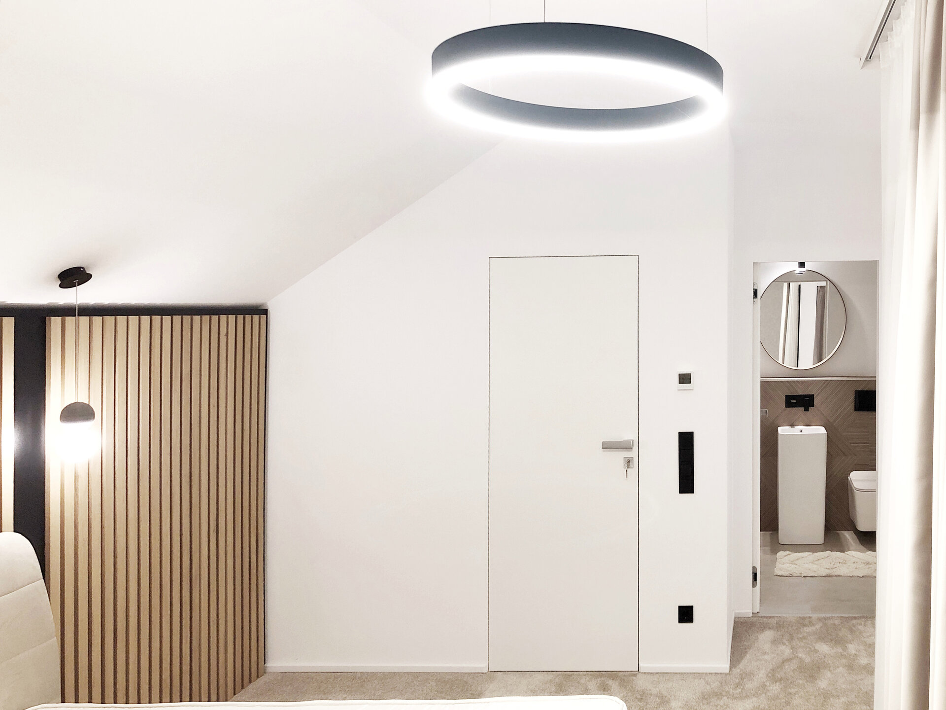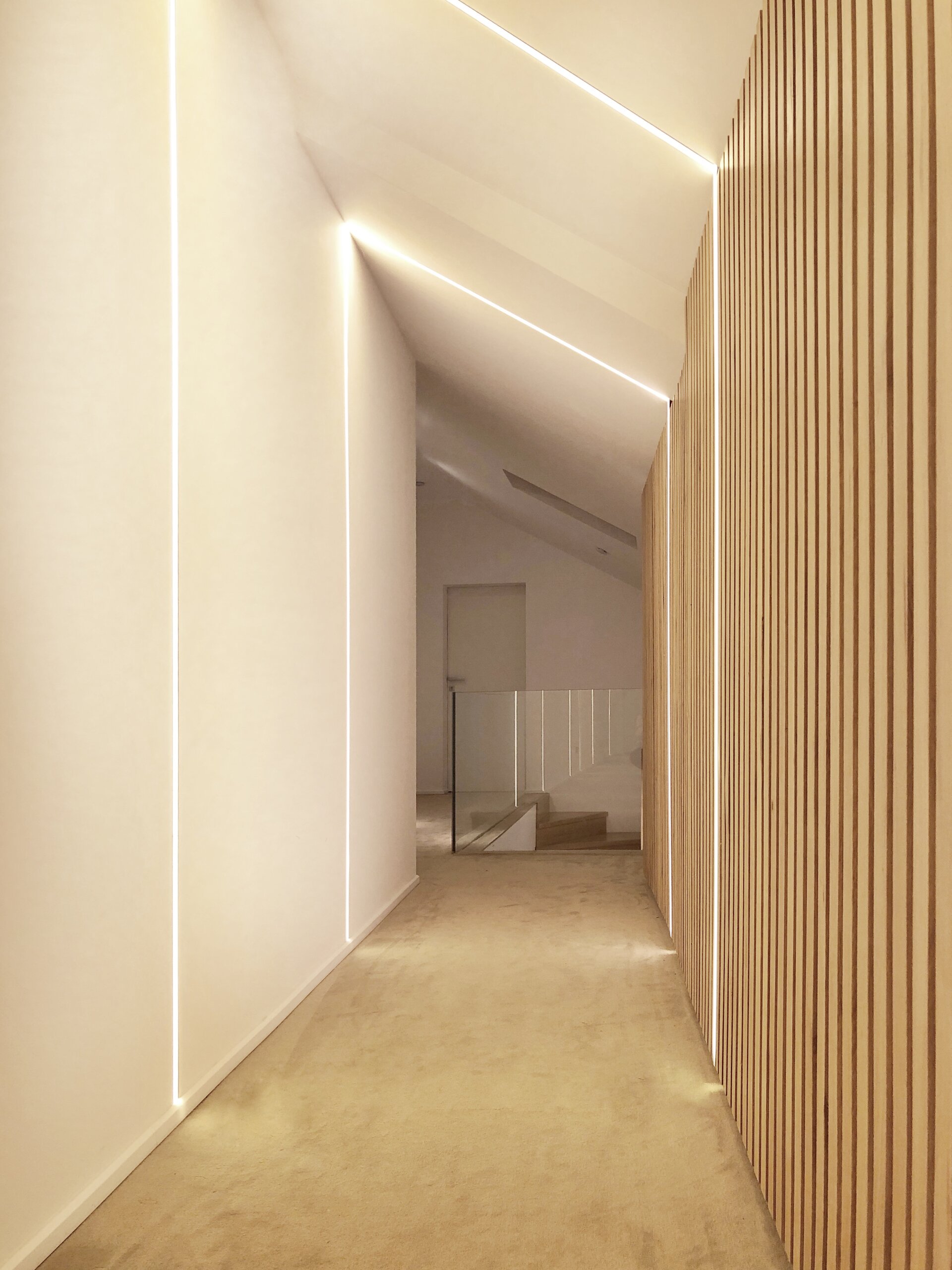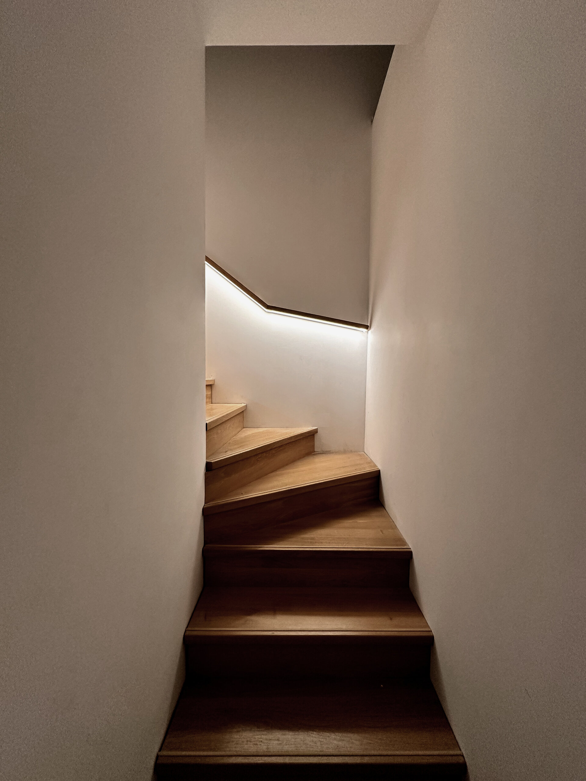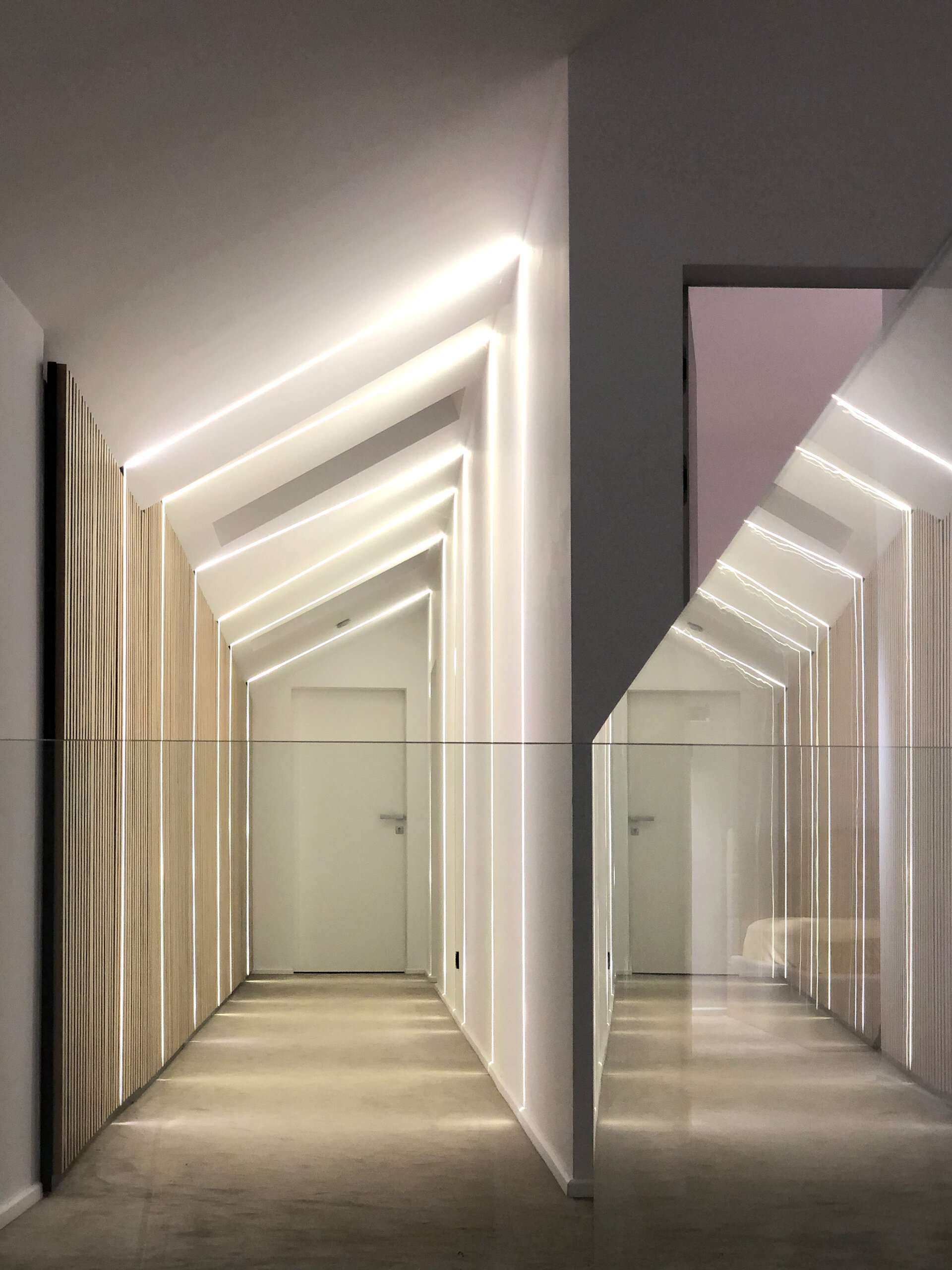 The staircase railing hides a warm light that accompanies the ascent to the attic like a silent narrative thread. In the hallways, lighting not only guides but tells a story, each corner announced, each pause invited. Ceiling spotlights create moments of reflection before artworks, while LED strips unfold like quiet portals, marking spatial continuity.