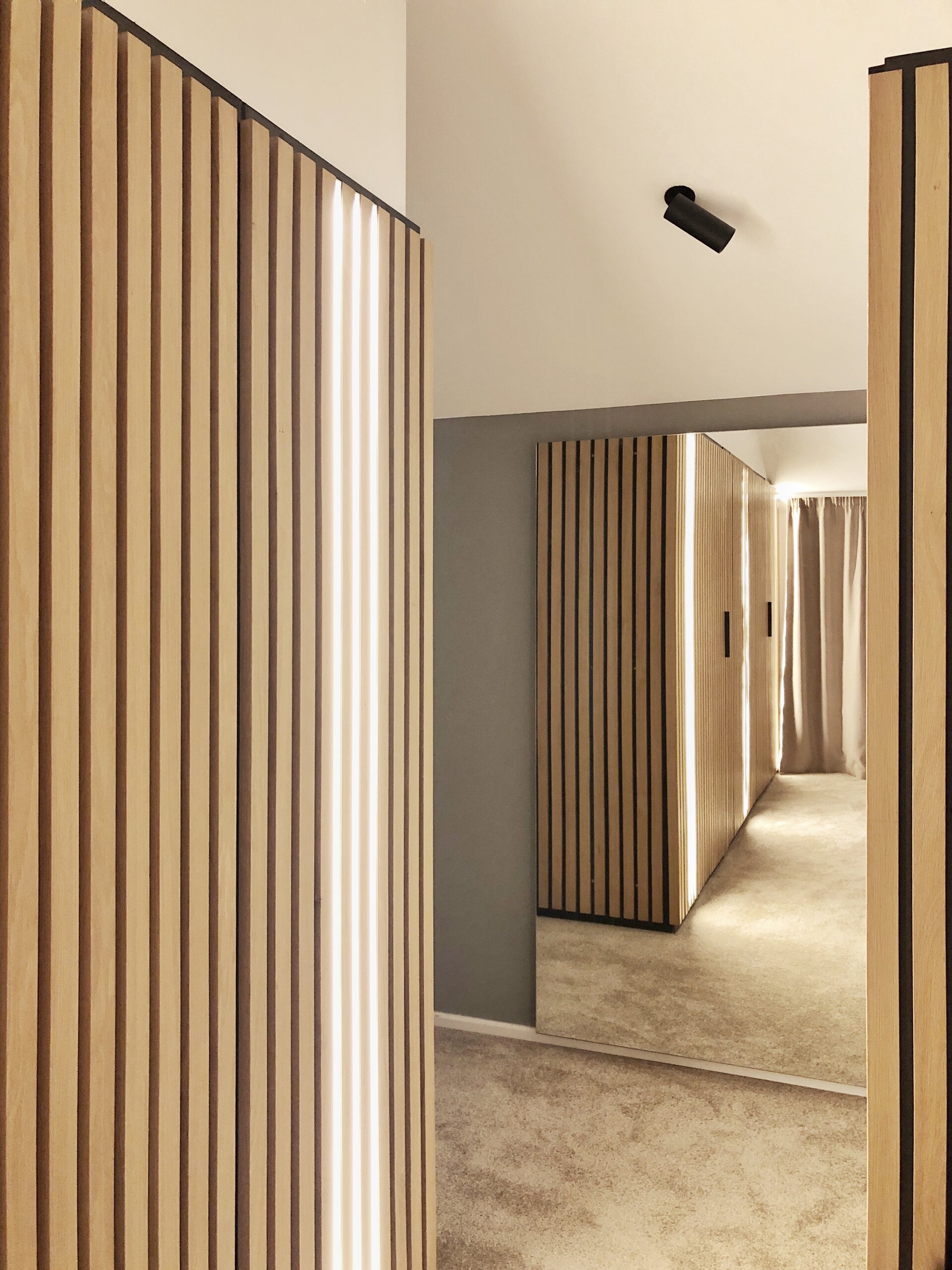 The hallways, partially clad in slatted wood, become corridors of surprise, elegantly concealing technical spaces and distribution panels. Living becomes a subtle exploration of space, where functionality and aesthetics intertwine harmoniously.