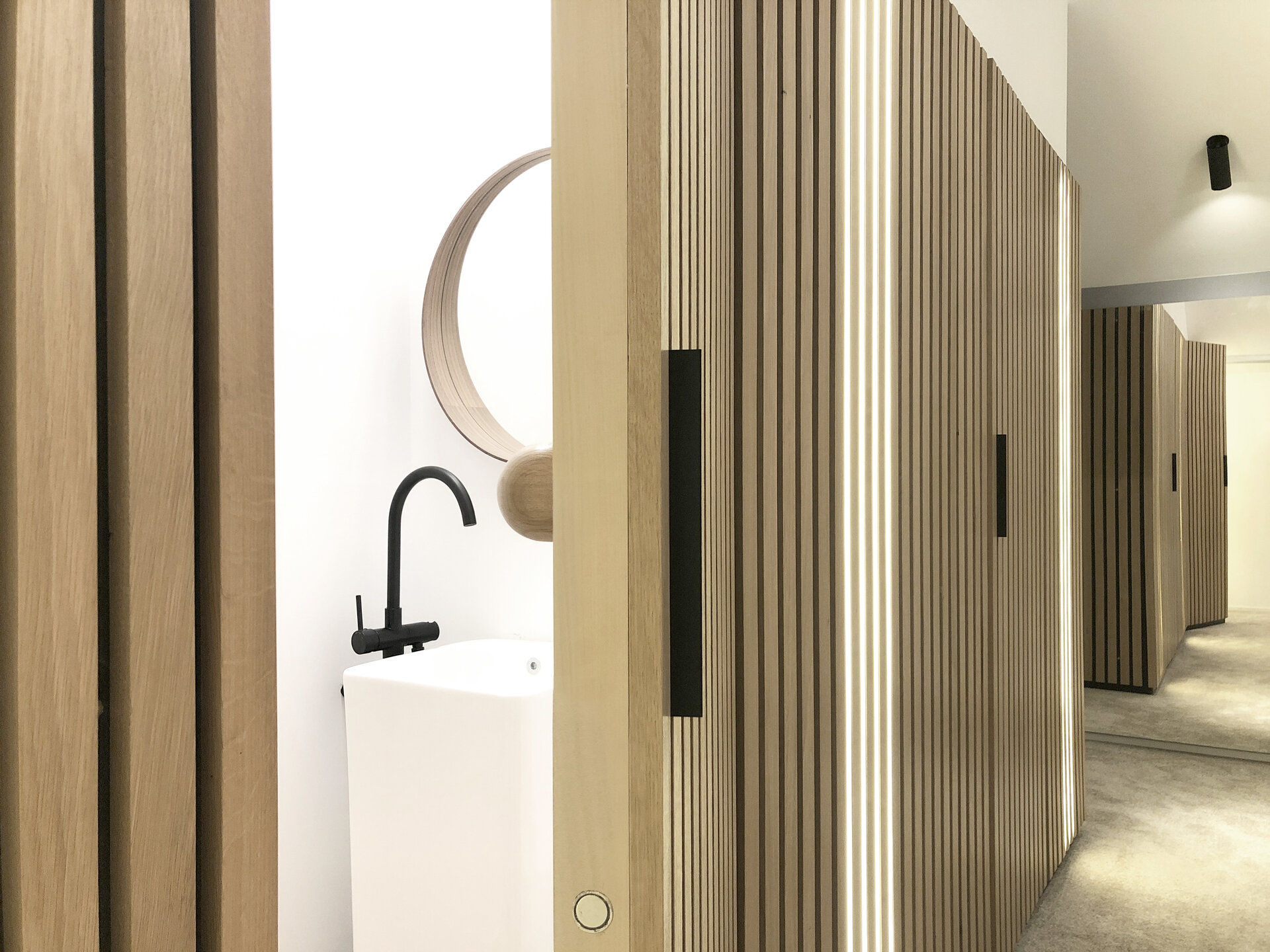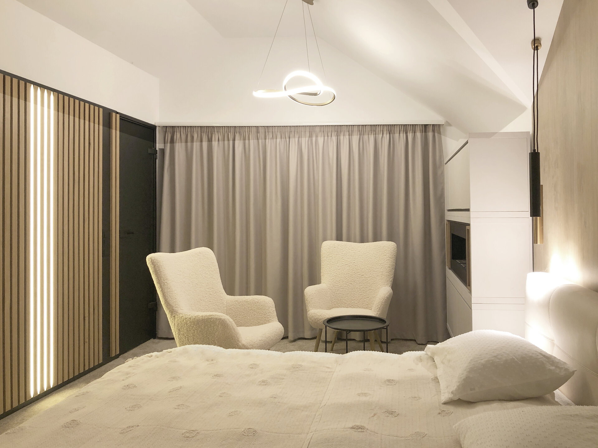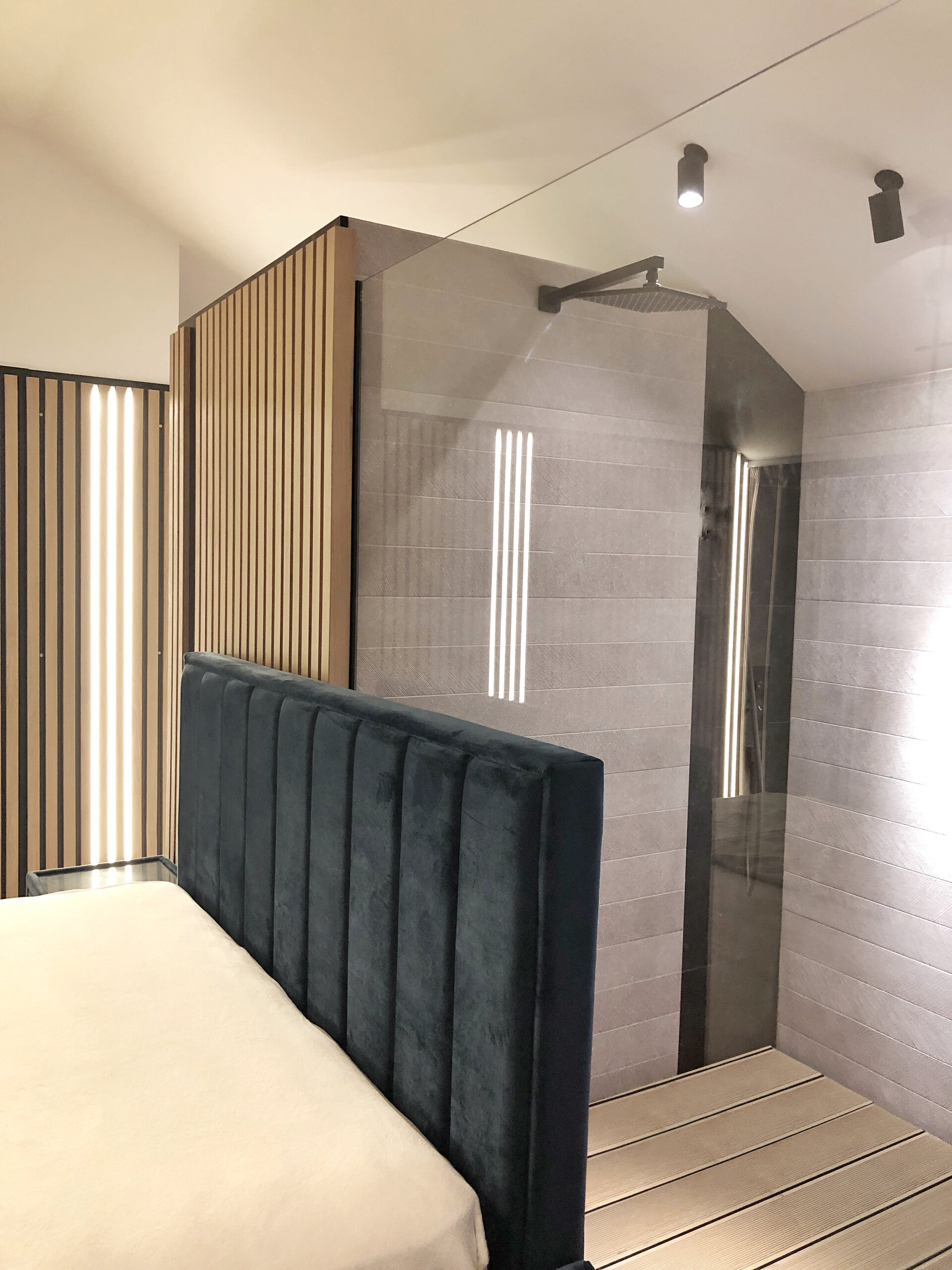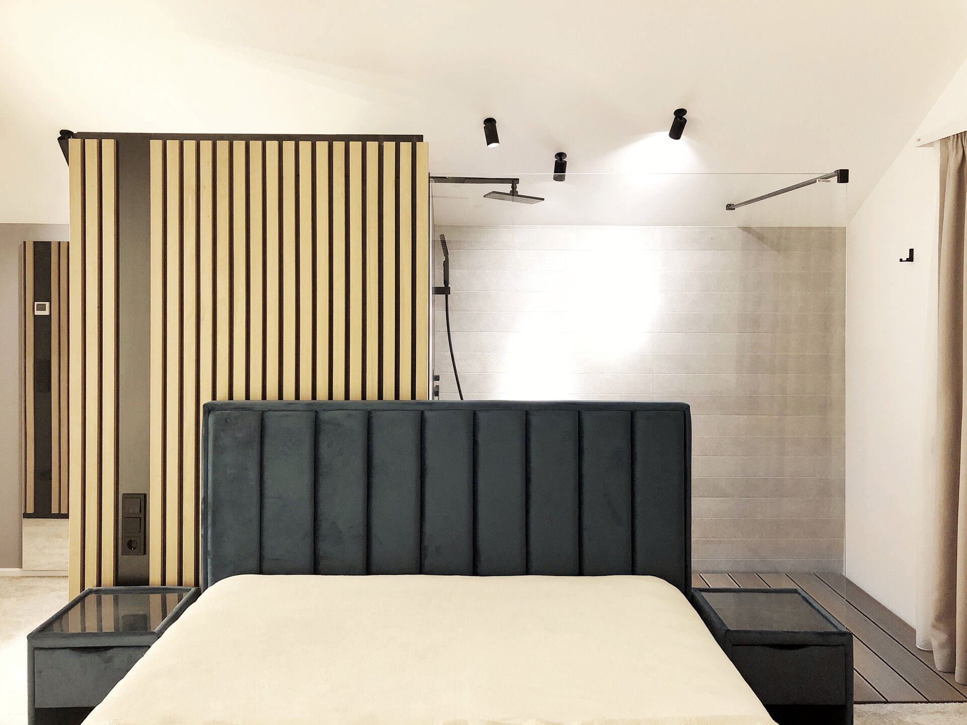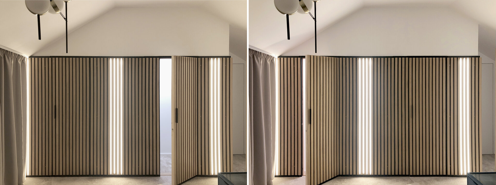 In the attic rooms, bathrooms retreat discreetly behind double walls, invisible at first glance but accessible to those who know the secret of hidden handles. Slatted panels and vertical light bands conceal these entries, softening service spaces under a coherent aesthetic where rhythm, material, and light form a calm, sophisticated language. In one room, an open shower behind the bed, separated by a glass wall, becomes a sculptural, poetic, and functional gesture.