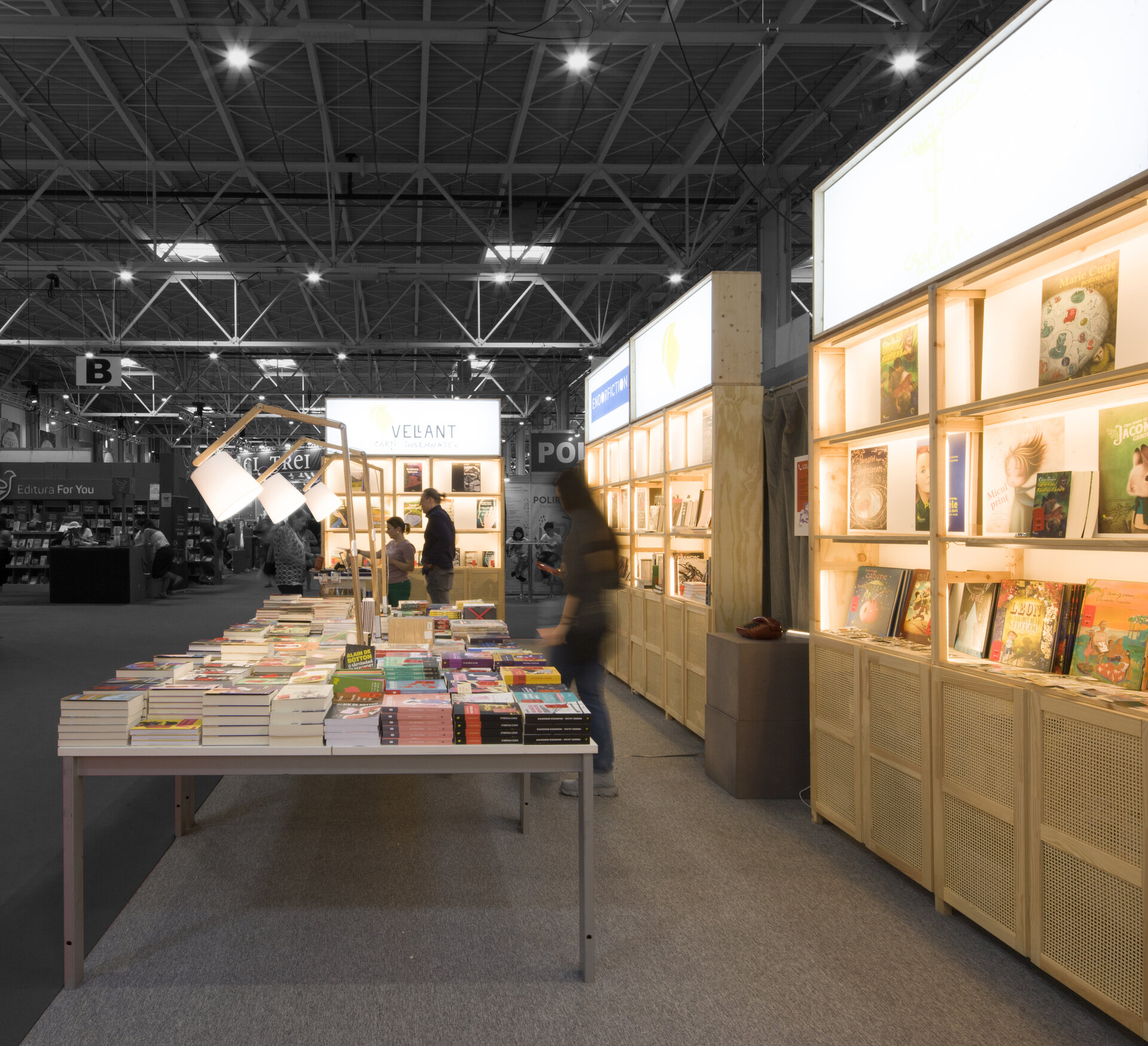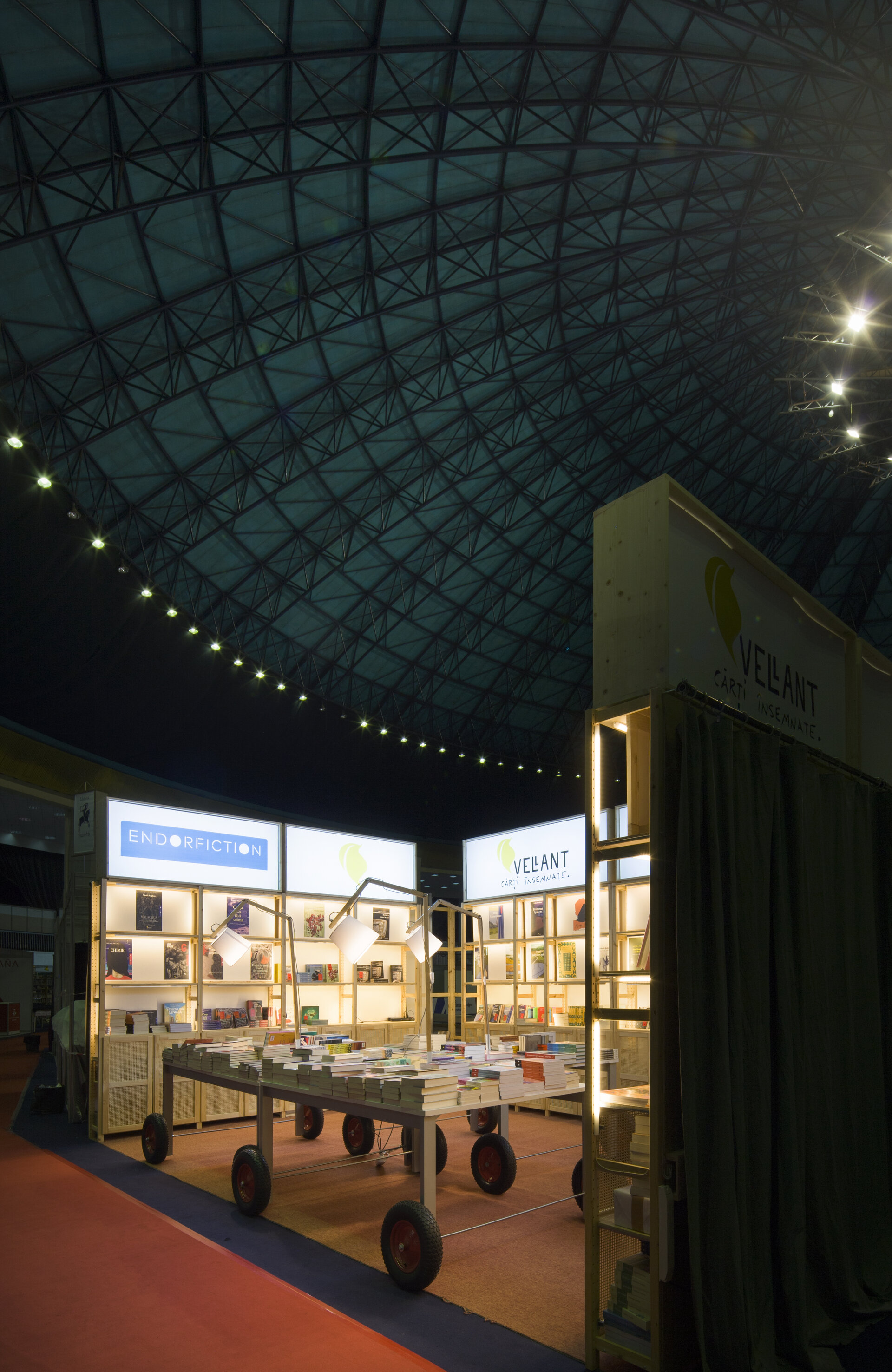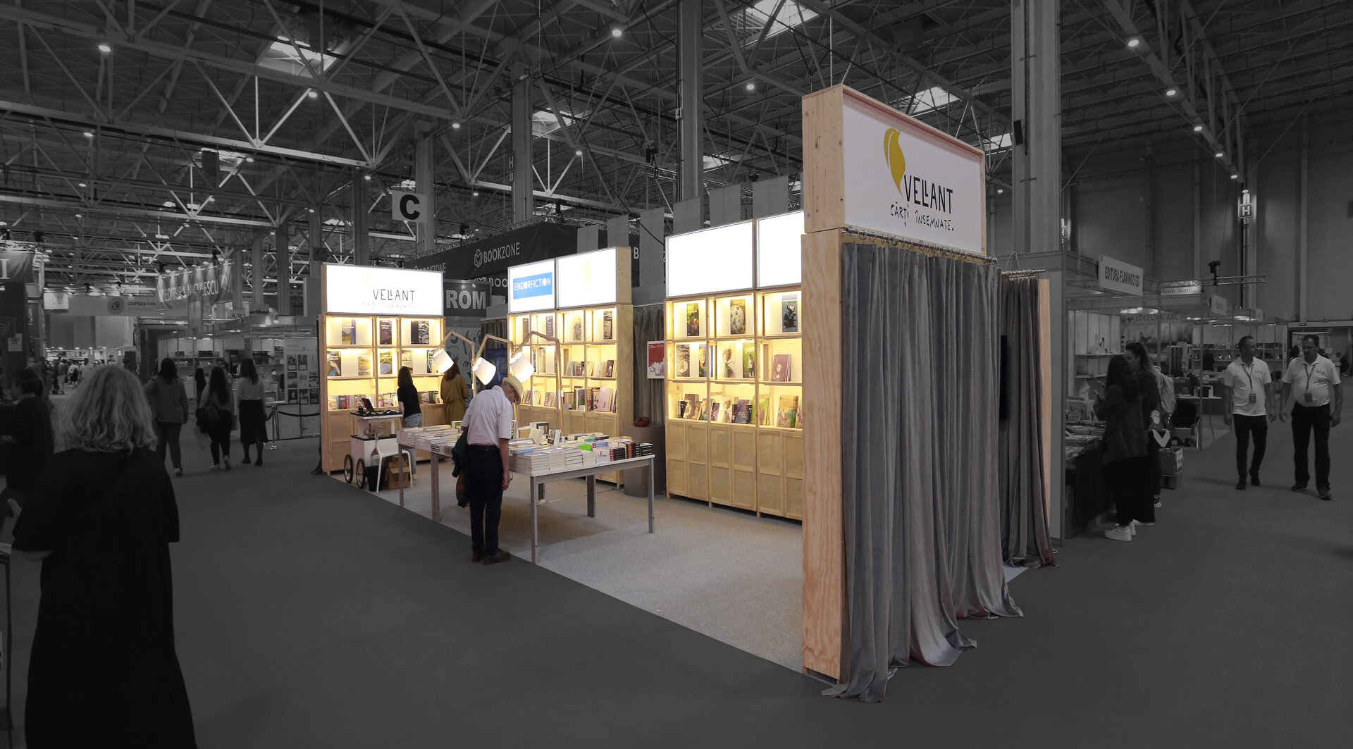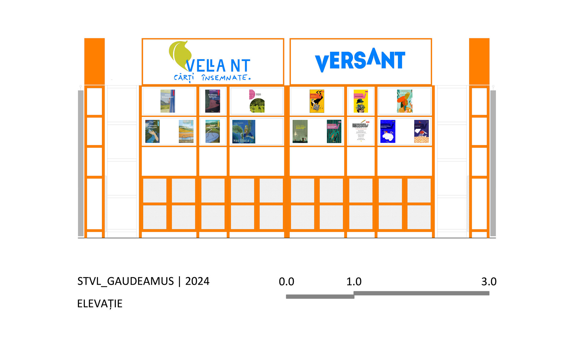 Proiectul prezintă două versiuni de reconfigurare ale proiectului modular de stand al editurii Vellant construit inițial în 2023, pentru târgul de carte „Bookfest”.