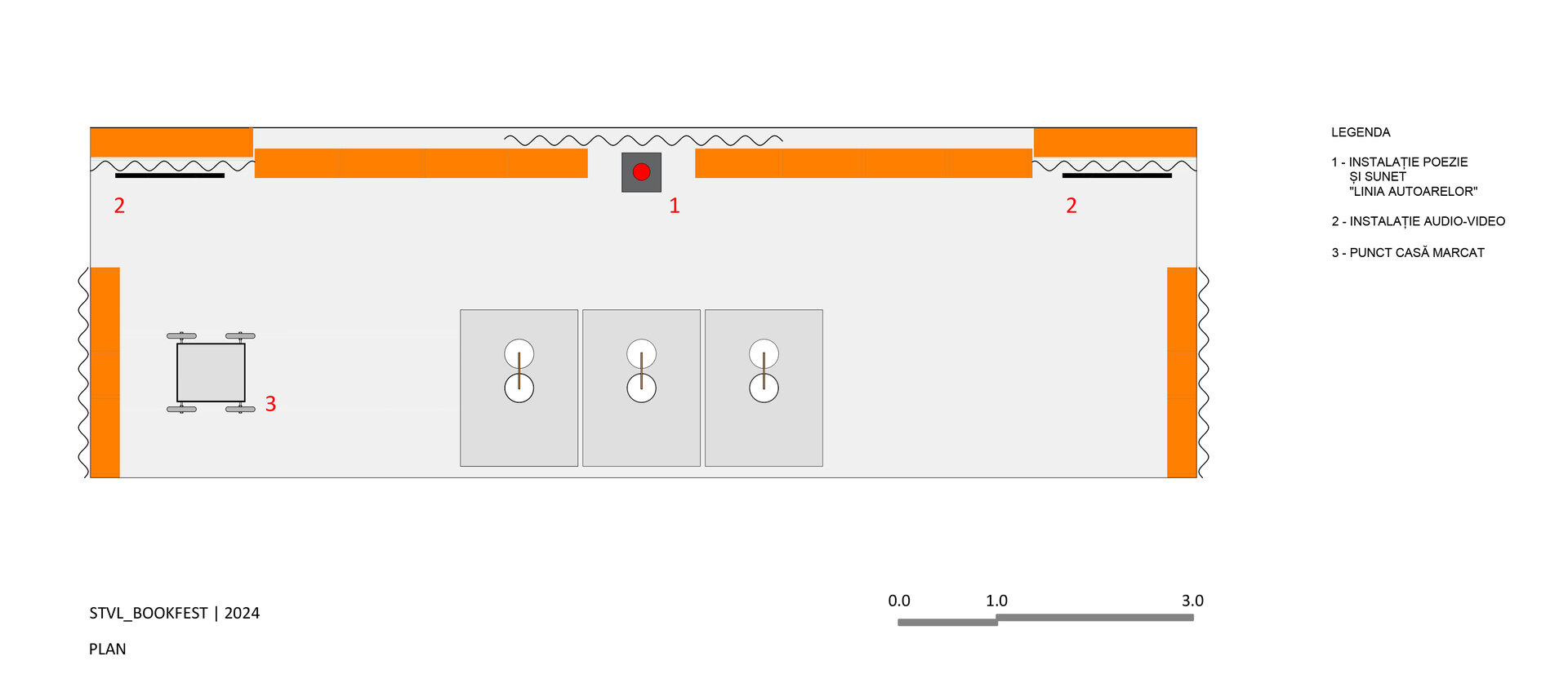 În mai 2024, sistemul modular al standului a integrat, în cadrul târgului de carte „Bookfest”, un sistem multimedia - instalația de sunet și poezie „Linia Autoarelor” - redată pe un telefon fix analogic și doua proiecții video care rulau pe ecrane TV (1.10 x 0.60 m).