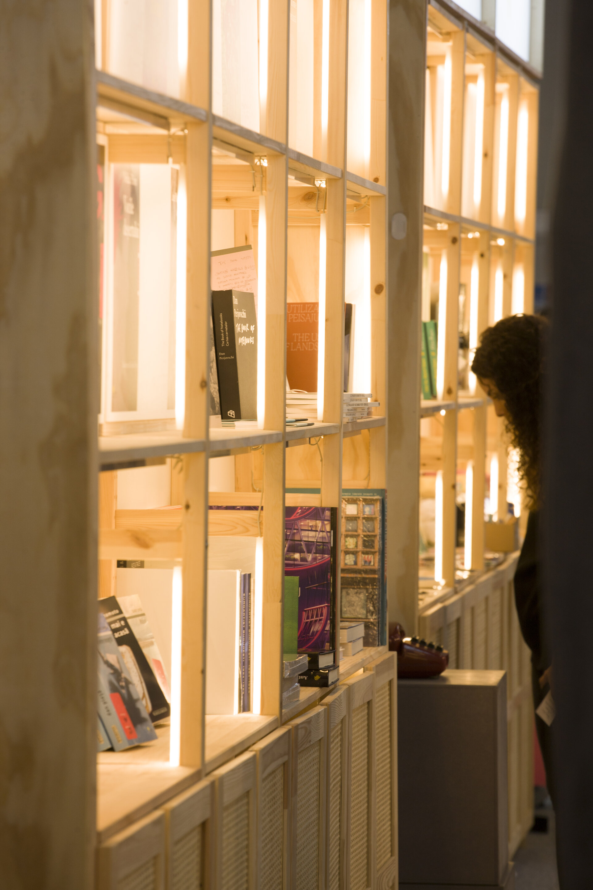 Spațiul se închidea pe 3 laturi cu module de raft de 83 x 43 cm, având o singură latură care intermedia relația cu utilizatorii, alcătuită din 3 mese albe de expunere, pe roți, de 1.2 x 1.6 m . Zonele de colț erau alcătuite din vincluri permeabile vizual, modulate din cadre din lemn de 2.26 x 0.5 m, cu rol de articulație pentru cele 4 module existente.