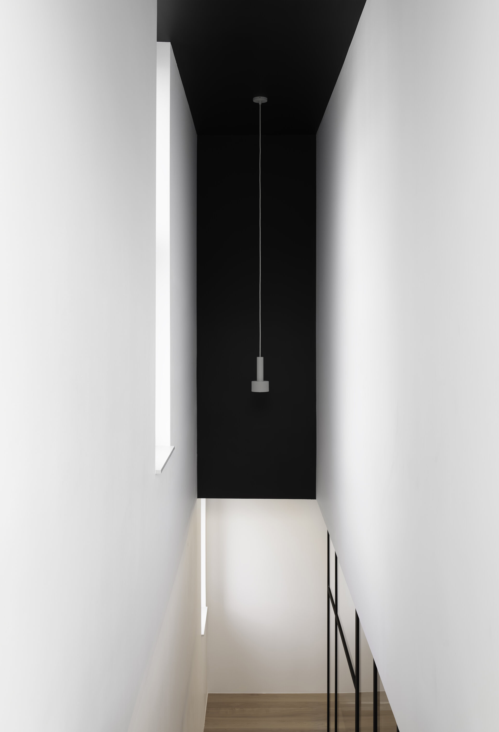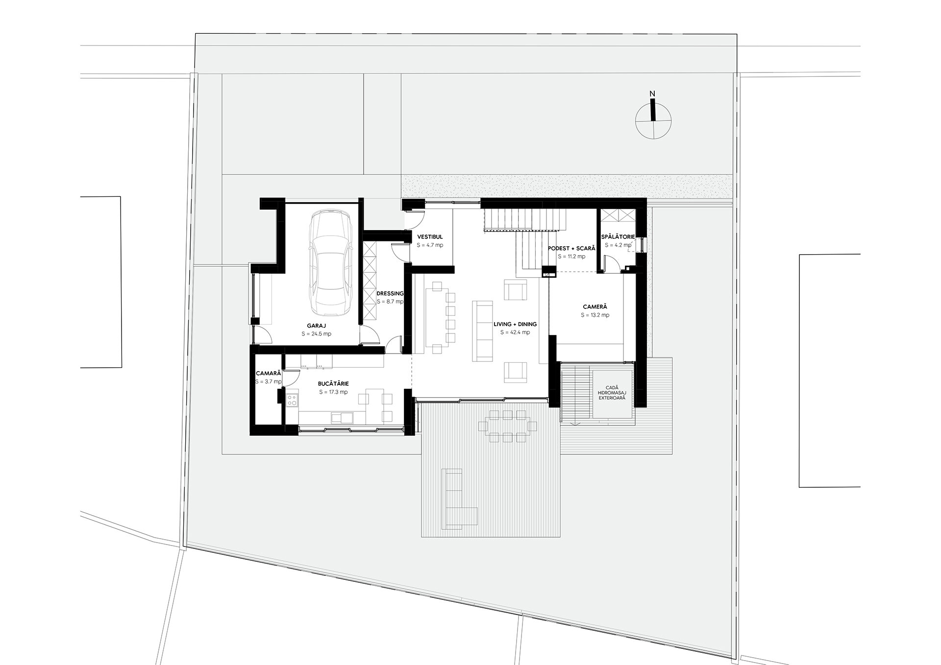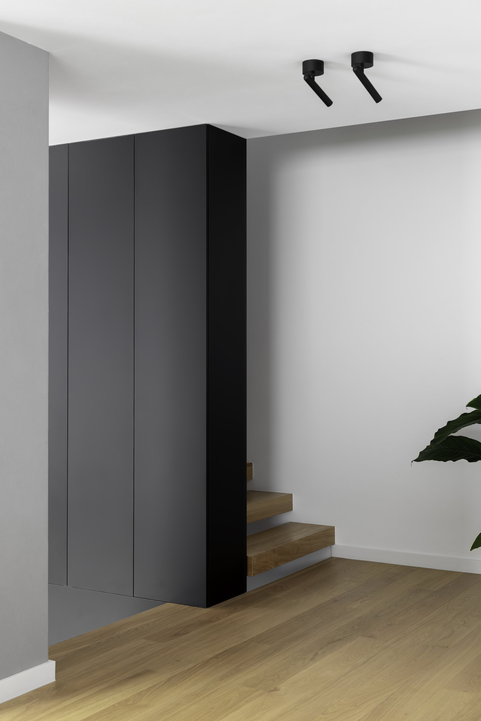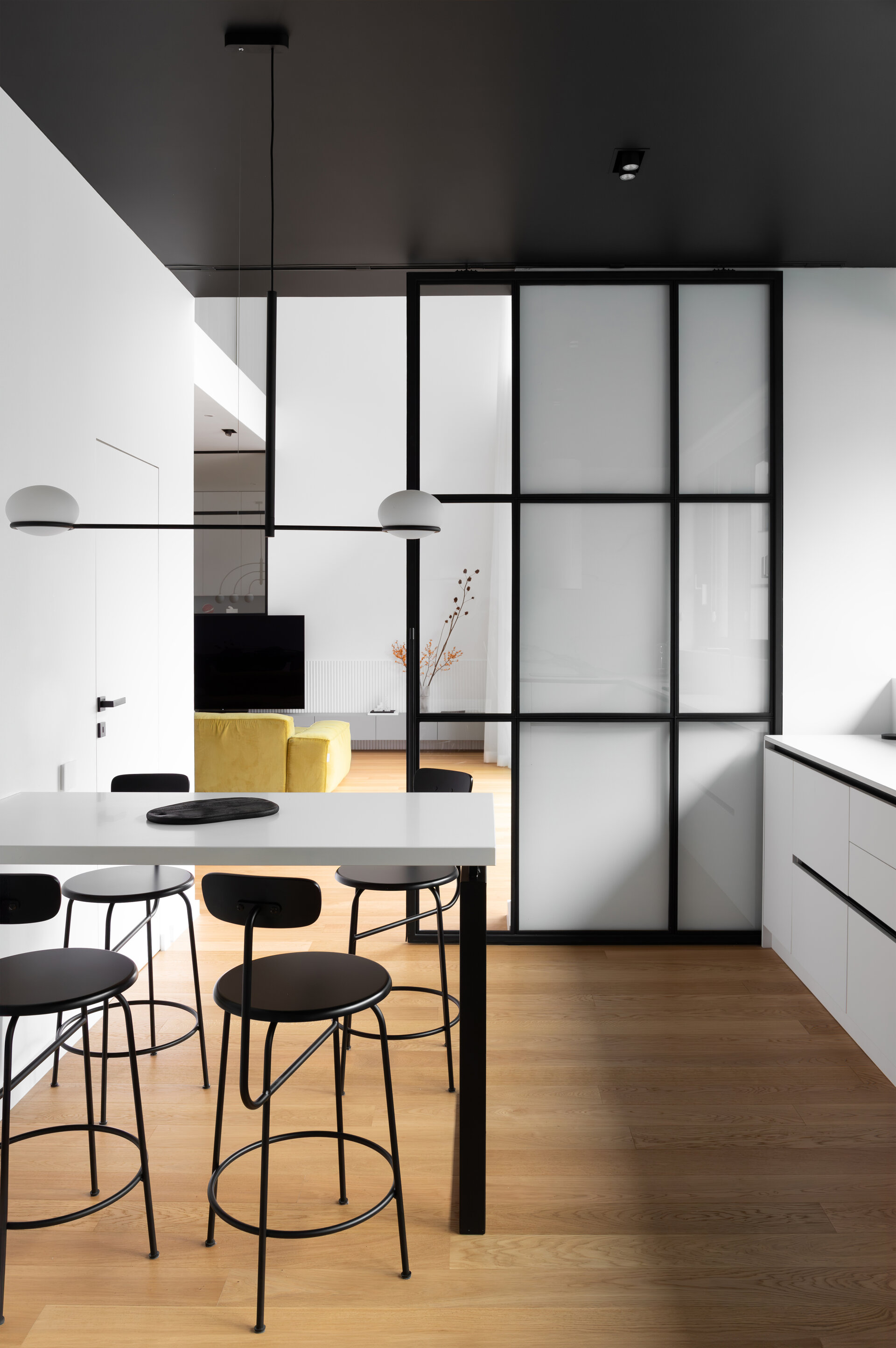 În final, amenajarea de interior este dominată de volumetrii simple și curate, iar din punct de vedere cromatic predomină albul, negrul și nuanțele de gri, realizându-se astfel o coerență între aspectul exterior și atmosfera interioară. Pardoseala finisată cu parchet stratificat apare ca un element complementar cu un plus de căldură în amenajare.