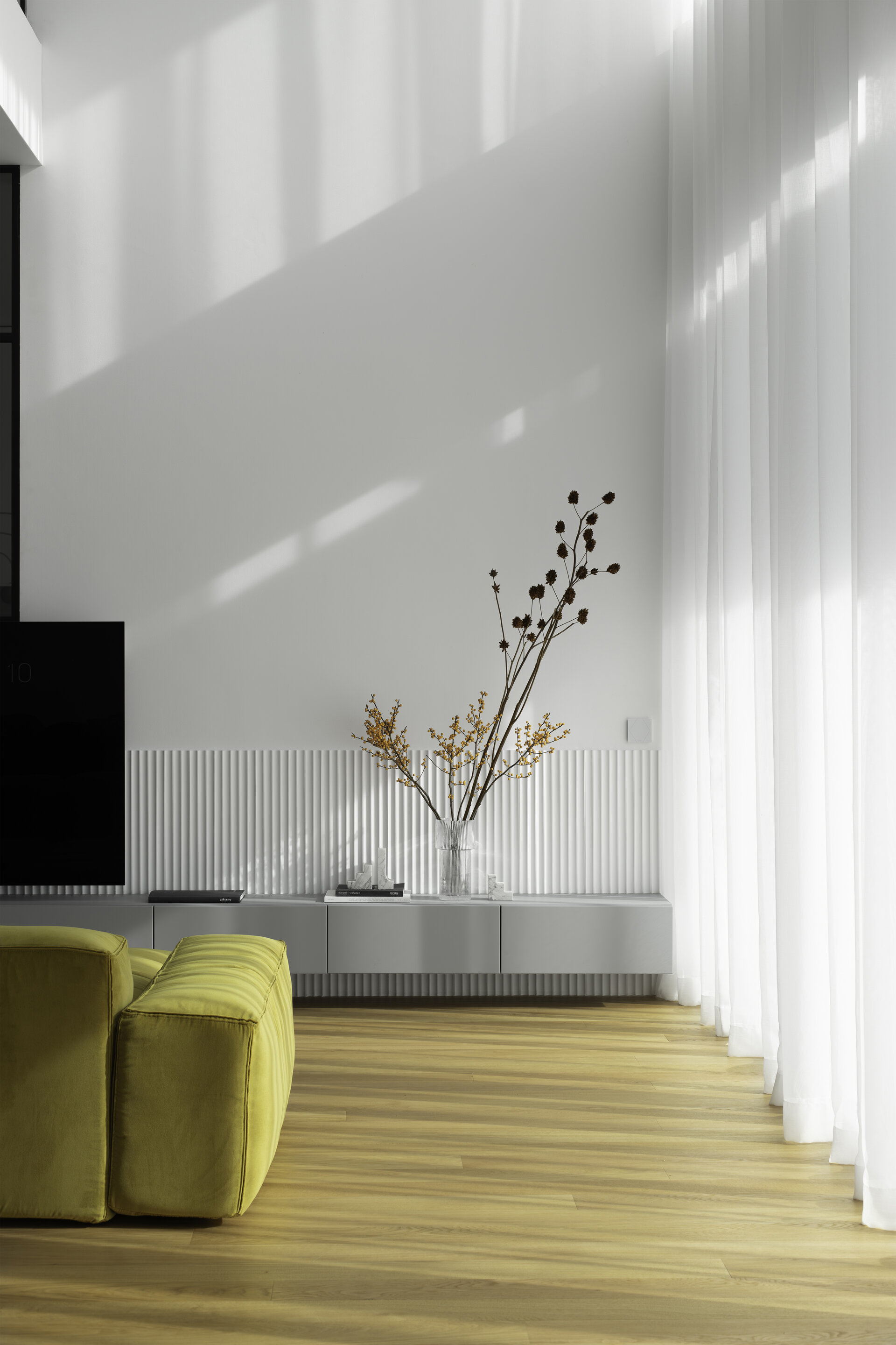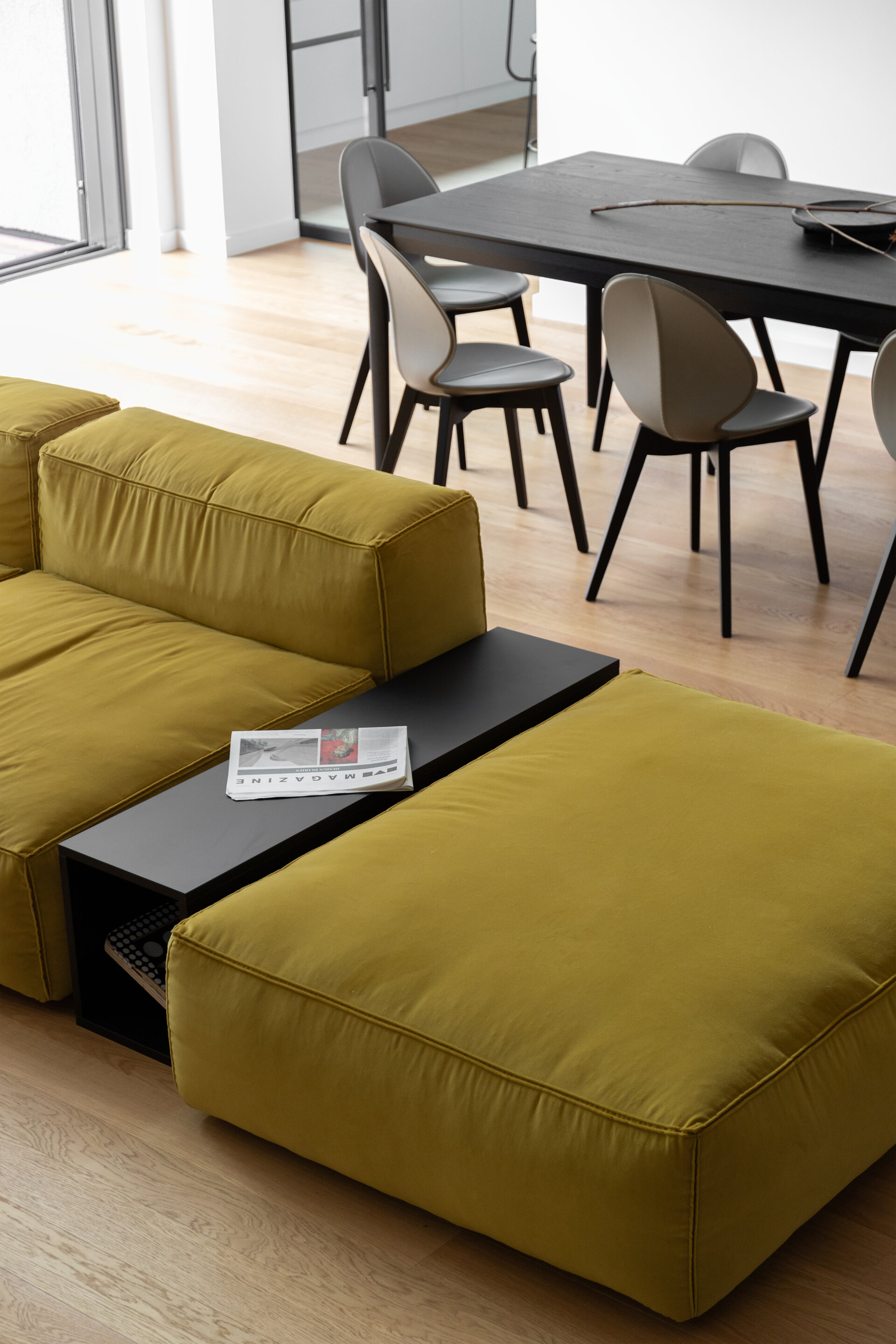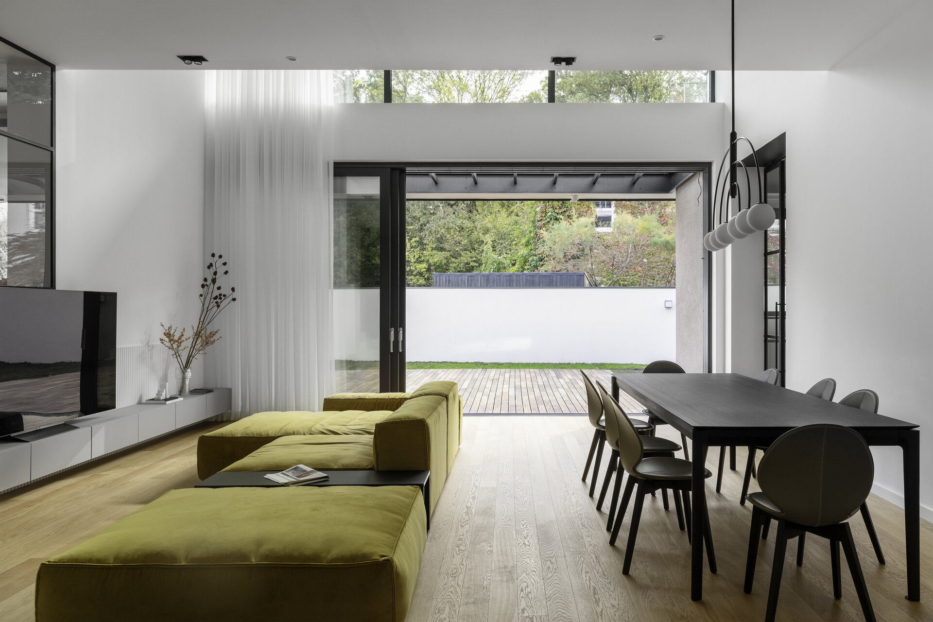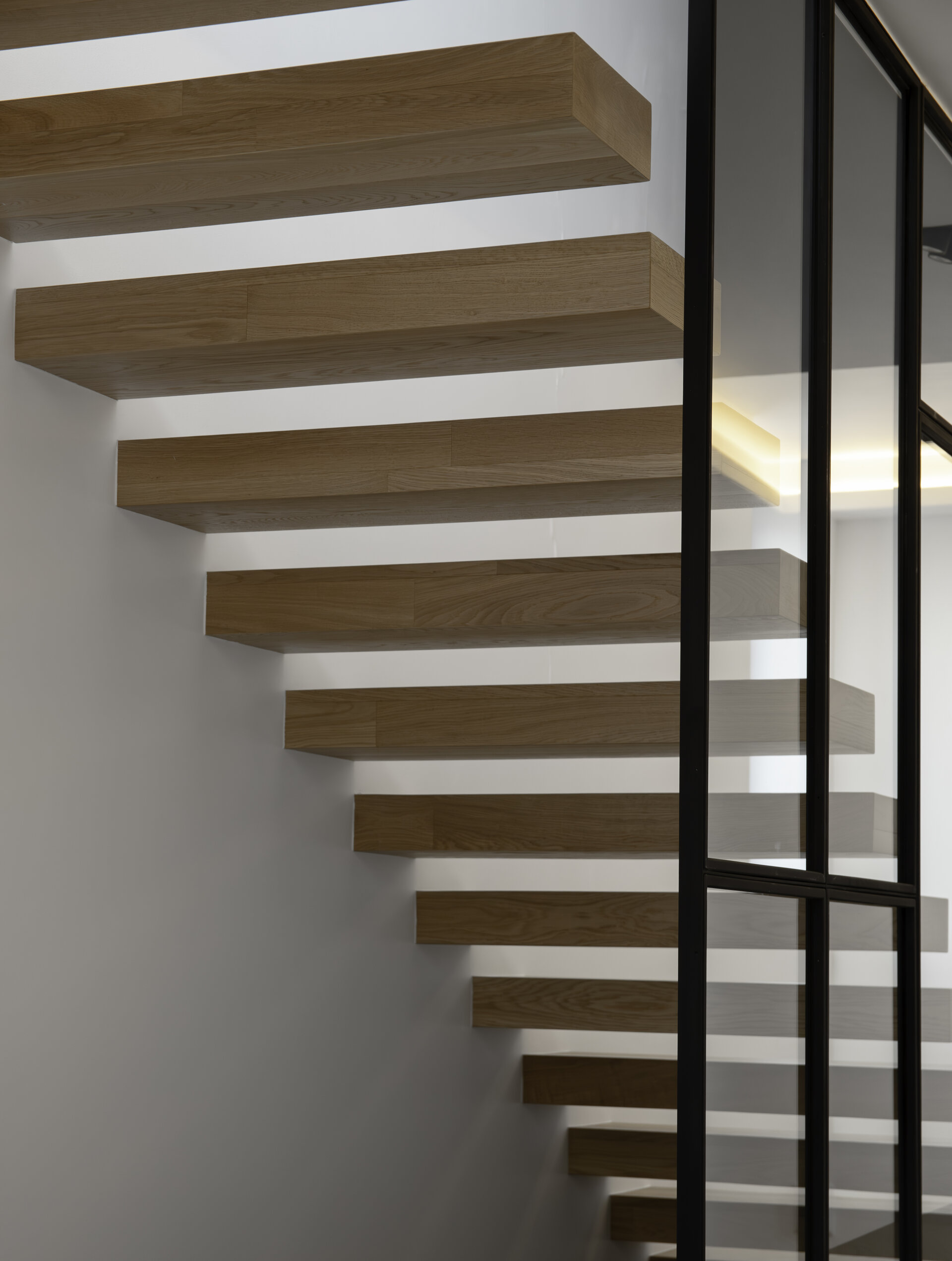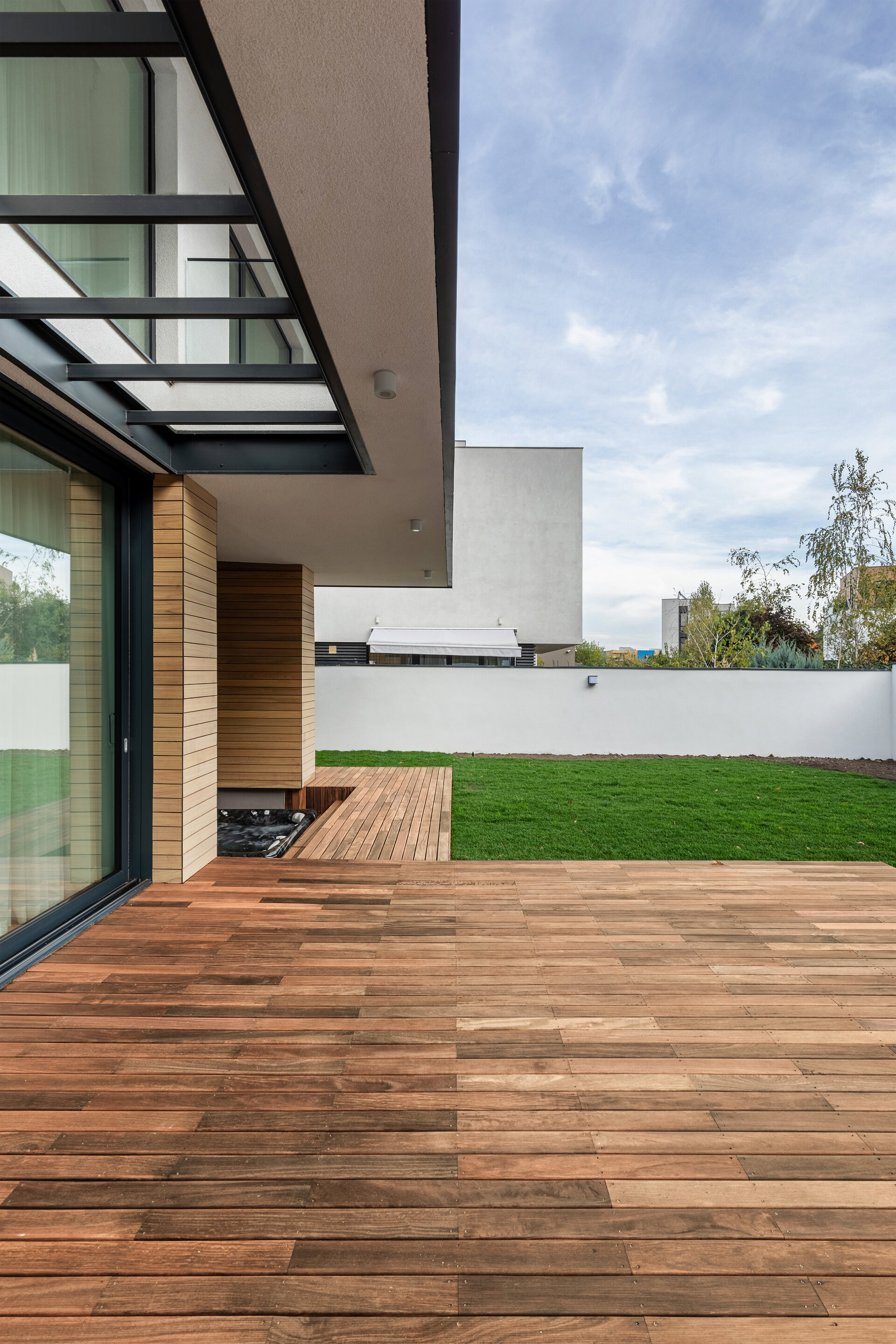 În final, amenajarea de interior este dominată de volumetrii simple și curate, iar din punct de vedere cromatic predomină albul, negrul și nuanțele de gri, realizându-se astfel o coerență între aspectul exterior și atmosfera interioară. Pardoseala finisată cu parchet stratificat apare ca un element complementar cu un plus de căldură în amenajare.