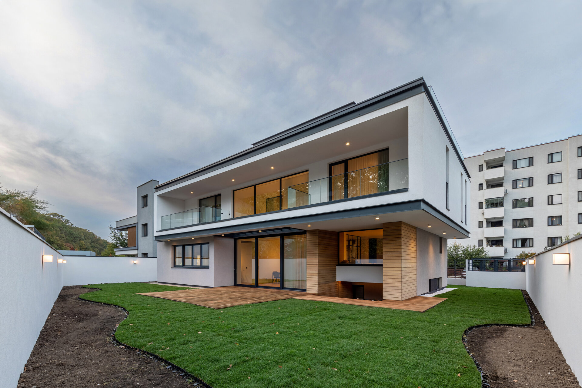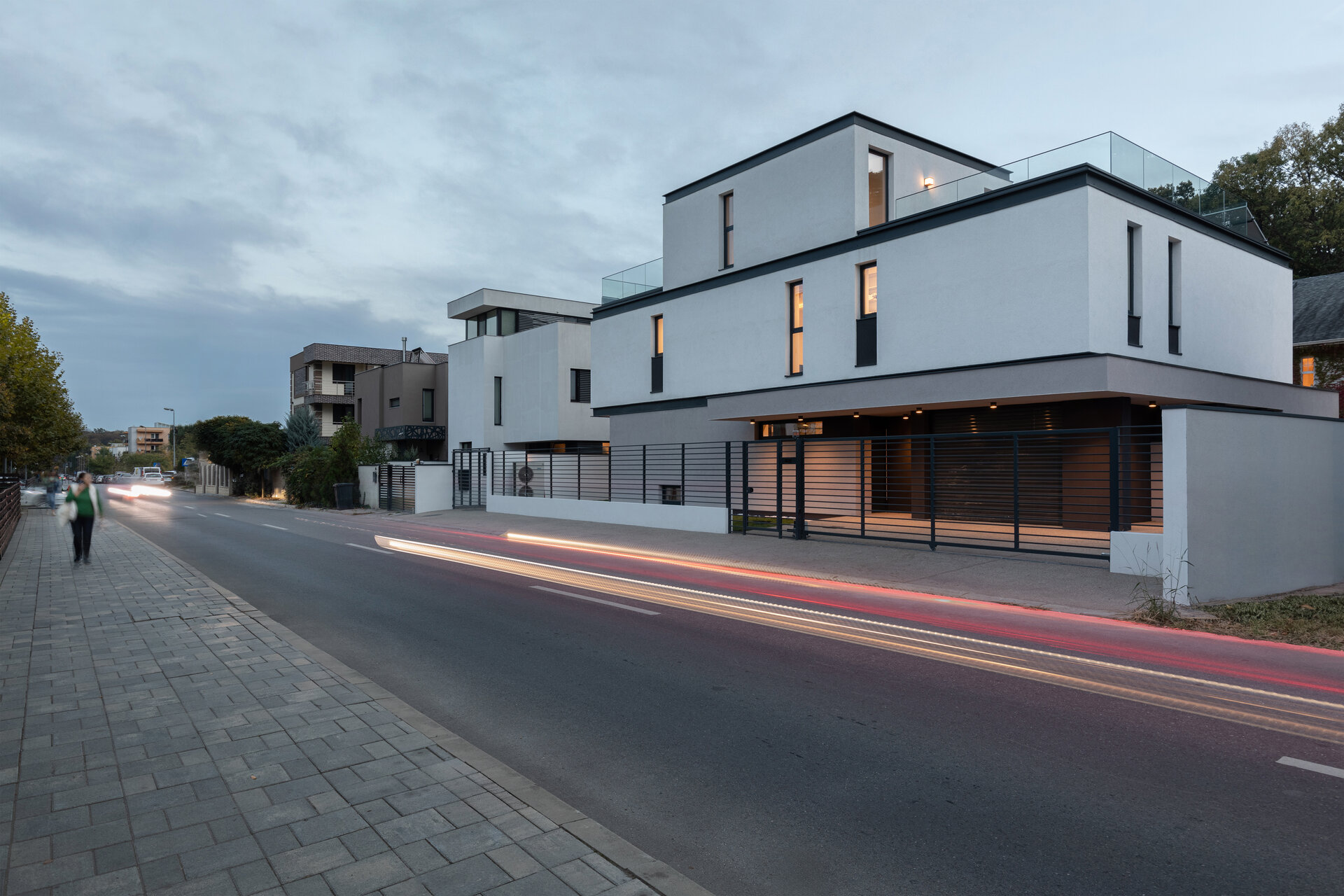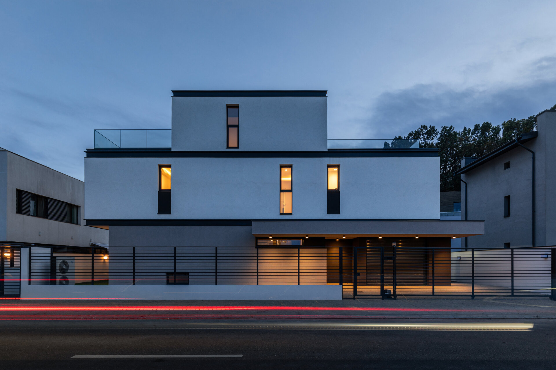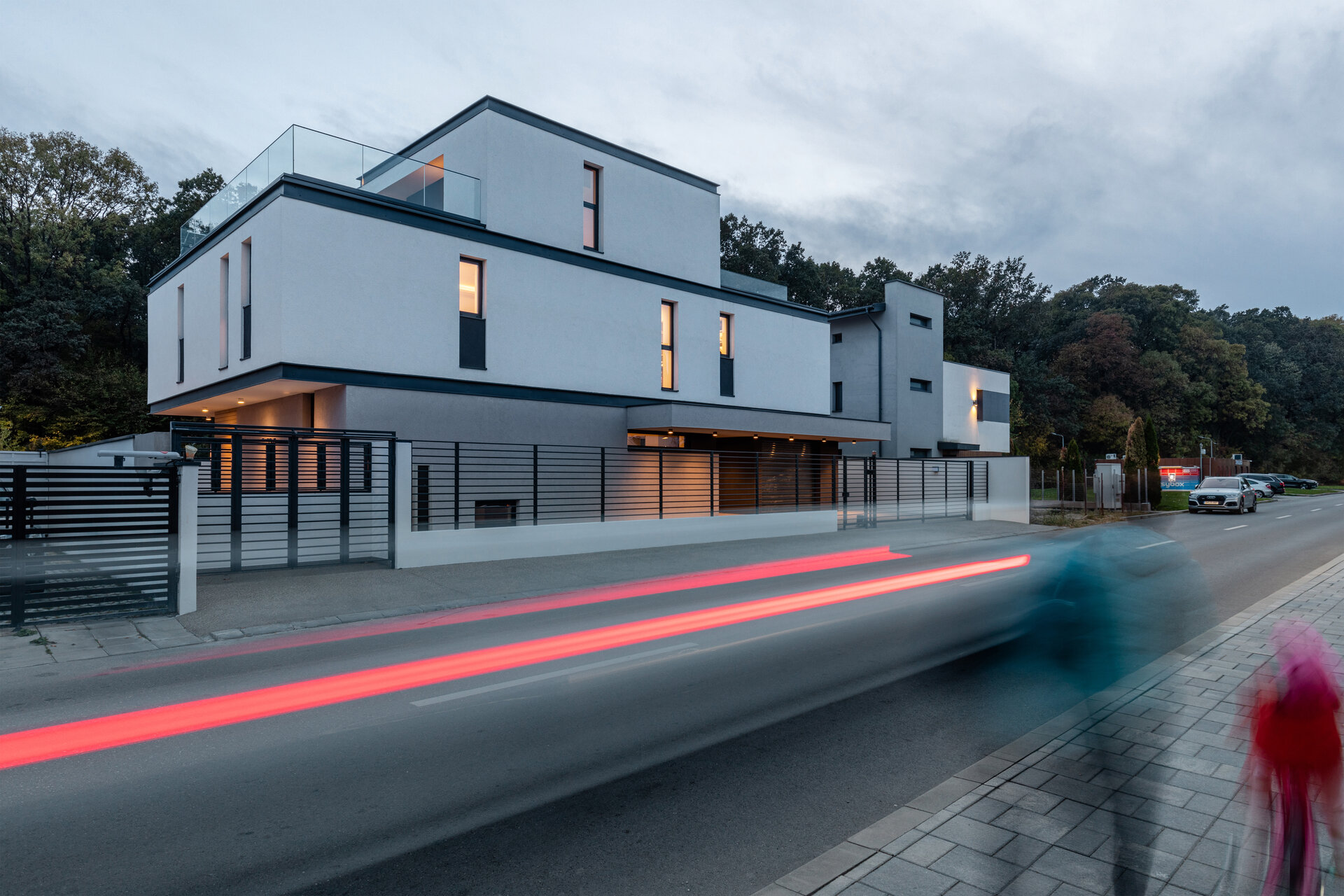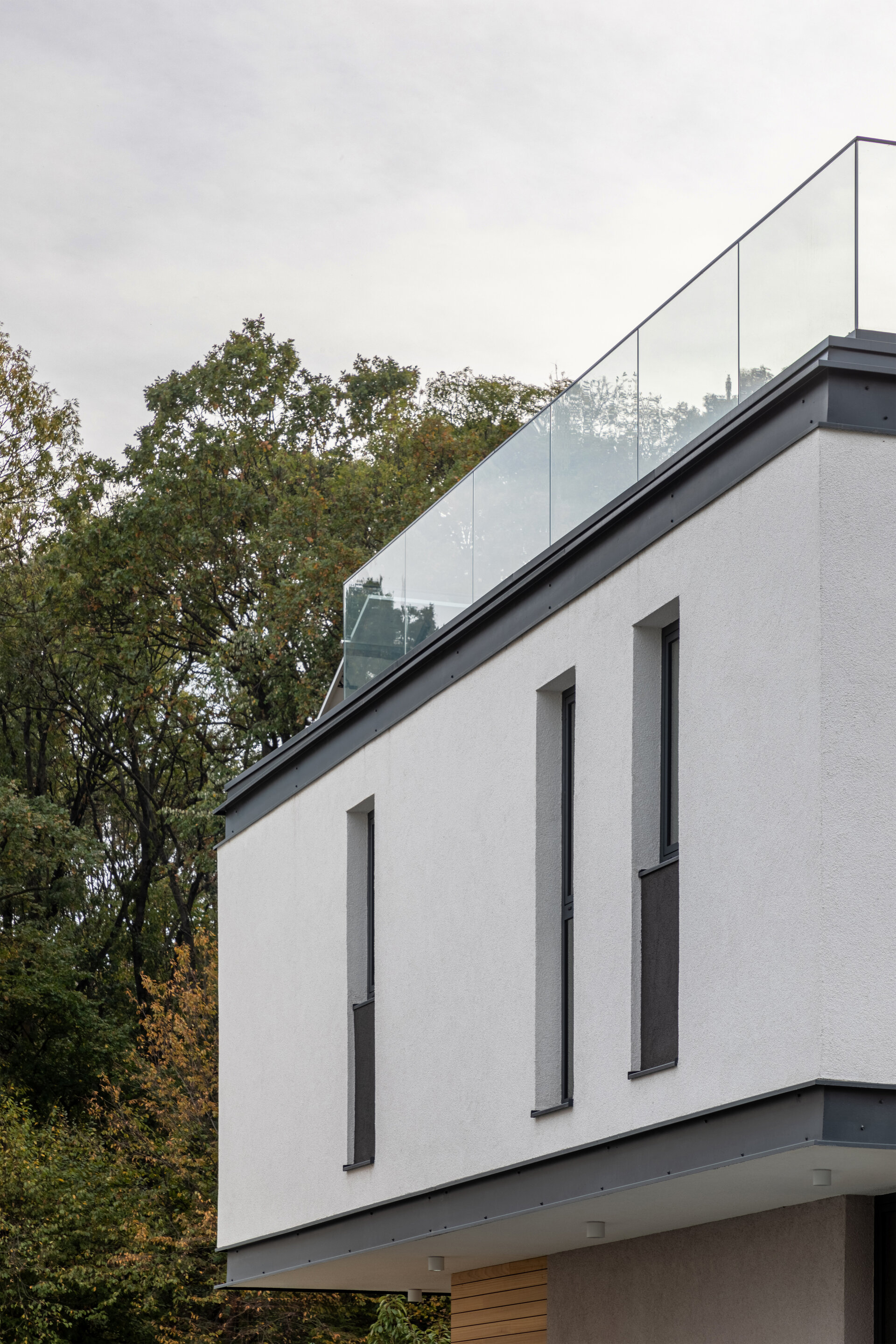 Astfel, volumul propus reprezintă îmbinarea funcțională și armonioasă a două tipuri diferite de fațadă: fațada nordică, cu orientare spre stradă, este o fațadă de tip introvertit, austeră, închisă, cu vitraje mici. Fațada sudică, dinspre curte cu deschidere spre pădure, este o fațadă de tip extrovertit, prevăzută cu vitraje supradimensionate care asigură o legătură puternică cu exteriorul. La nivel de finisaje, am urmărit o tratare selectivă a suprafețelor prin culori neutre și accente contrastante ca materialitate - lemn, metal. Parterul este tratat cu o tencuială decorativă gri și prezintă pe alocuri accente din lemn fapt ce conferă greutate compozițională a volumetriei propuse. Restul fațadei este finisată cu tencuială decorativă albă, cu accente metalice de detaliu (tâmplărie, glafuri) oferind astfel un contrast plăcut cu parterul. În completarea acestui aspect, pe fațada de sud etajul 1 iese în consolă, realizându-se astfel o detașare și mai puternică între primele două niveluri. Prin utilizarea acestor console, atât peste parter cât și peste etajul 1, se realizează controlul solar pentru vitrajele supradimensionate dinspre curte. Etajul 2, un etaj retras, se percepe doar dinspre stradă, fiind retras de la fațada sudică. Astfel este generată o terasă la etajul 2 care are aceeași orientare sudică și oferă o perspectivă utilizatorului către pădure. Nu în ultimul rând, menționăm elementele tip profil „C” care se regăsesc pe fațadă și marchează nivelurile clădirii. Aceste profile ne-au permis să facem trecerea dintre două materiale sau dintre două culori distincte în același plan al fațadei.