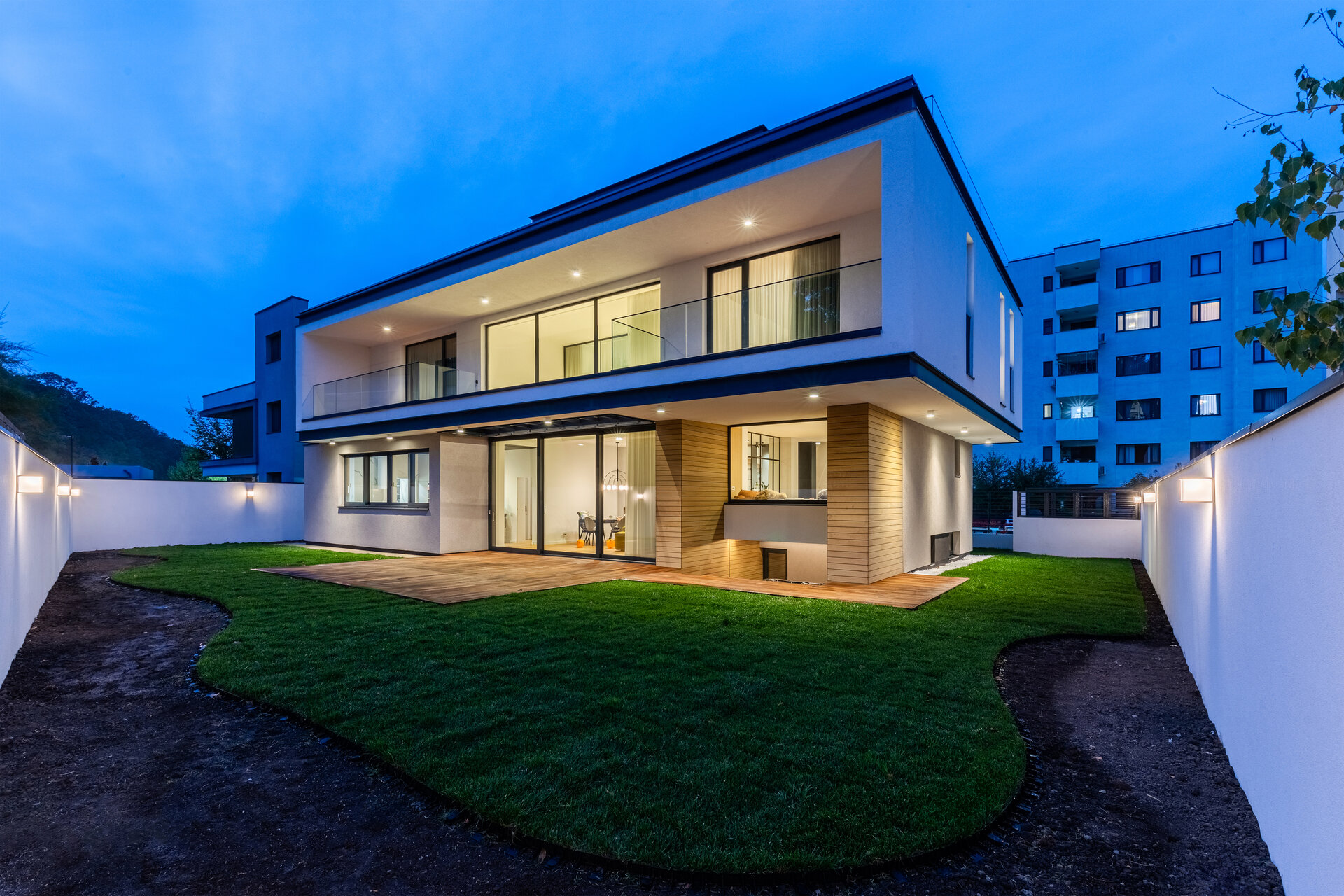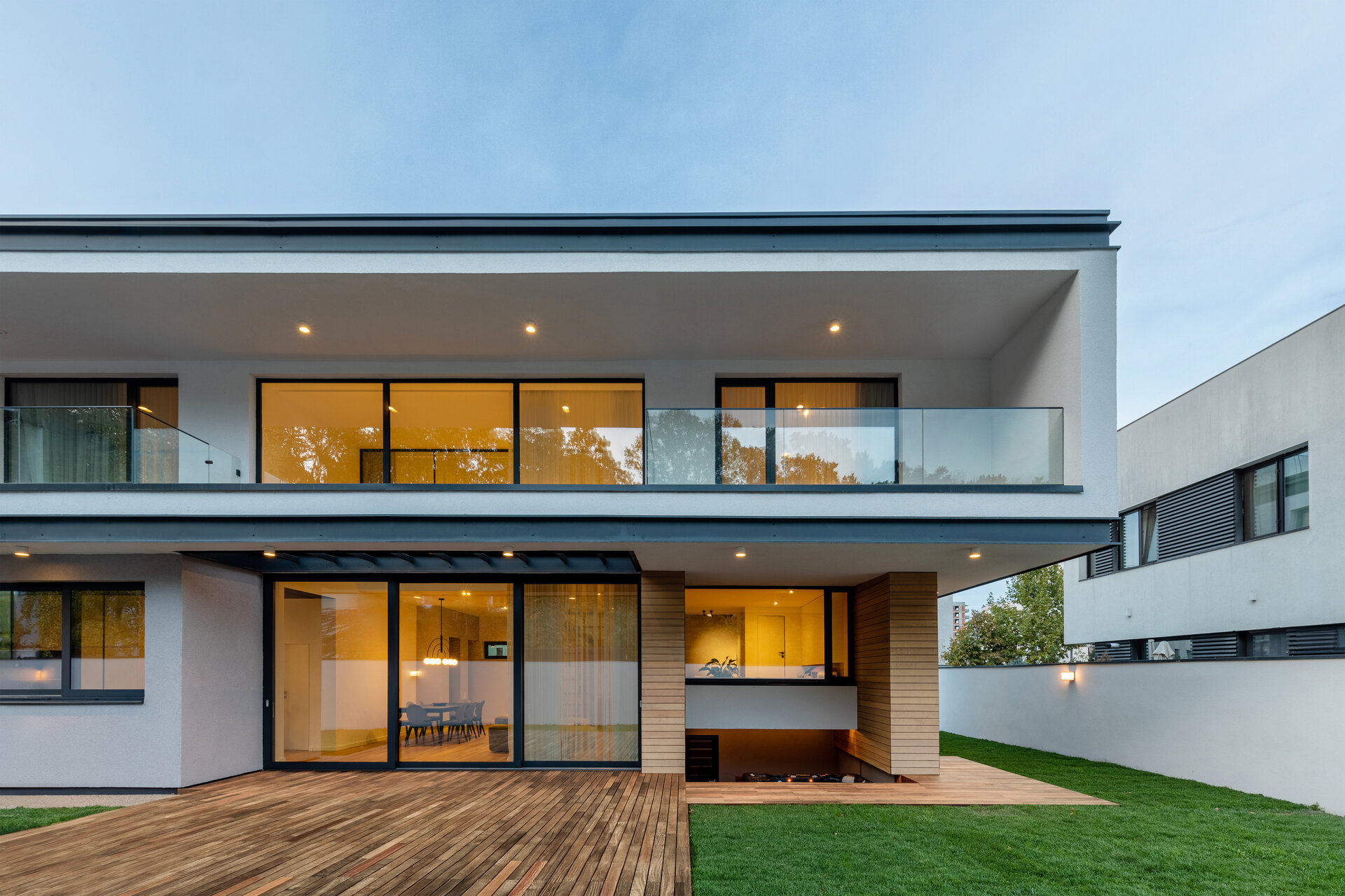 Parterul este dedicat zonei de zi, cu bucătăria amplasată în imediata vecinătate a accesului principal, iar zona de living-room / dining-room este poziționată în centrul partiului, fiind deschisă pe dublă înălțime. La etaj sunt poziționate două dormitoare, fiecare cu baie și dressing proprii și un birou. Toate încăperile au deschiderea către sud, biroul având o perspectivă și peste zona de zi. La ultimul etaj se află o cameră de zi, denumită și cameră de hobby care poate fi utilizată și ca un al doilea birou.