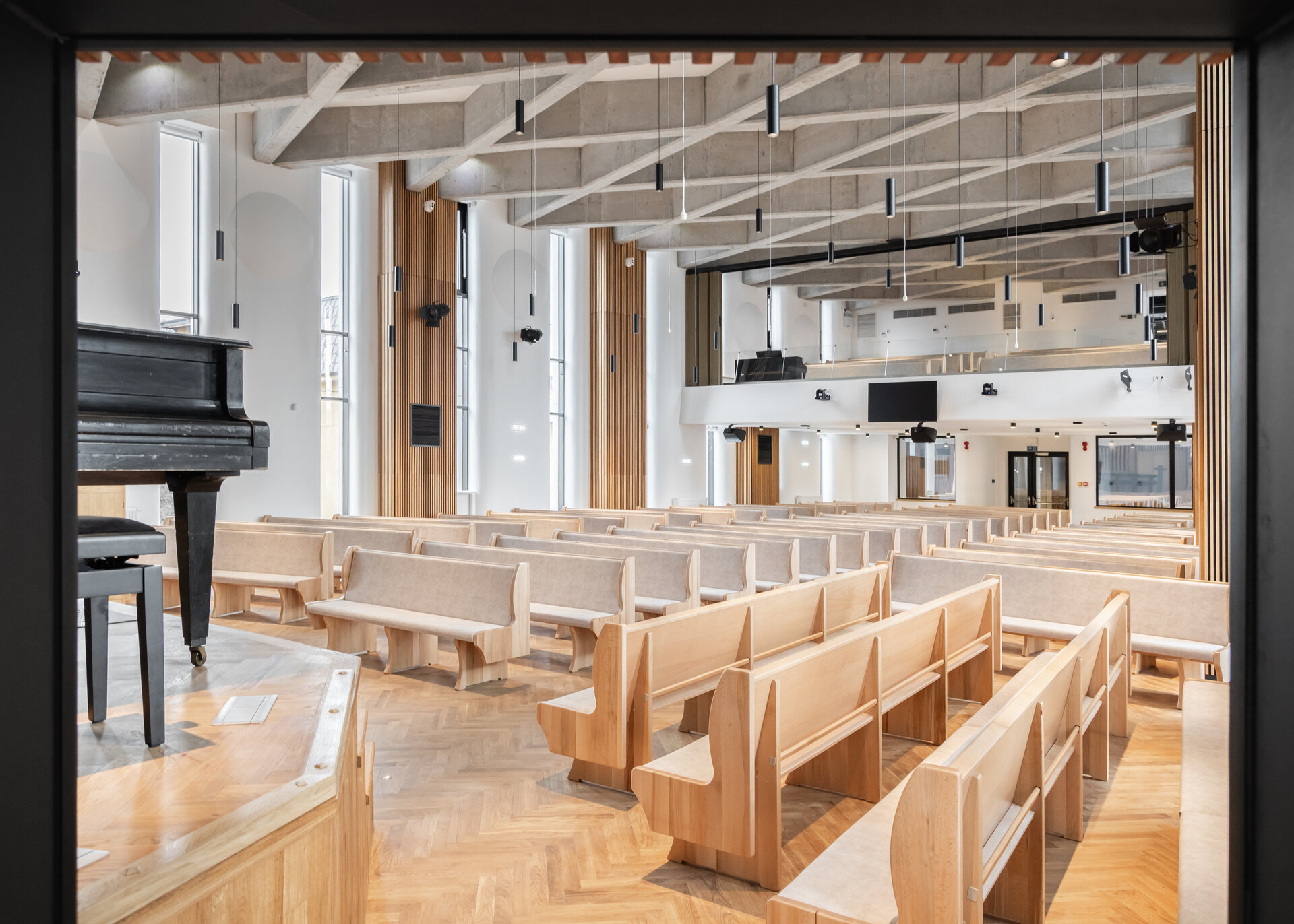 Sala bisericii este inima clădirii și găzduiește o orgă realizată din piese istorice recuperate, restaurate de unul dintre puținii meșteri specializați rămași în România. Acustica a fost proiectată pentru a permite utilizări diverse: liturghii, concerte, conferințe, festivități școlare. Balconul poate fi compartimentat separat ca amfiteatru.