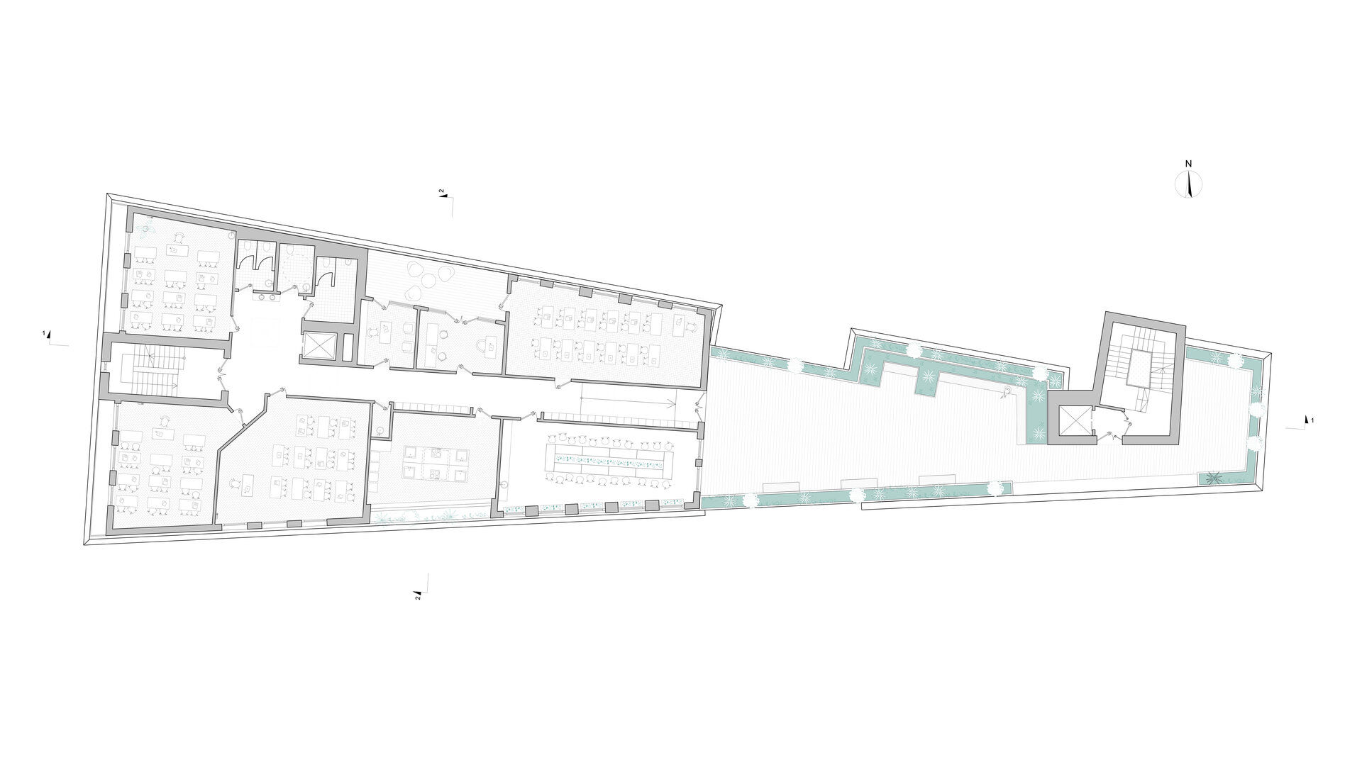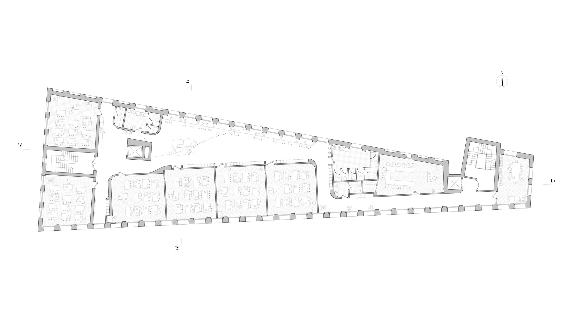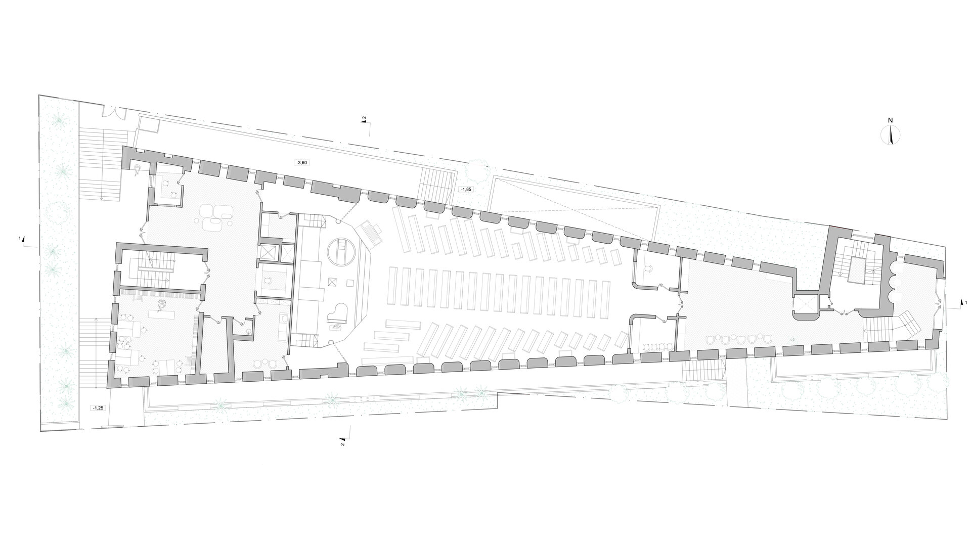Structura clădirii răspunde unei provocări majore: peste sala de mari dimensiuni, fără stâlpi interiori, de la parter, s-au suprapus trei niveluri funcționale. Pentru susținerea acestora s-au utilizat plăci post-tensionate, iar peste sală s-a realizat un tavan casetat din beton aparent, cu grinzi care devin și elemente definitorii pentru atmosfera sălii, prin ritm, profunzime și textură. Etajul 3 este din structură metalică ușoară, pentru a reduce sarcinile.