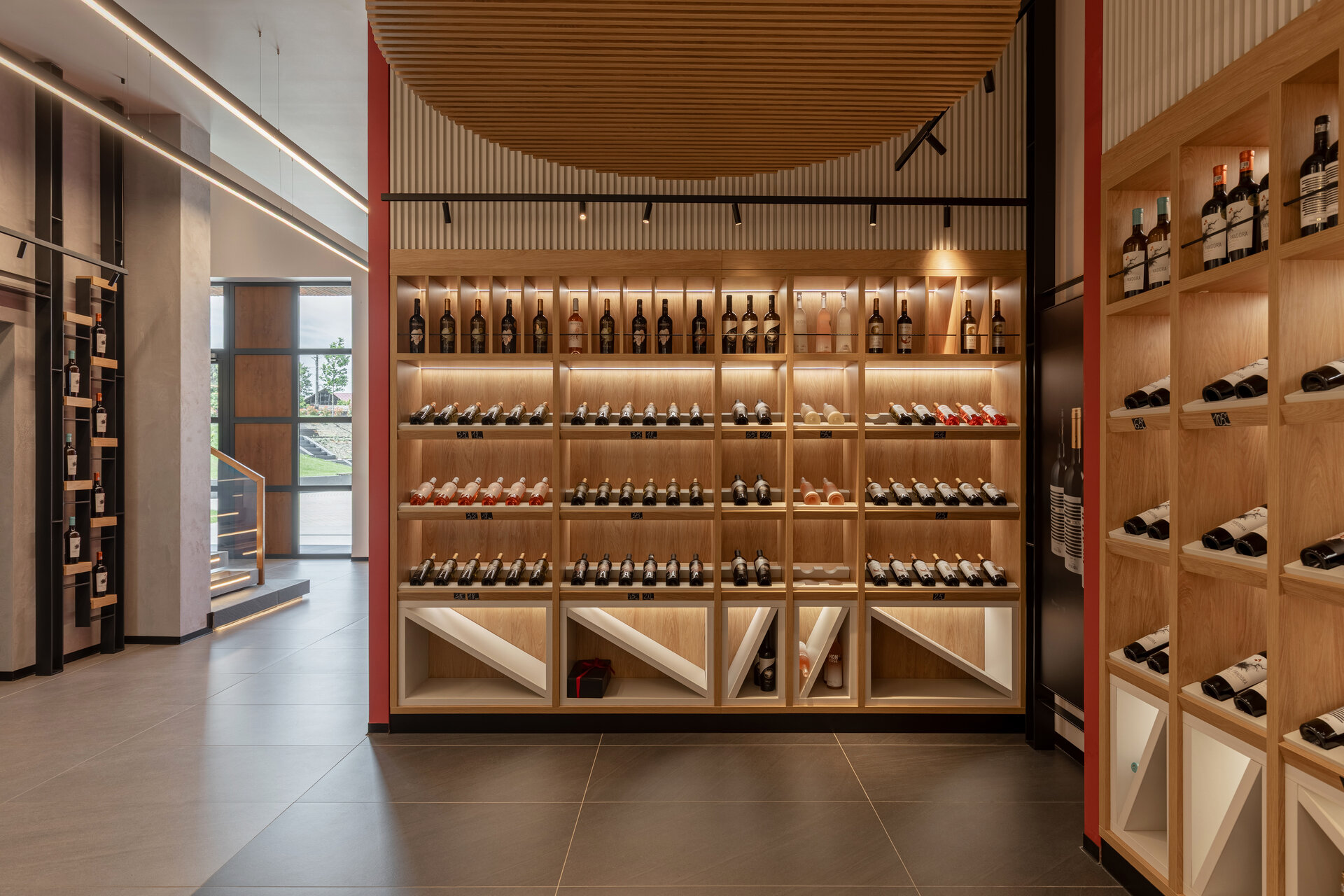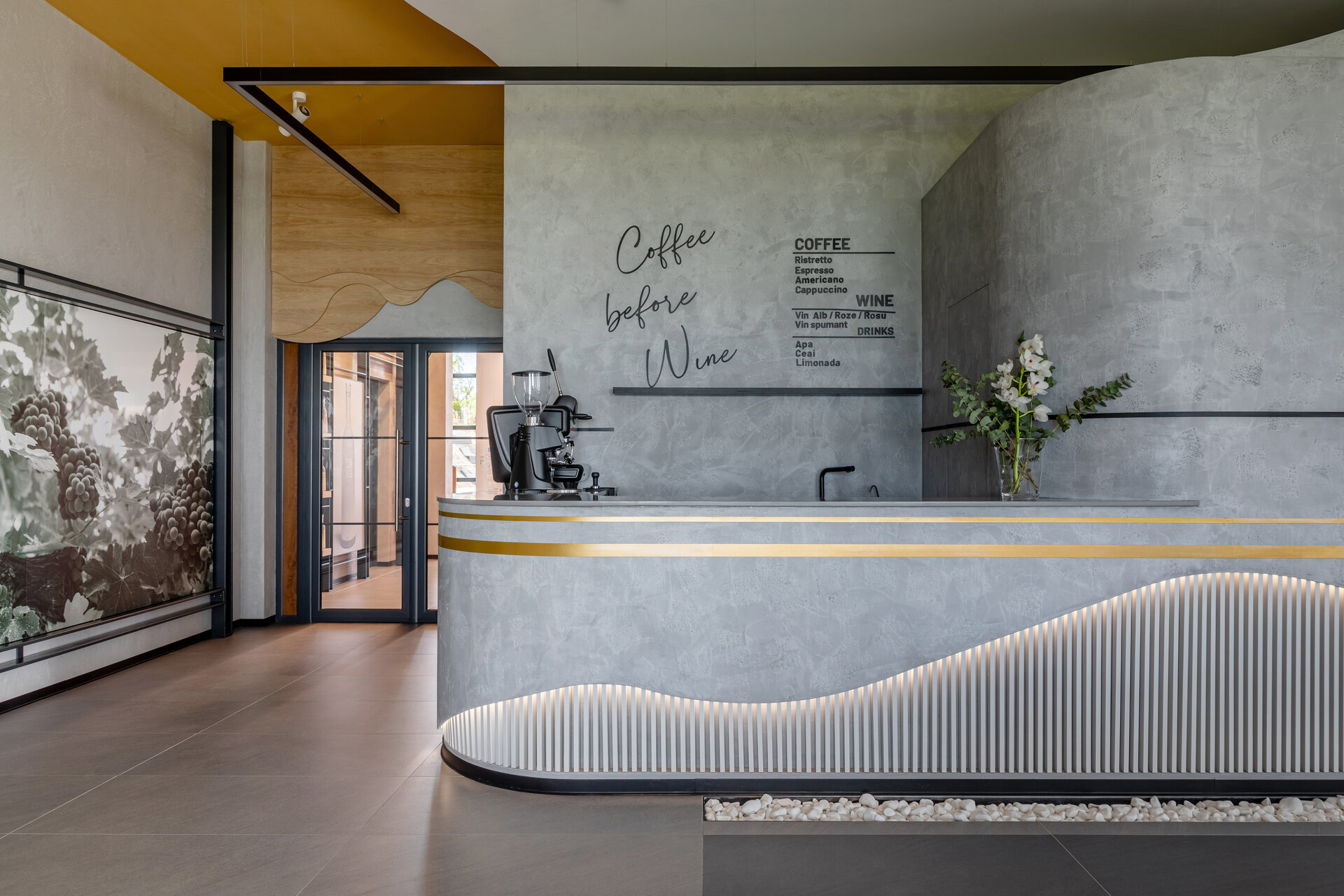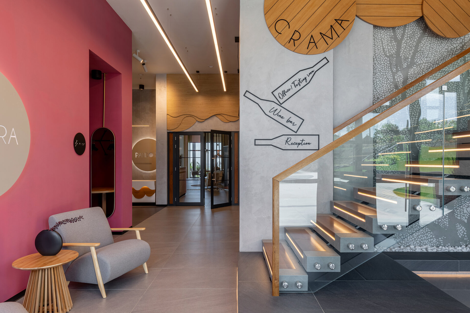 Semnalistica este integrată arhitectural, devenind parte activă a compoziției. Grafica direcțională și elementele de branding sunt aplicate cu discreție, prin inserții subtile care comunică identitatea vizuală fără a perturba limbajul spațial. Logo-ul cramei este amplasat strategic în trei zone cheie – recepție, shop și sala de degustare – fiind accentuat prin discuri luminoase care evocă forma sticlei de vin.