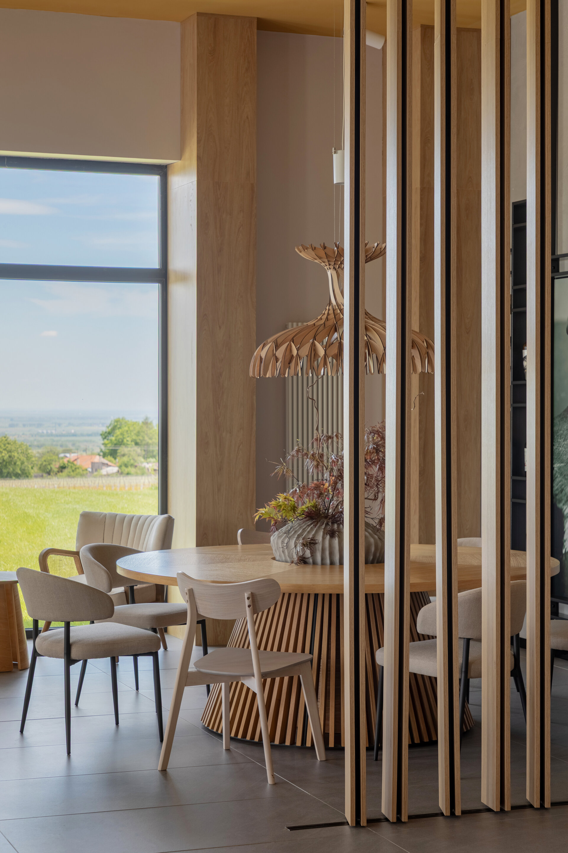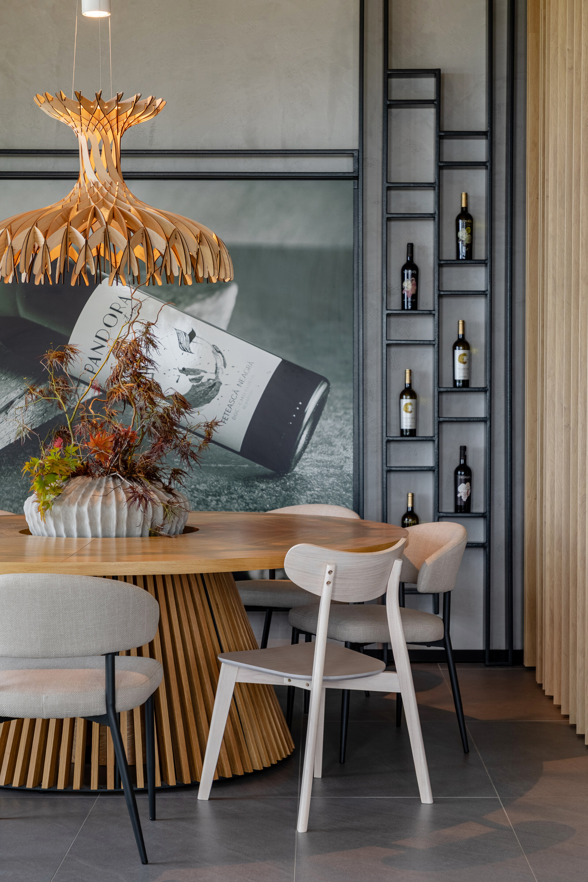 Sala principală de degustare, amplasată la etaj, este organizată în jurul unei mese ovale, ce devine piesa centrală a amenajării. Spațiul este calibrat pentru interacțiune, cu un design sobru și cald, în care iluminatul direcționat evidențiază textura materialelor. Lemnul natural, metalul vopsit în negru mat și ceramica de mari dimensiuni definesc un ambient sofisticat, în care designul susține experiența oenologică.