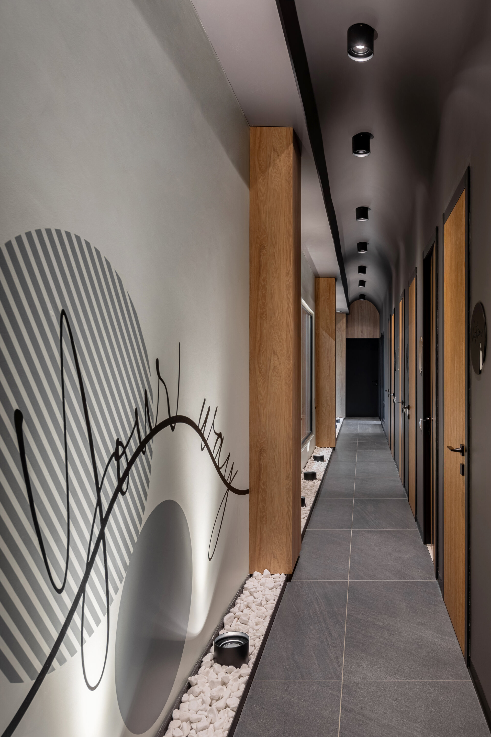 Paleta cromatică este inspirată de tonurile vinurilor: griuri calde, nuanțe pământii, accente de roz ciresiu, galben auriu și roșu cărămiziu. Iluminatul suspendat și corpurile direcționale compun volumele și pun în valoare textura suprafețelor, contribuind la definirea unei atmosfere rafinate și intime. Tehnologia LED cu temperaturi de culoare calde accentuează profunzimea vizuală creând o ambianță primitoare.
