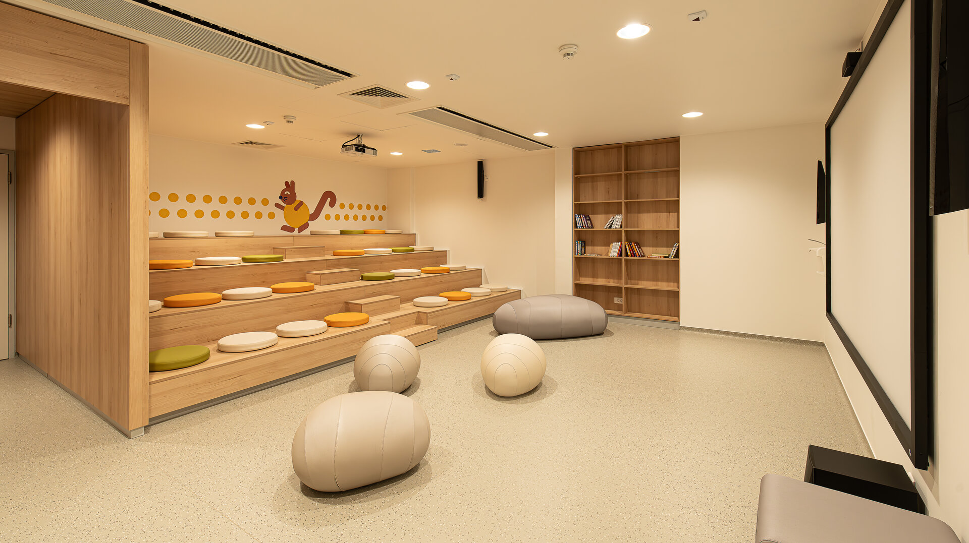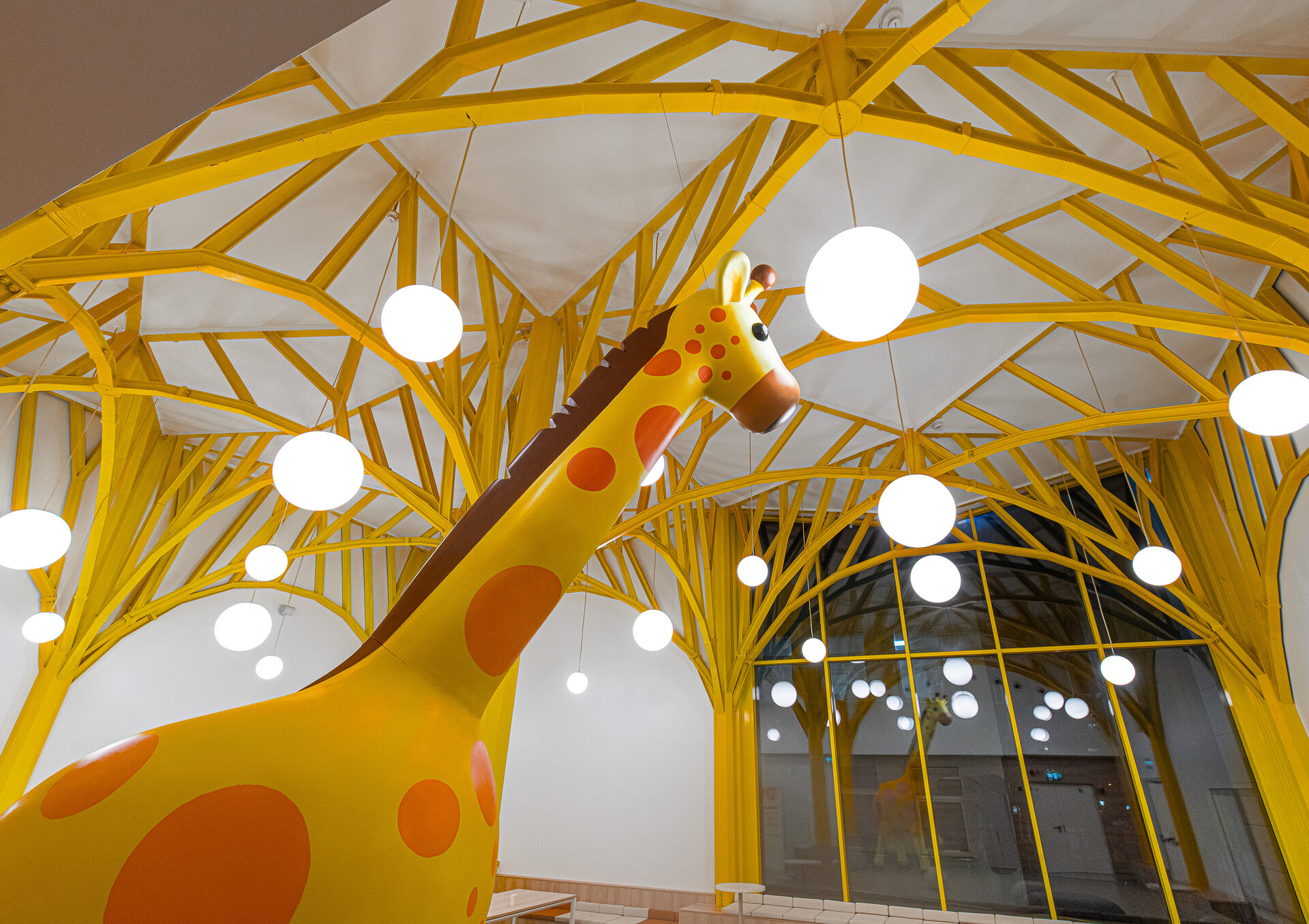 Mai sus, zona trunchiului, cuprinzând mezaninul și etajele 1 și 2, este asociată broaștei țestoase, struțului și girafei, simboluri ale stabilității, longevității și creșterii treptate. Aceste etaje adăpostesc secțiuni importante ale spitalului, conferind o imagine de forță și dezvoltare. Zona crengilor, situată la etajul 3, este populată de veverițe, creaturi care reflectă dinamismul și energia, creând o atmosferă vibrantă.