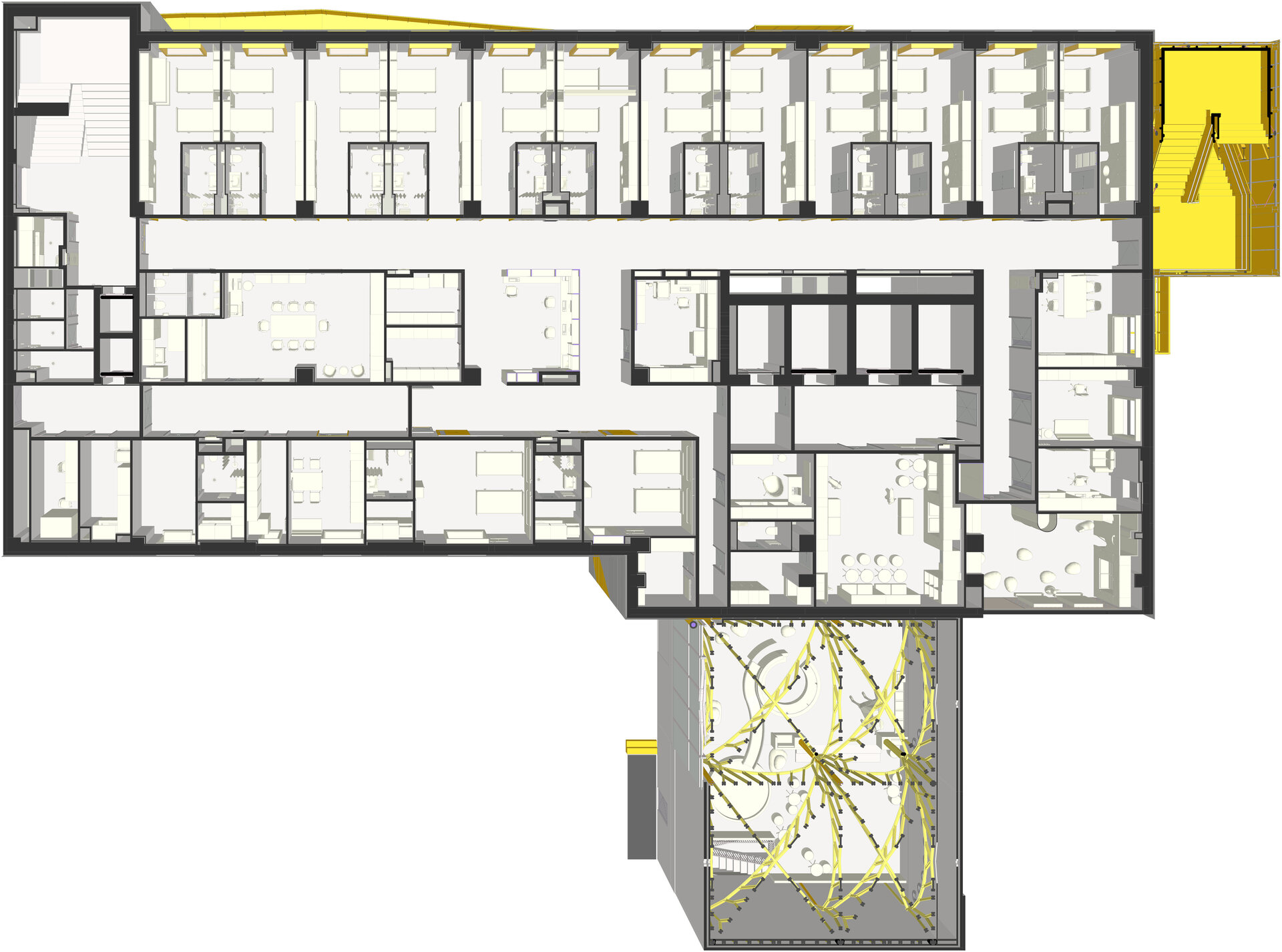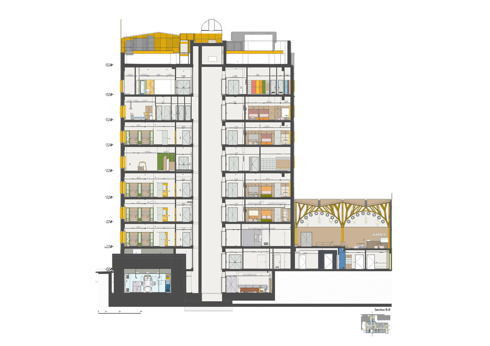 Această poveste arhitecturală capătă cea mai clară formă în zona lifturilor, unde designul luminilor ilustrează vizual conceptul fiecărui nivel, oferind o experiență senzorială și emoțională profundă. Astfel, „Copacul Vieții” devine nu doar un concept arhitectural, ci și un ghid simbolic care însoțește pacienții și vizitatorii pe drumul lor către vindecare.