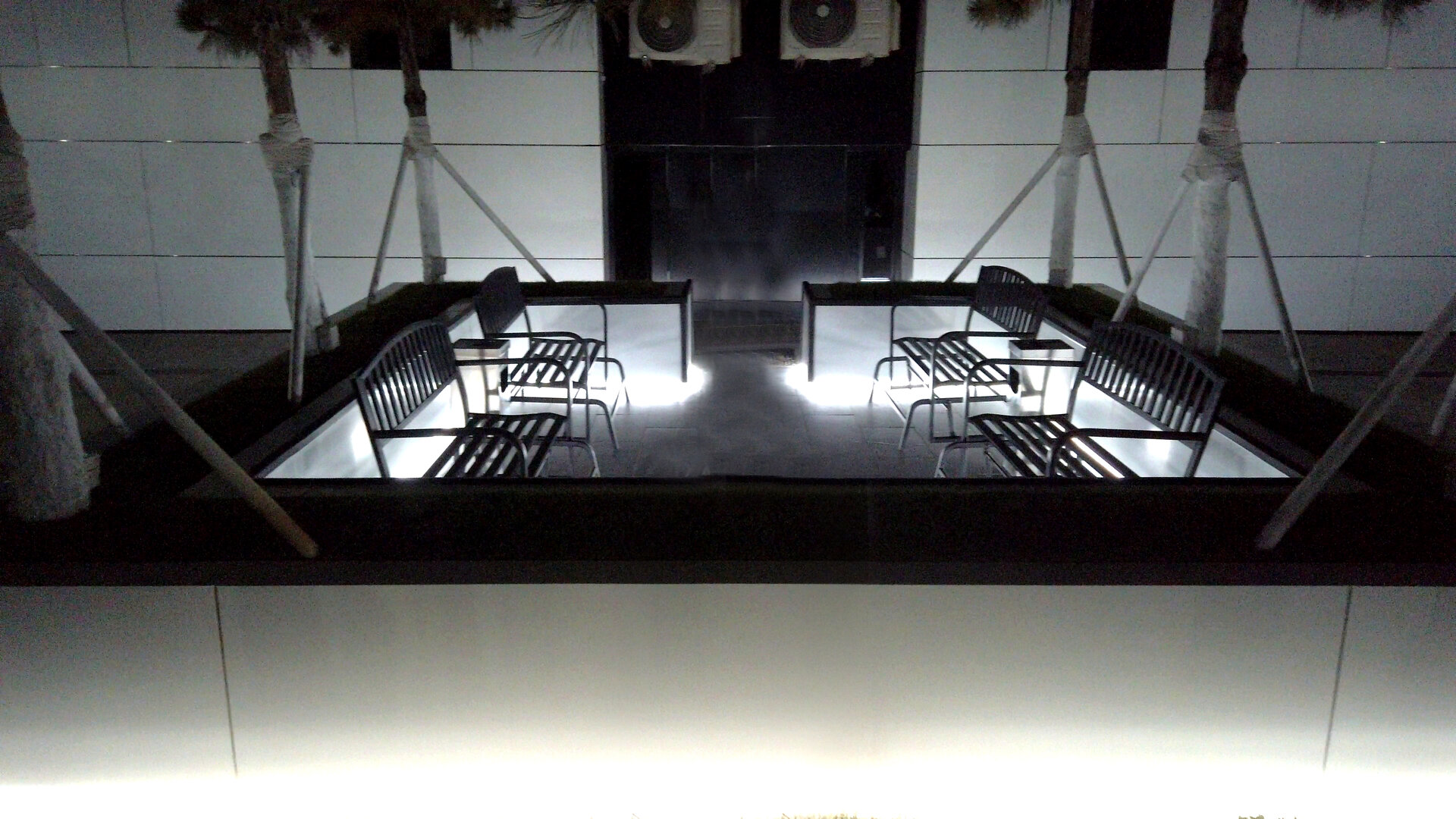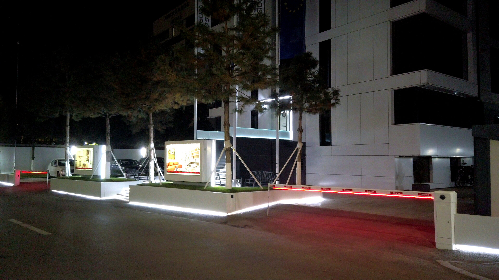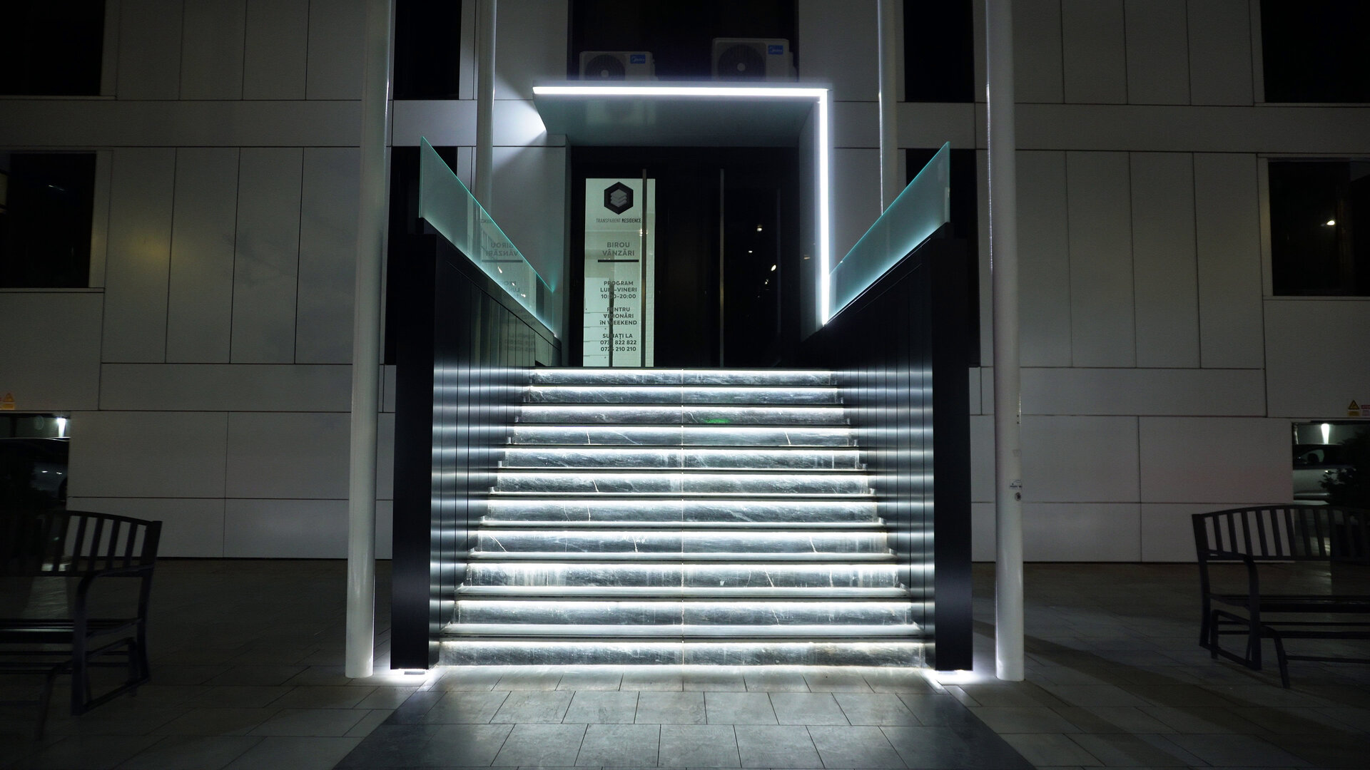 Intrarea in ansamblu beneficiază de o piațetă de acces compusă din jardiniere de alucobond alb cu iluminare LED perimetrală în partea inferioară. si zone de loisir. Vegetația integrată aduce un strat de natură într-un fundal predominant mineral (marmură), iar două display-uri LED încorporate în jardiniere transformă spațiul într-un punct de informare și identitate vizuală. Accesul este marcat de o scară monumentală iluminată, încadrată de un cadru arhitectural cu LED, oferind o intrare spectaculoasă și contemporană.