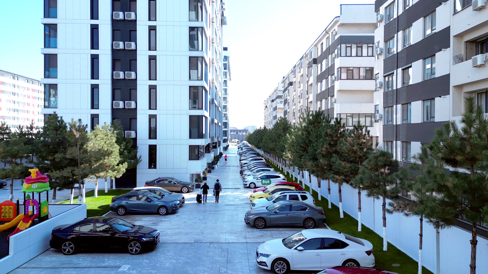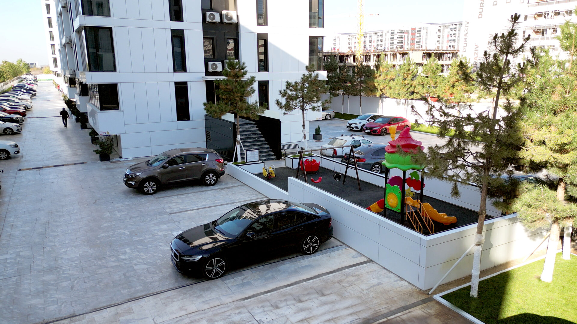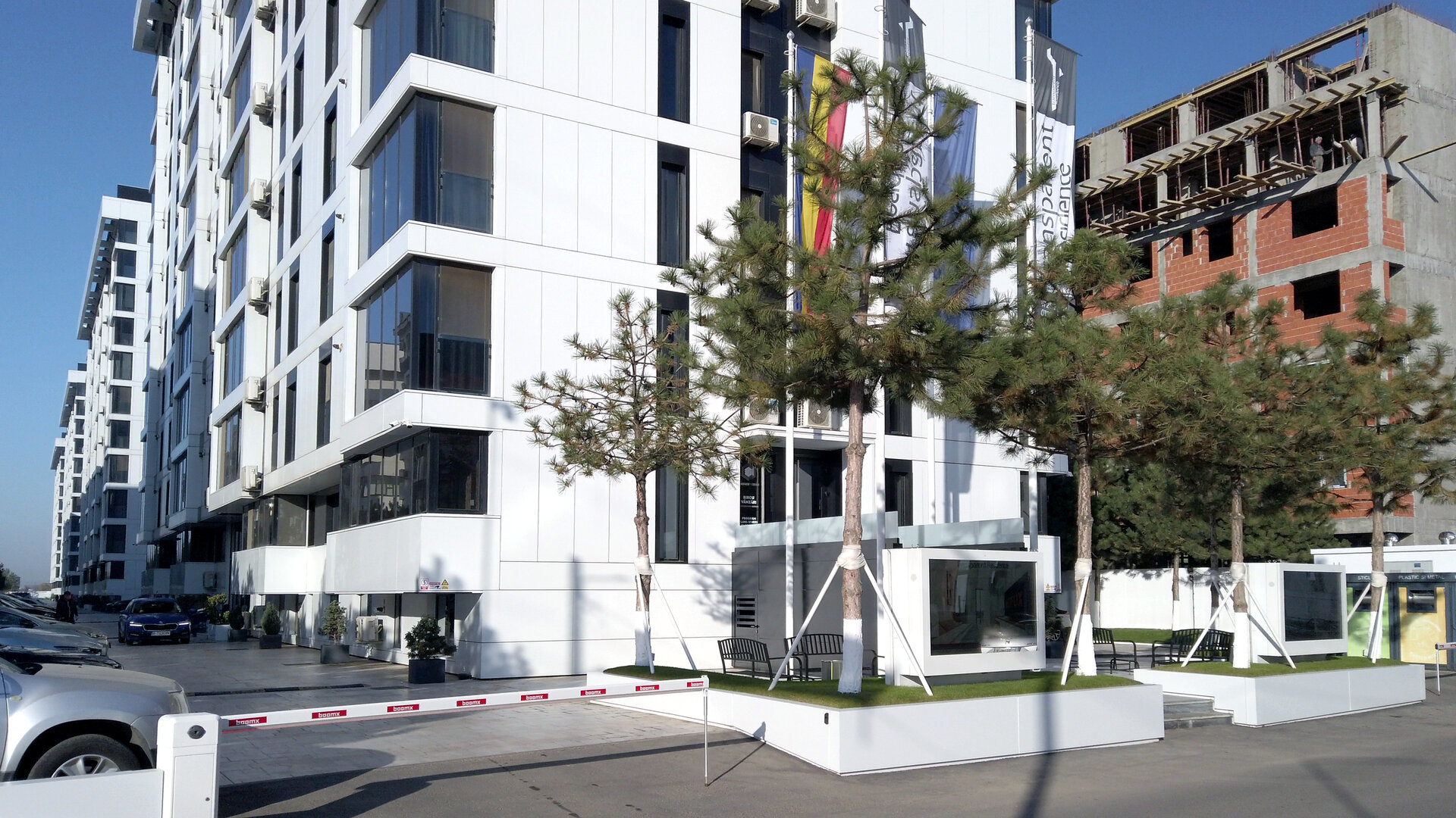 Elementele de alucobond, regăsite atât în zonele publice cât și pe fațadele ventilate ale clădirilor, creează o coerență vizuală clară, poziționând ansamblul ca o dezvoltare urbană de calitate superioară. Spre deosebire de abordările uzuale din zonă, acest proiect se distinge prin investiții semnificative în spațiul public, punând accent pe confortul cotidian, estetică și funcționalitate integrată.