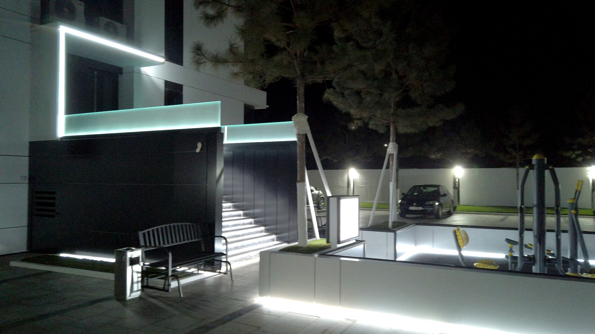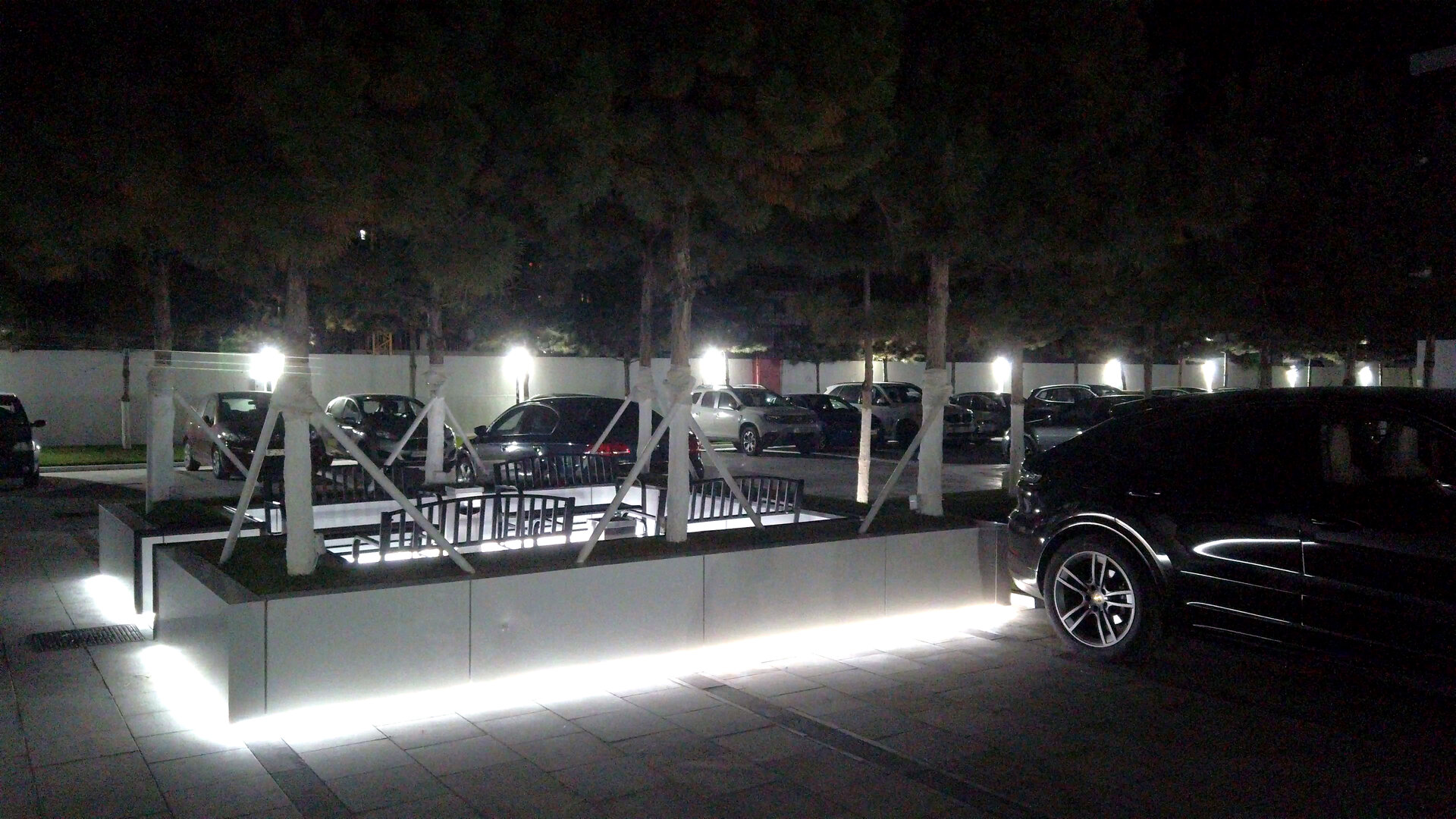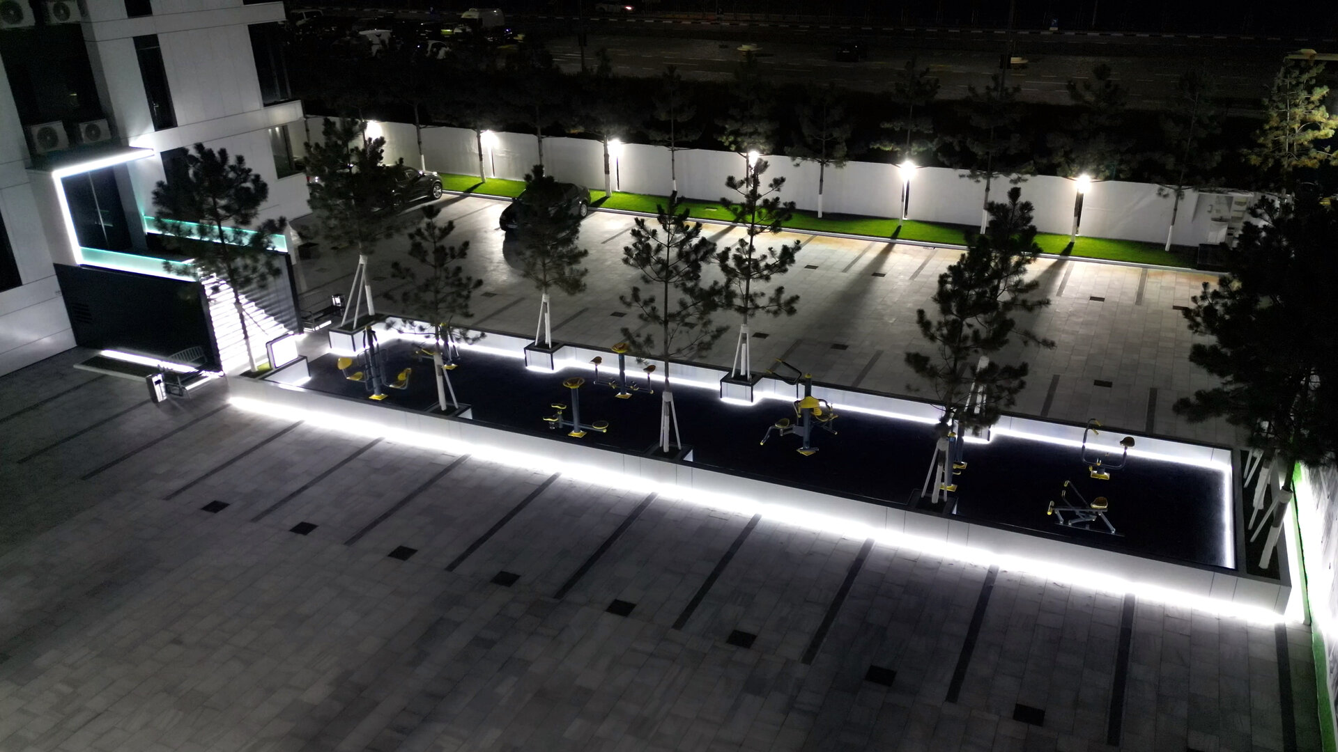 Pavajul întregii curți este realizat din marmură naturală, oferind o imagine unitară, elegantă și premium. Întreg perimetrul ansamblului este bordat de brazi plantați ritmic, care adaugă structură vizuală și umbrire naturală. Iluminatul perimetral LED integrat în garduri și jardiniere conferă un efect nocturn spectaculos, transformând spațiul public într-o experiență vizuală coerentă pe timp de noapte.